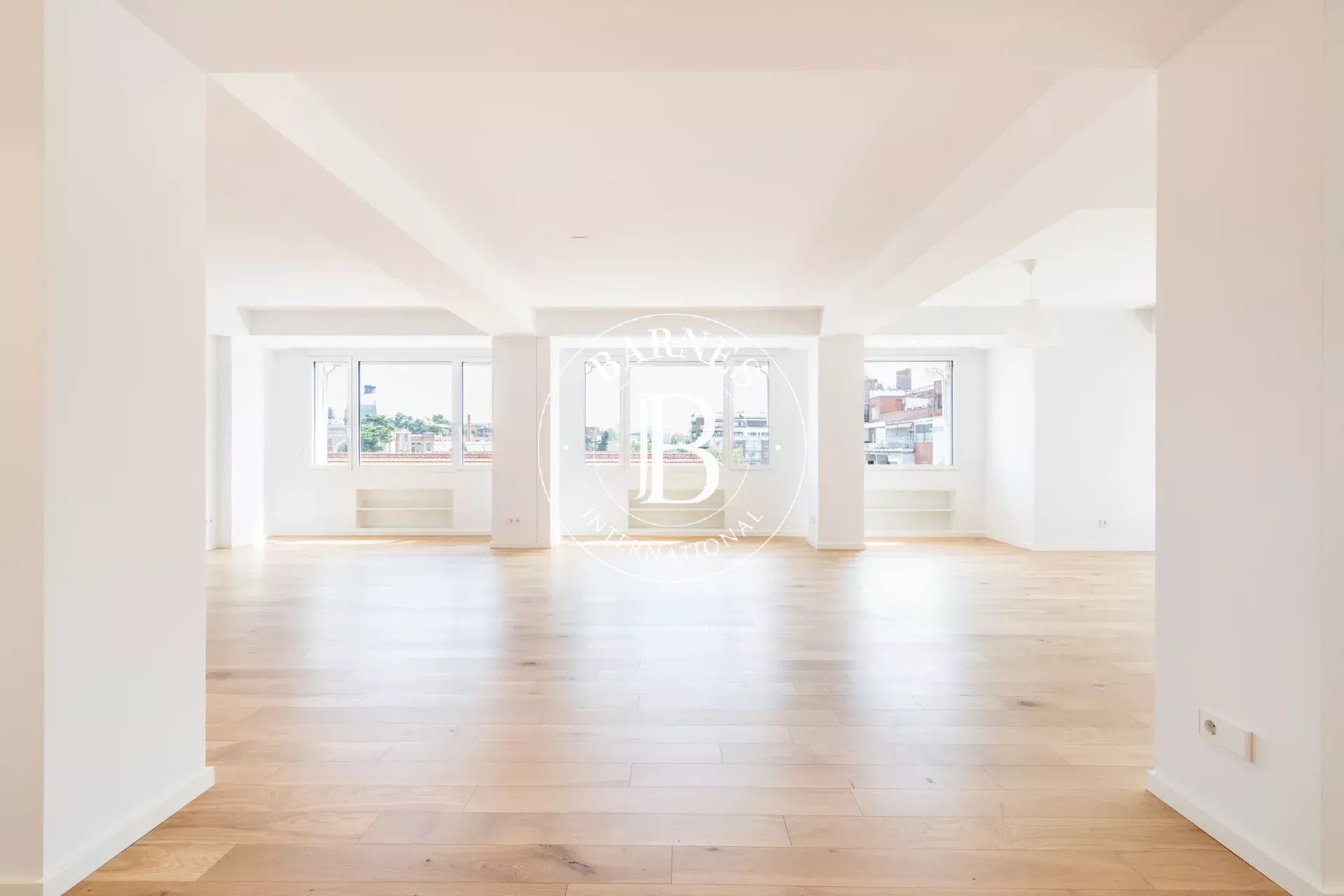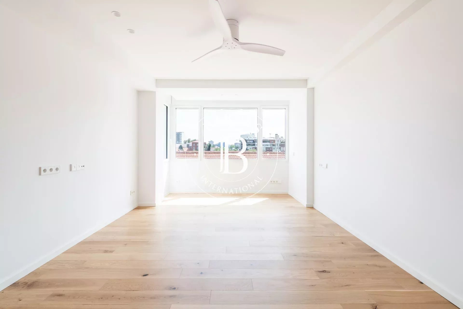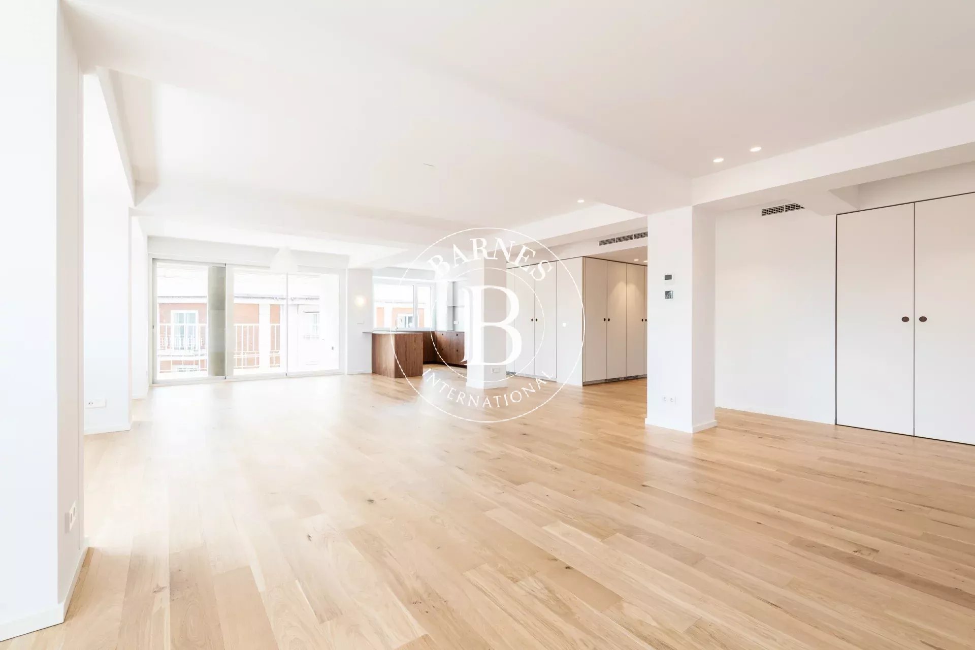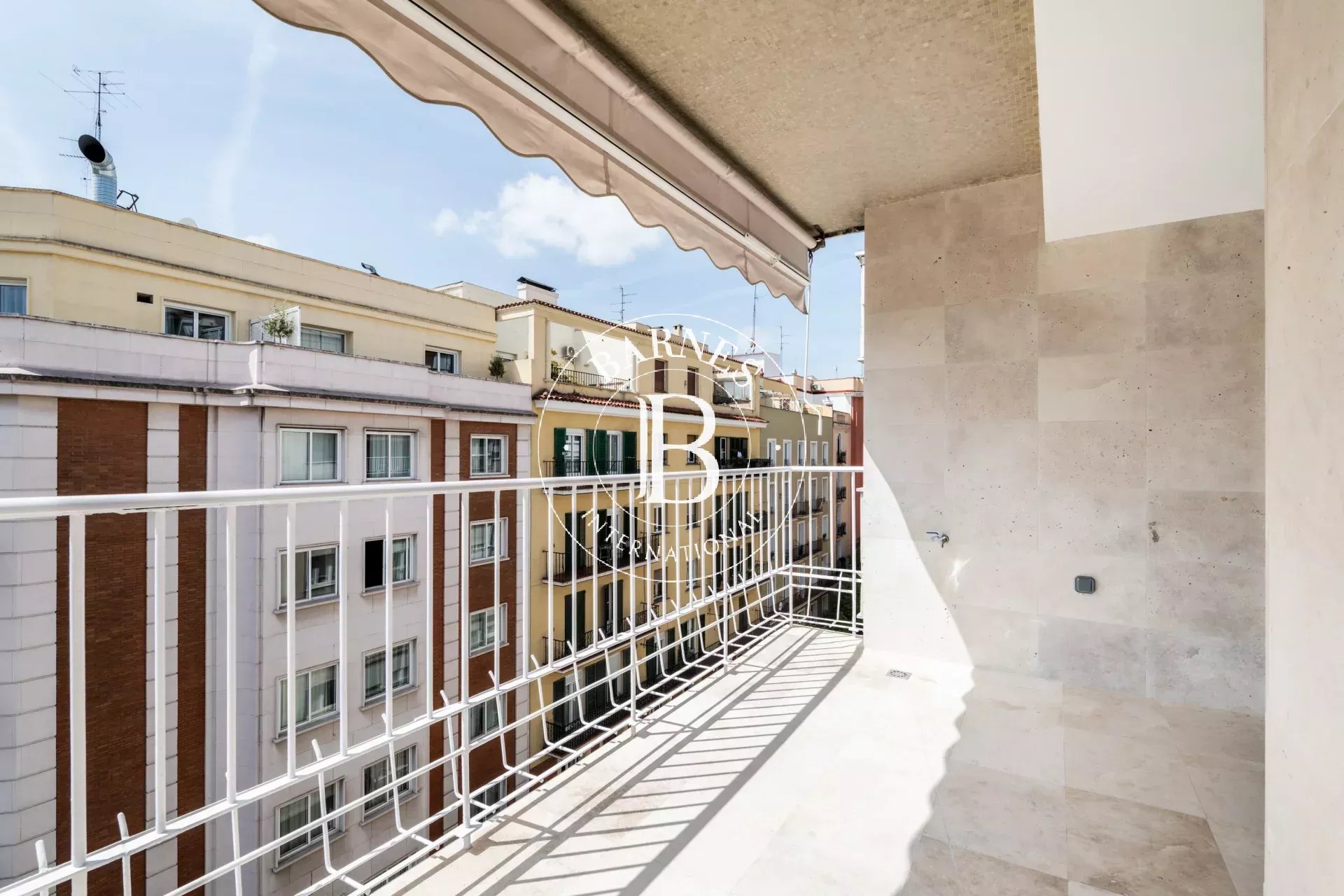 El gran salón-comedor disfruta de una magnífica orientación sur por una de sus fachadas y orientación oeste por la otra, permitiendo una extraordinaria entrada de luz natural durante todo el día. Ambas fachadas cuentan con toldos eléctricos, mientras que la amplia terraza — perfecta para una mesa de hasta seis comensales — ofrece un espacio ideal para disfrutar del skyline madrileño y de los atardeceres sobre los tejados de la capital.