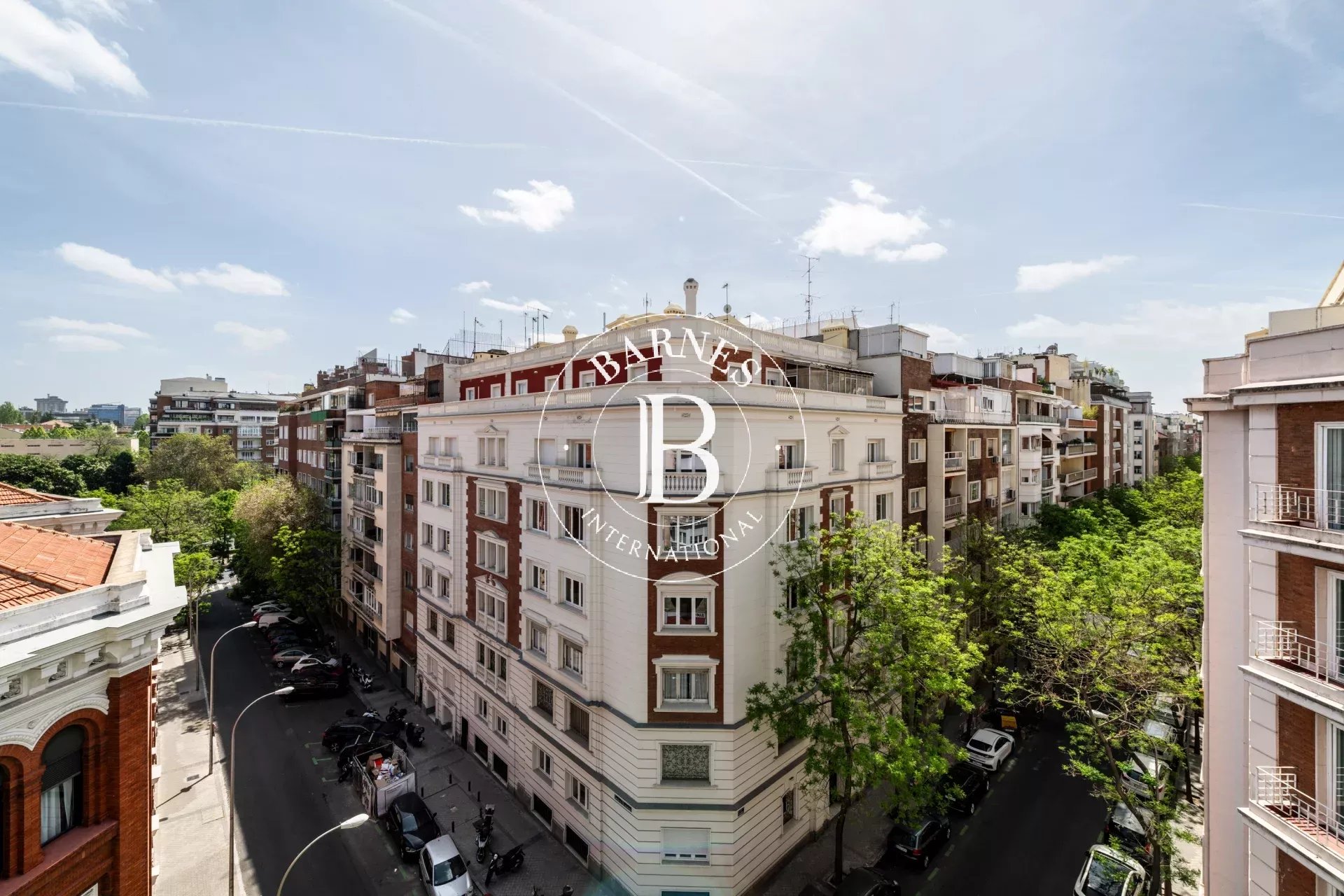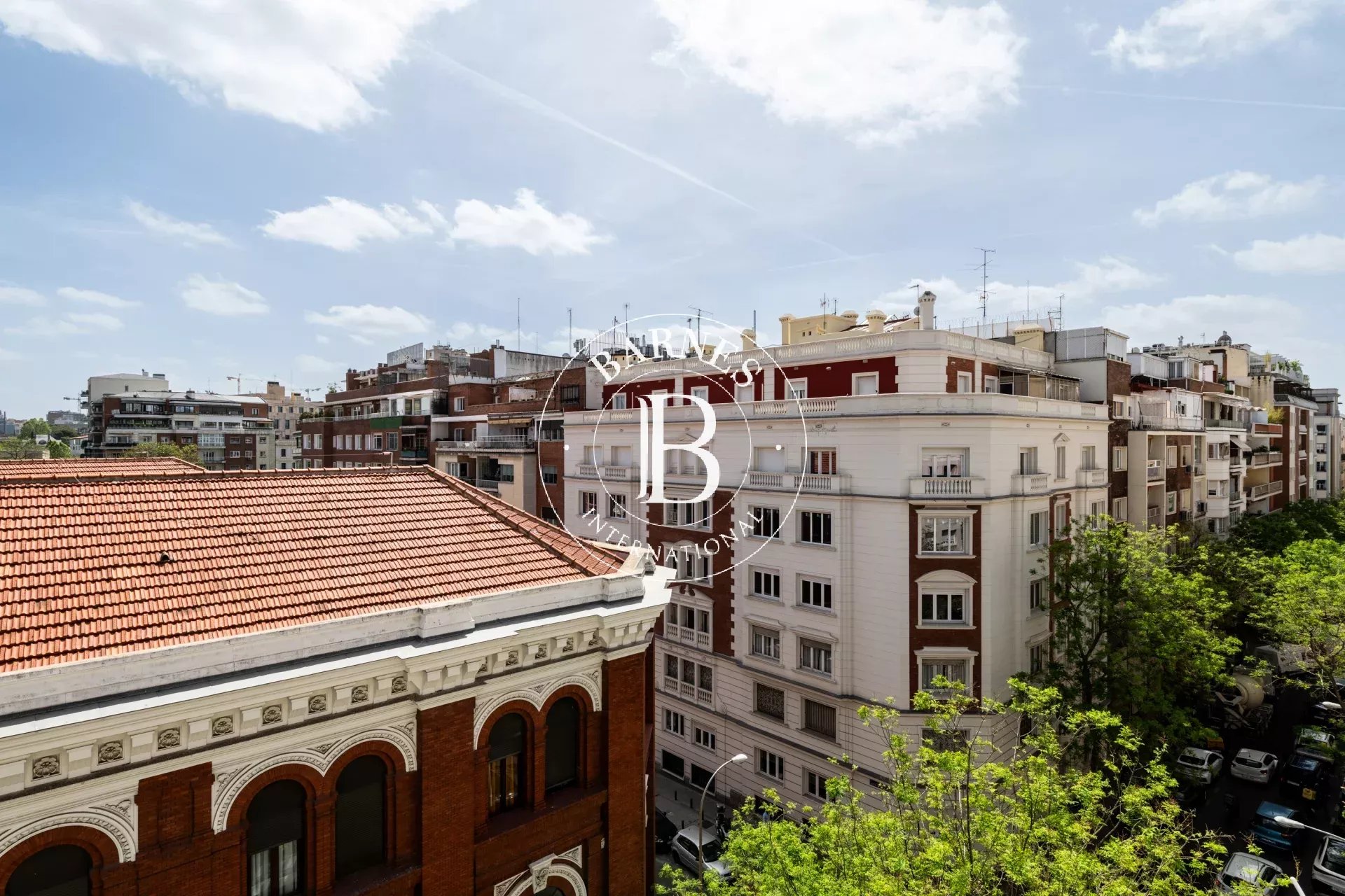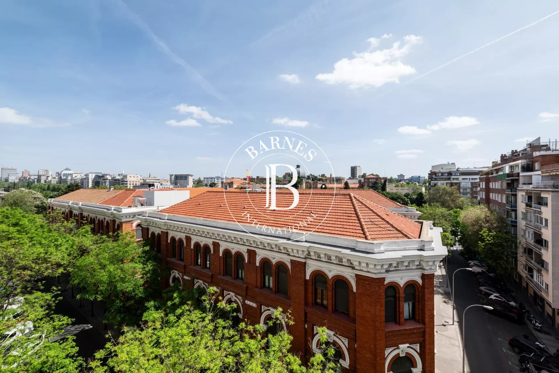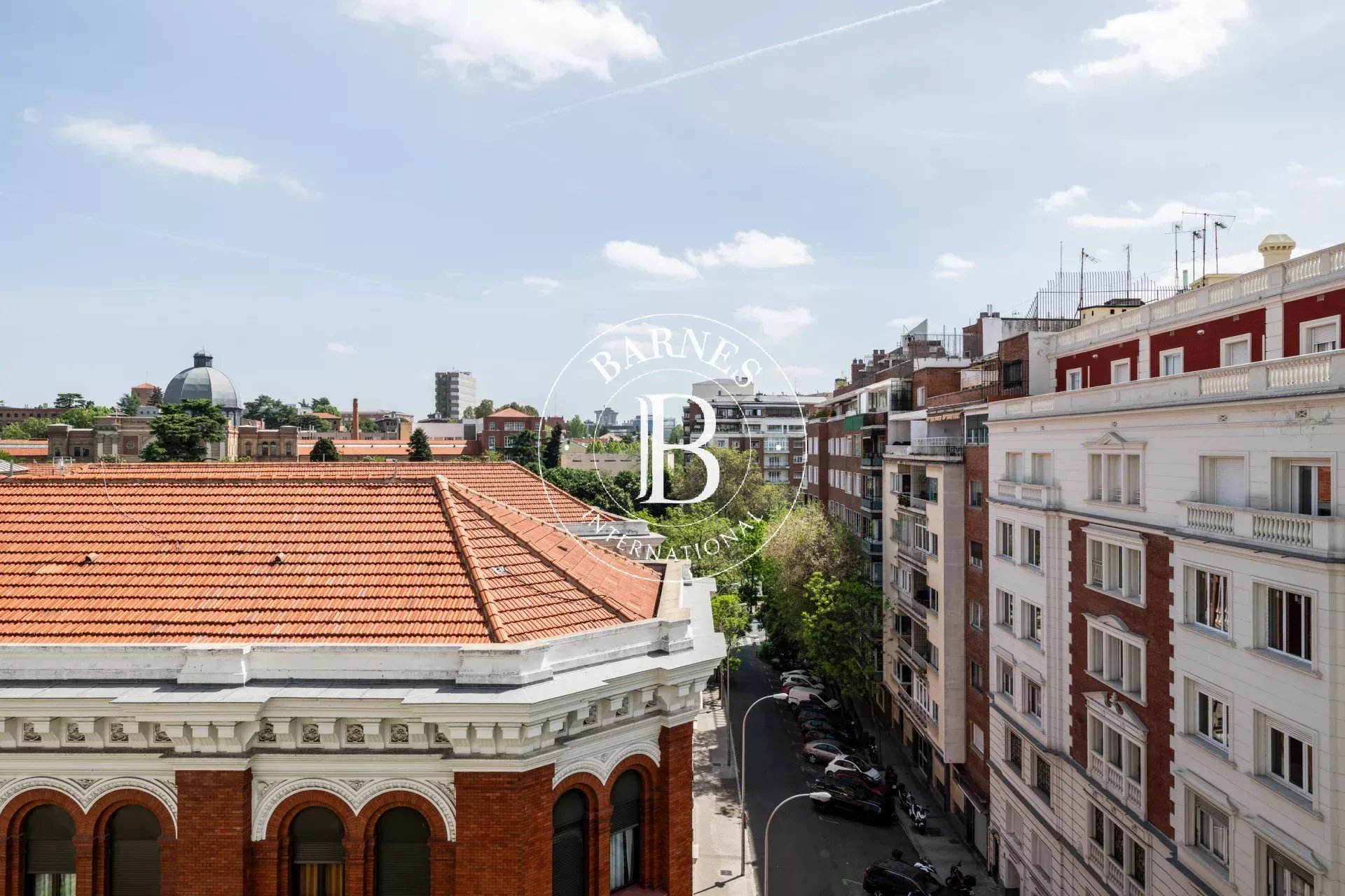 BARNES presenta este exclusivo sexto piso esquinero con espectaculares vistas abiertas sobre Madrid, el Paseo de la Castellana y un emblemático edificio palacete de estilo ecléctico. Una propiedad luminosa y sofisticada que combina privacidad, amplitud y una conexión privilegiada con la ciudad.