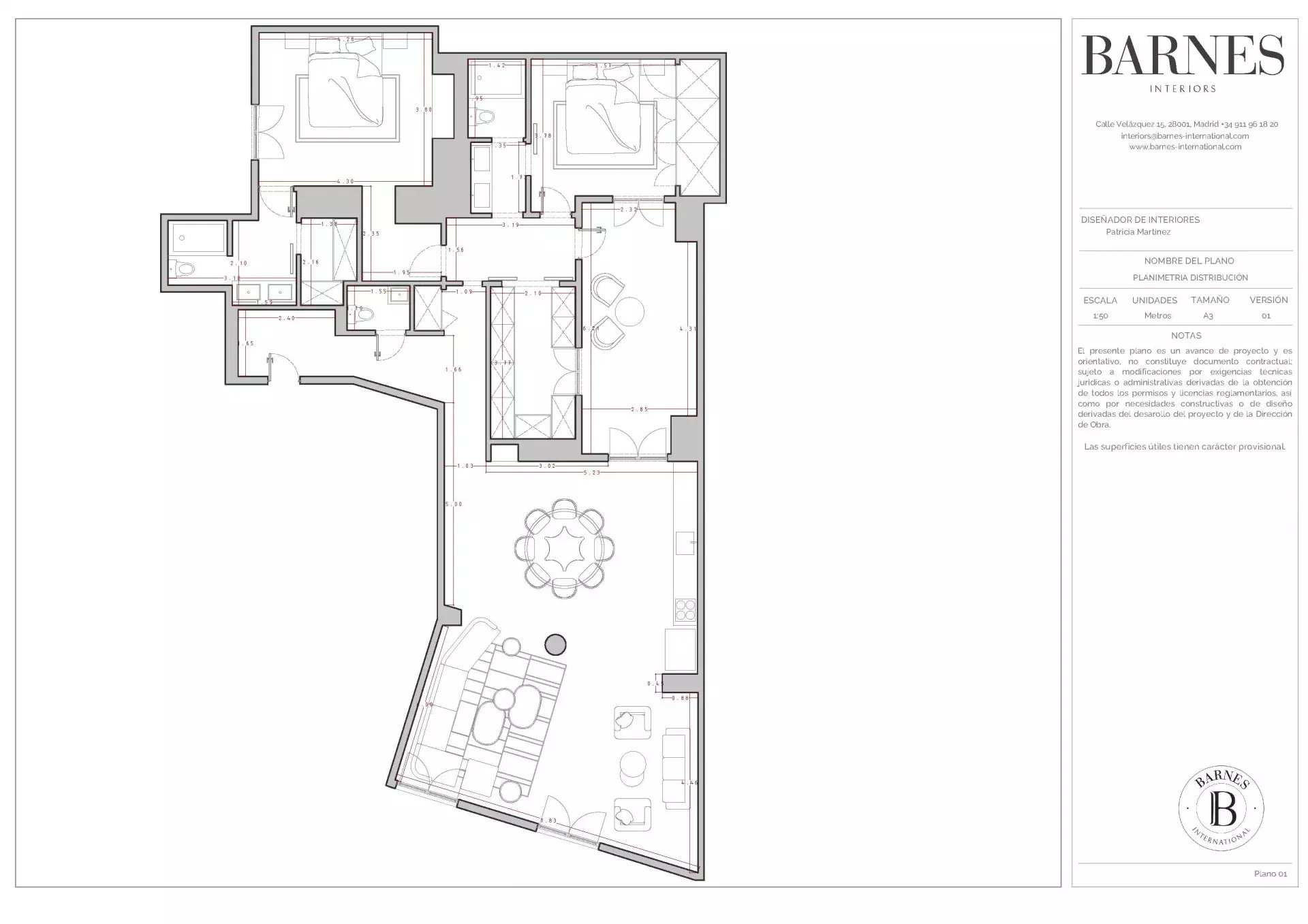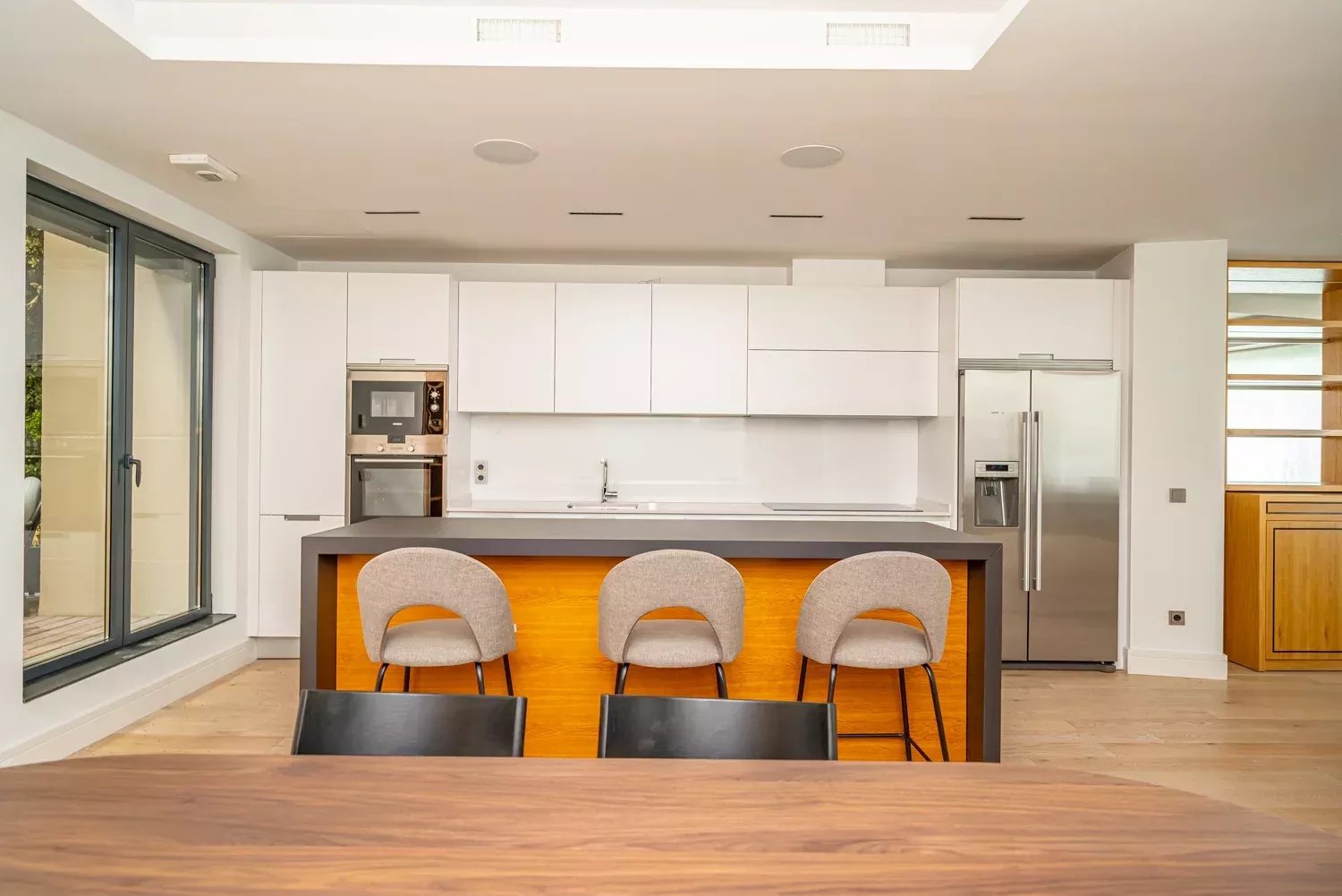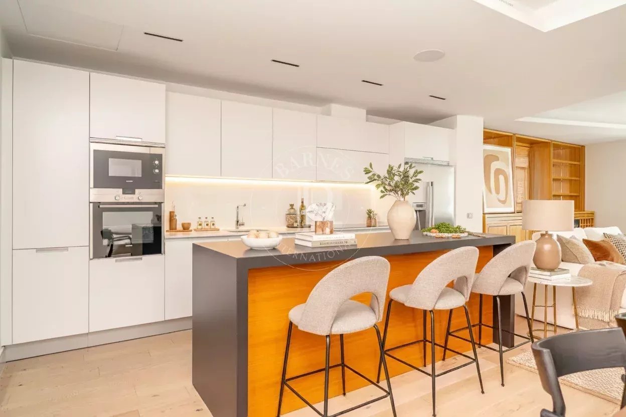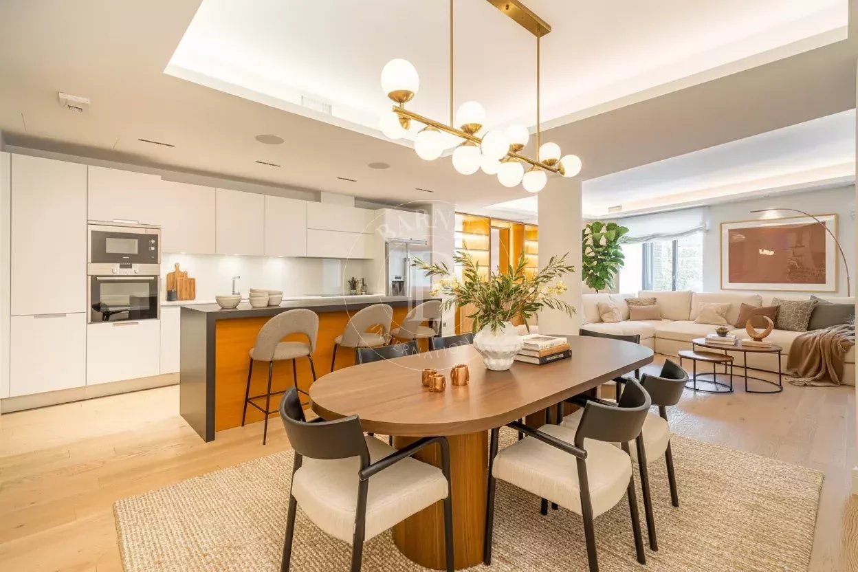La vivienda destaca por su luminosidad y su distribución elegante. El salón-comedor, con vistas a la calle Recoletos, se integra de forma armónica con la cocina moderna, abierta y completamente equipada, que da acceso a una terraza privada, creando un ambiente cálido y acogedor.