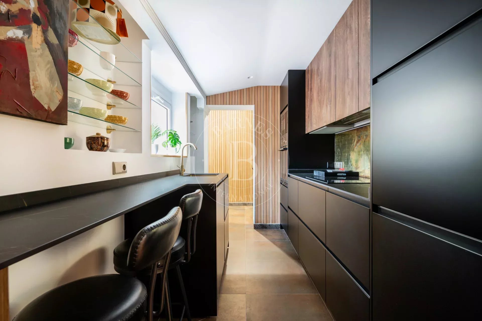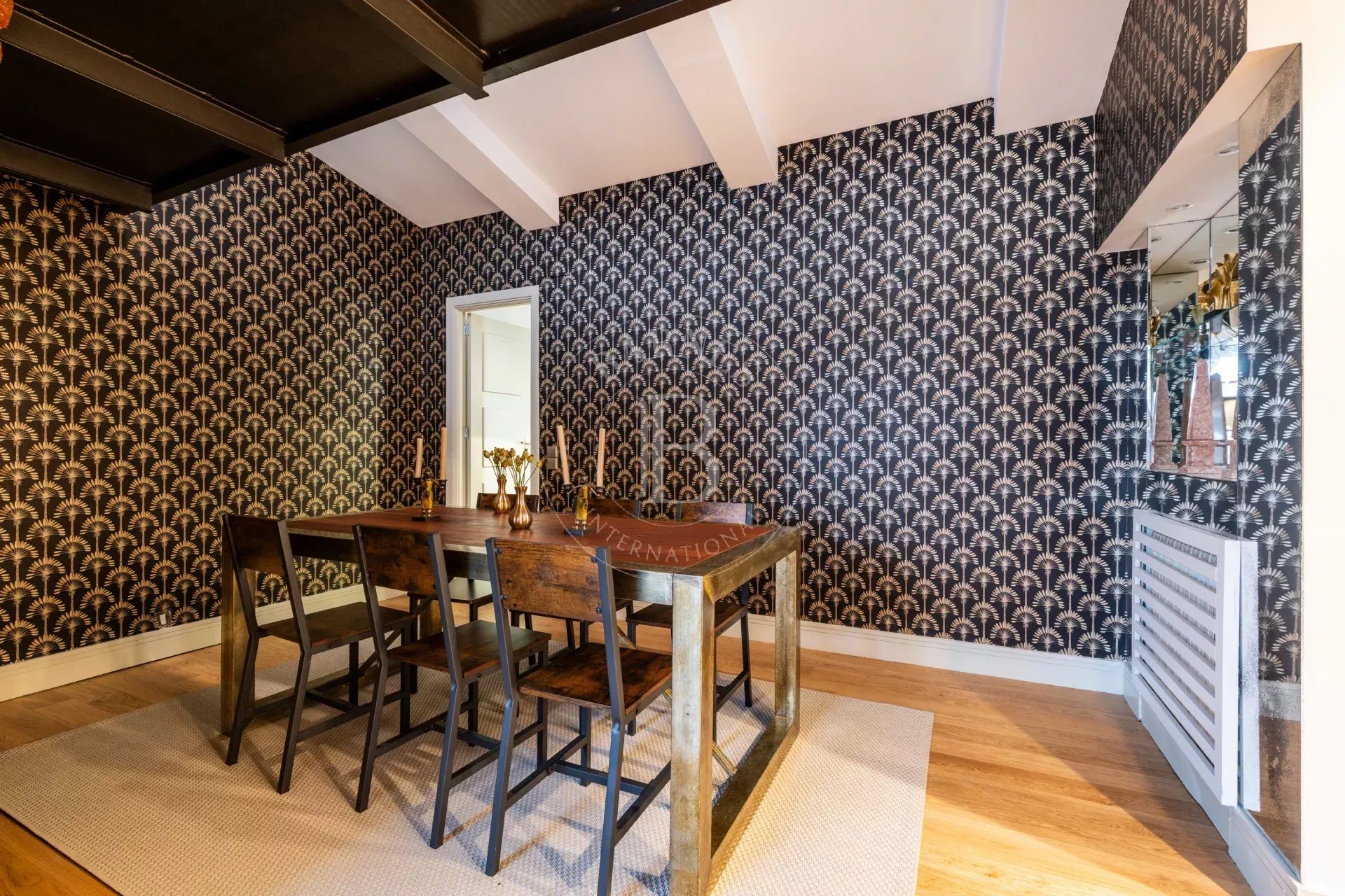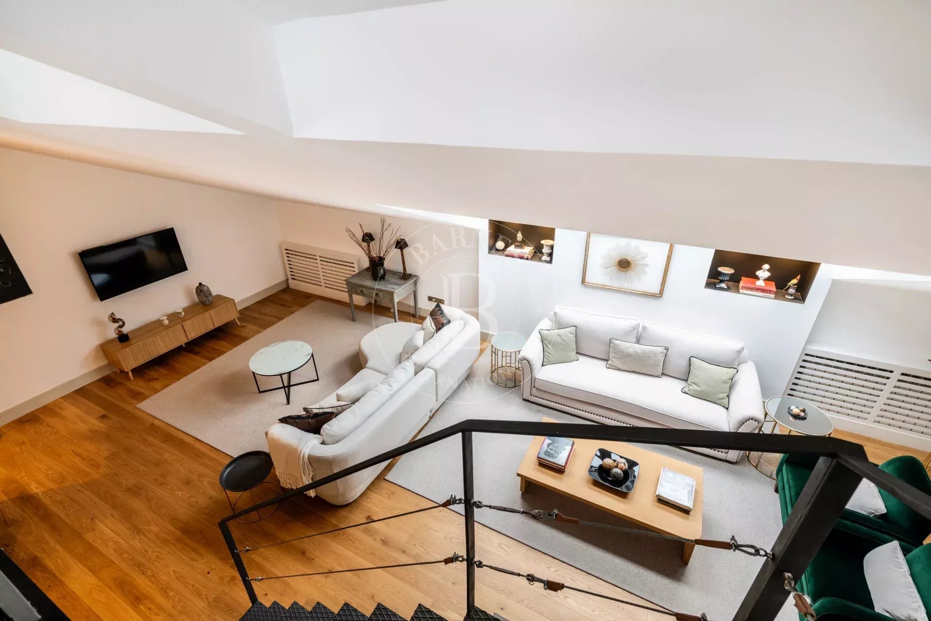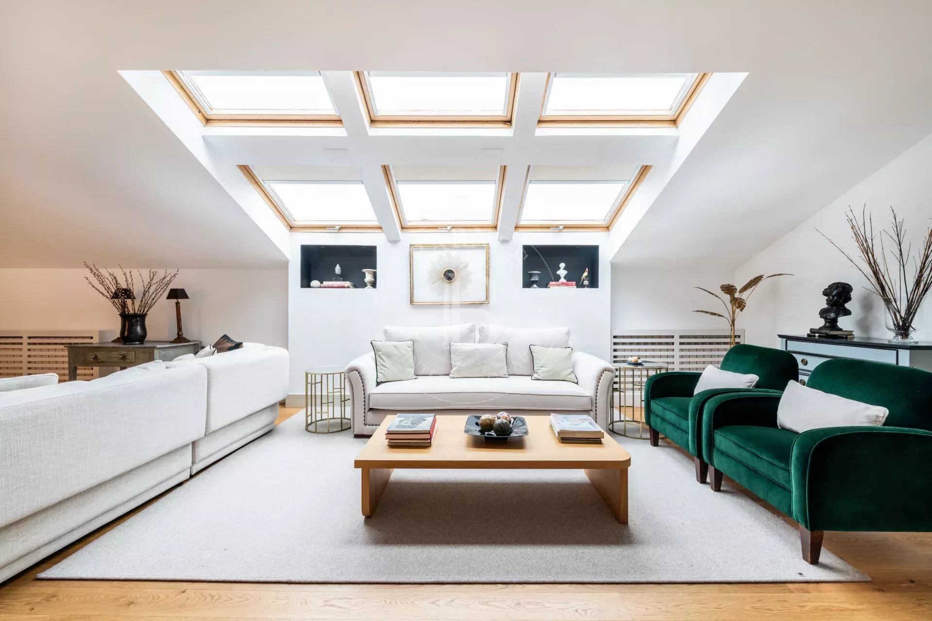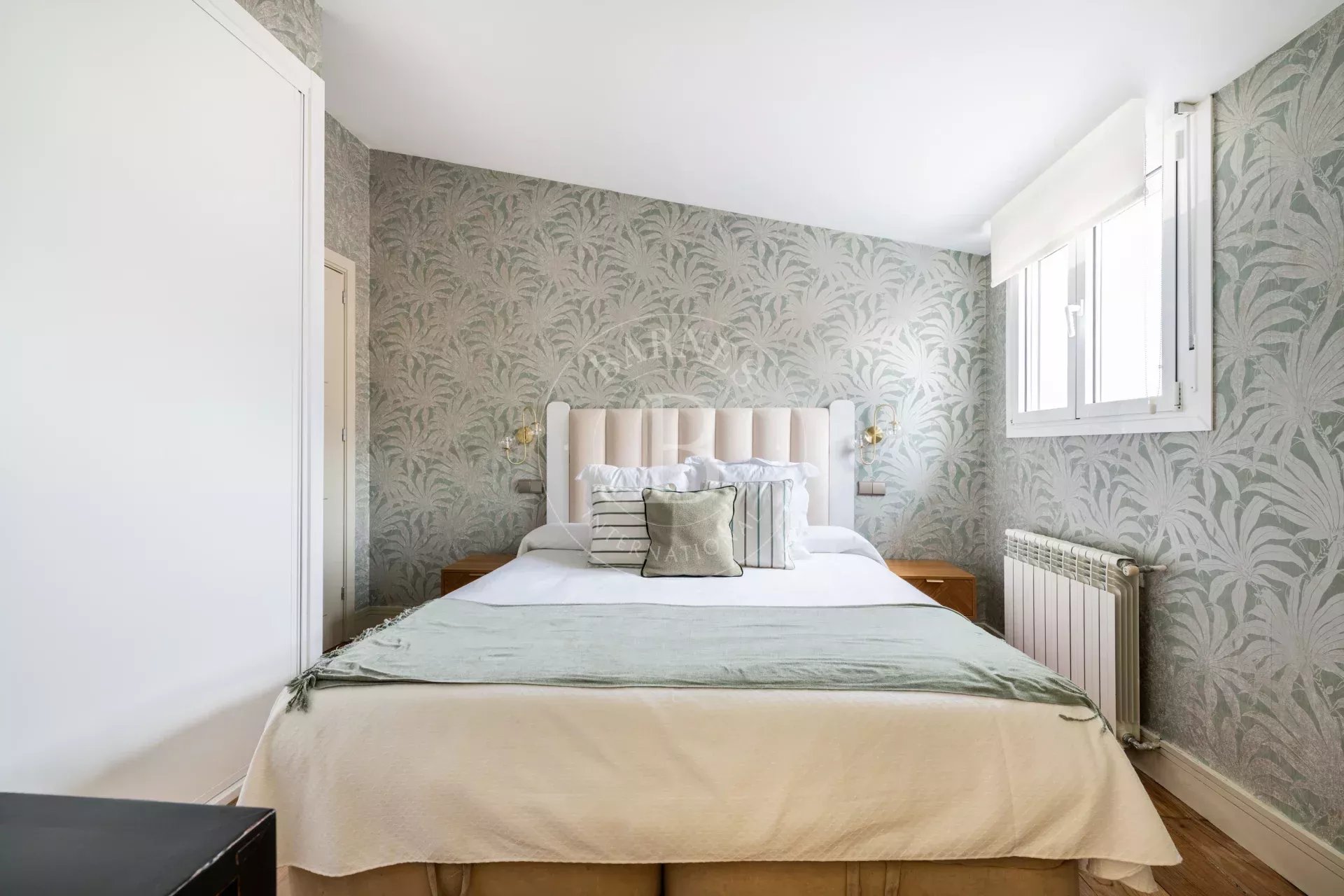El corazón del piso es un espectacular doble salón con techos altos a dos aguas, bañado por una luz natural extraordinaria gracias a su orientación sur. Desde aquí se disfruta de una sensación de amplitud y luminosidad poco habitual, reforzada por las vistas abiertas y la conexión visual con el skyline urbano.