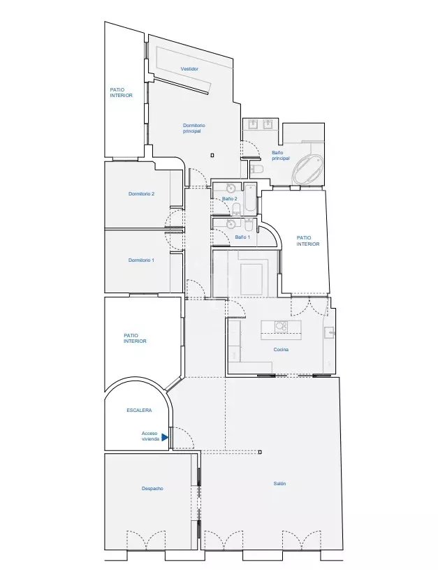 Cuenta con tres dormitorios, incluyendo un dormitorio principal en suite con un amplio baño equipado con ducha y jacuzzi, además de un espacioso vestidor. Dispone de tres baños completos en total.