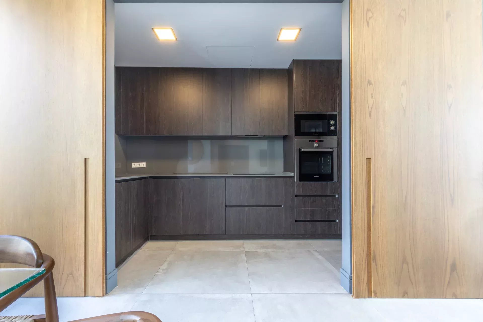 La zona social se completa con un elegante comedor con capacidad para ocho comensales y una cocina independiente totalmente equipada con electrodomésticos de primeras marcas y todo el menaje necesario.