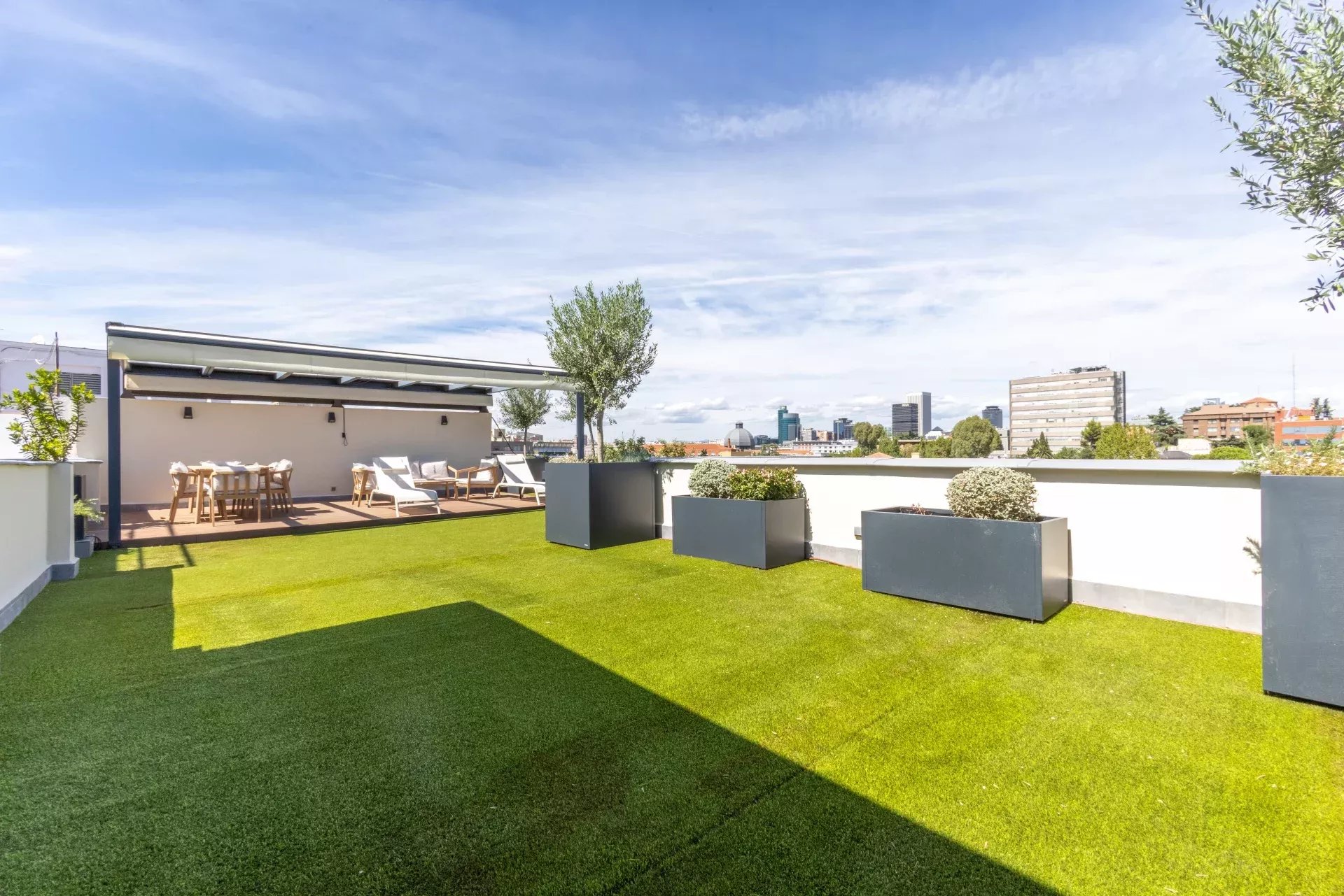 El gran atractivo de este ático es su terraza de 136 m², amueblada con zona chill-out, tumbonas, sombrillas, césped a modo de jardín y una pérgola con mesa de comedor exterior, un espacio único para disfrutar del cielo de Madrid y de sus espectaculares vistas 360º.