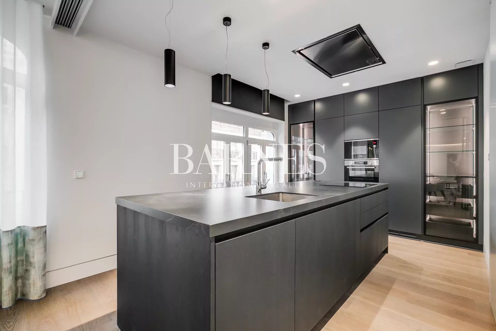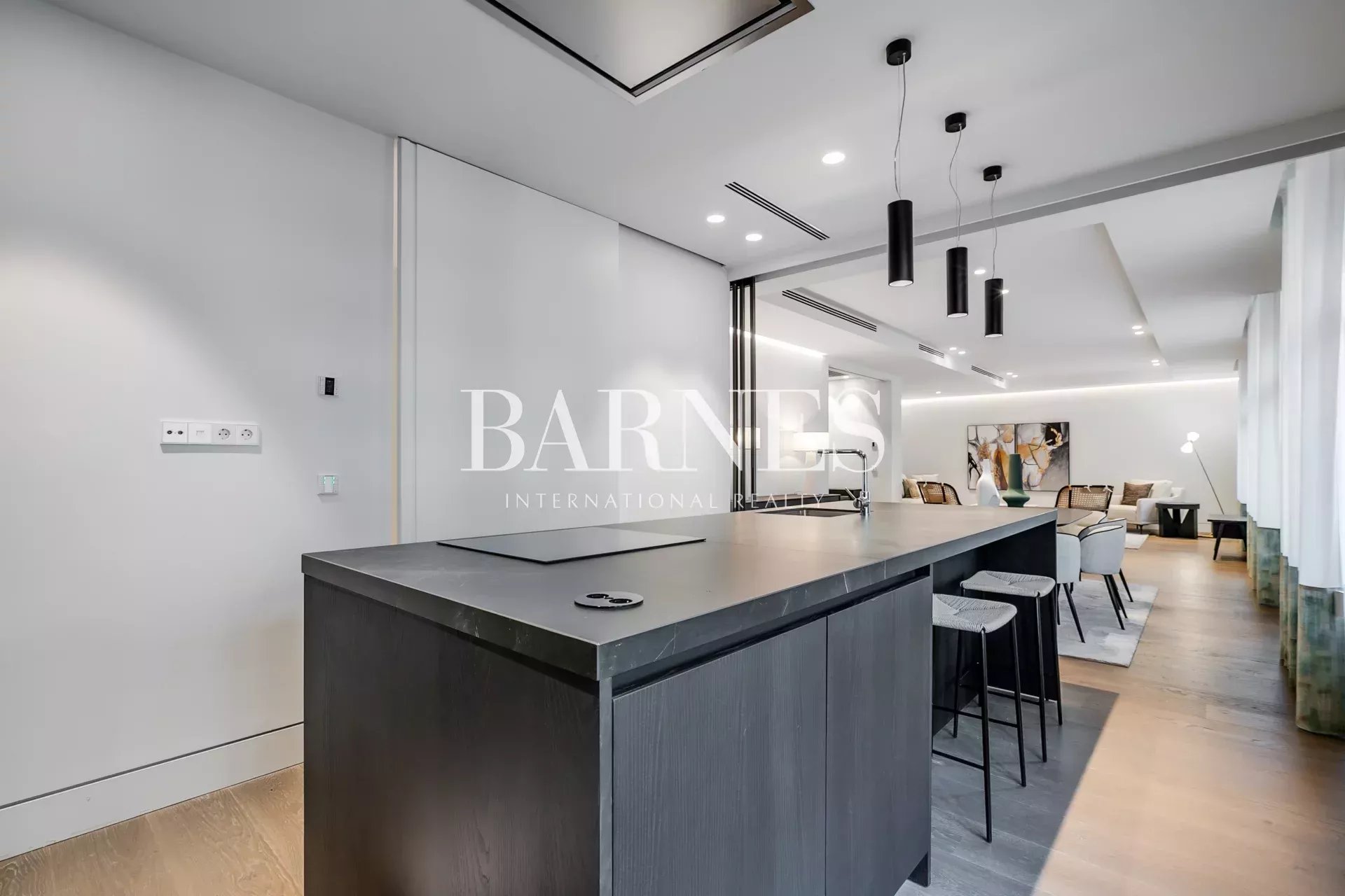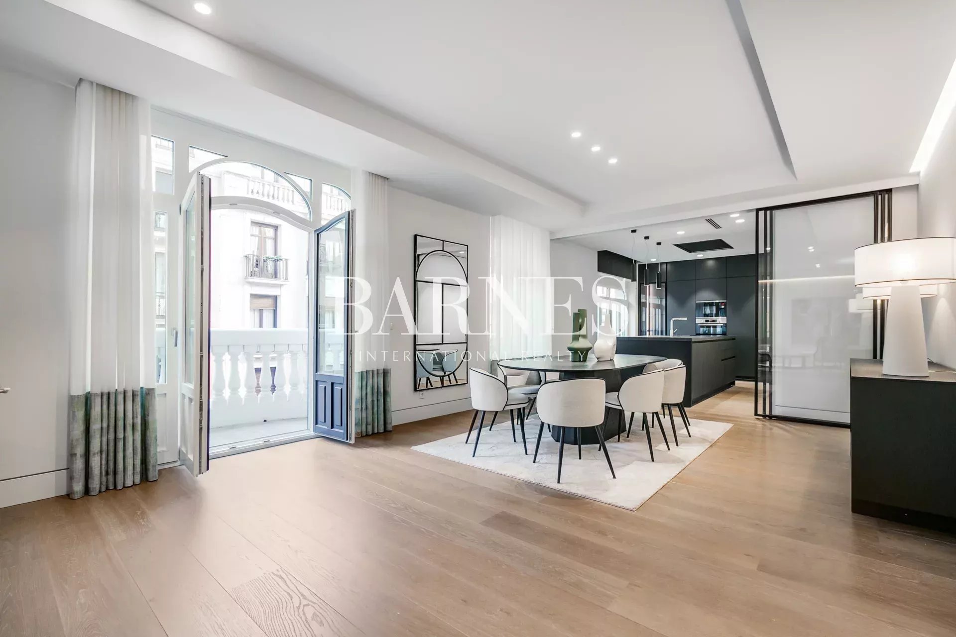 Desde el hall de entrada se accede a un amplio salón-comedor con acceso al único balcón del edificio, con vistas laterales al Retiro. Este espacio fluye hacia una moderna cocina abierta con gran isla central, que puede independizarse mediante una puerta corredera de vidrio.
