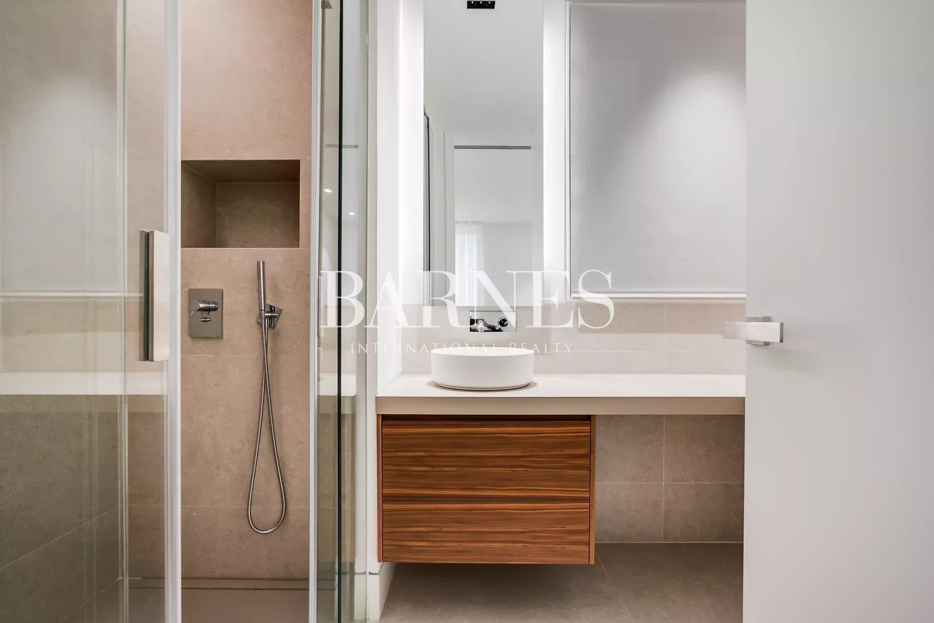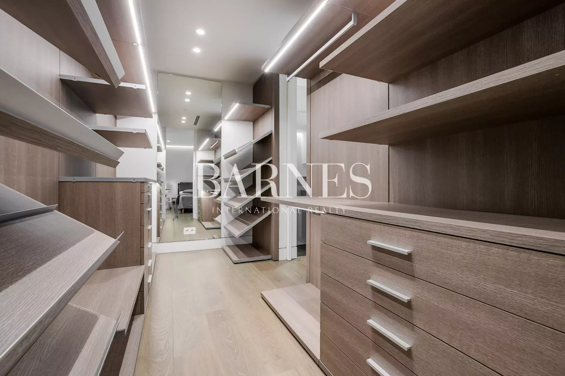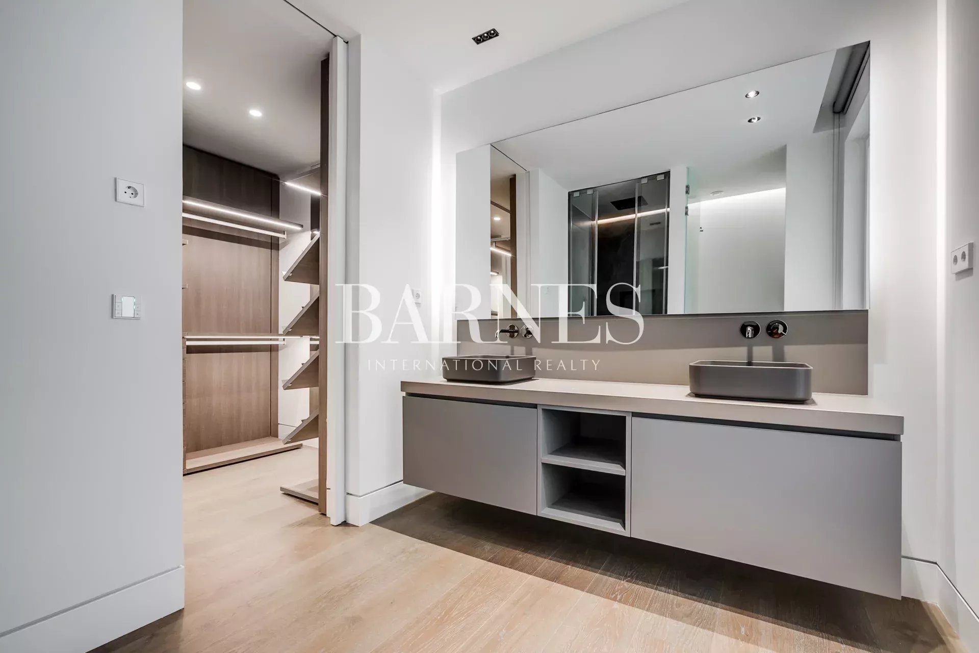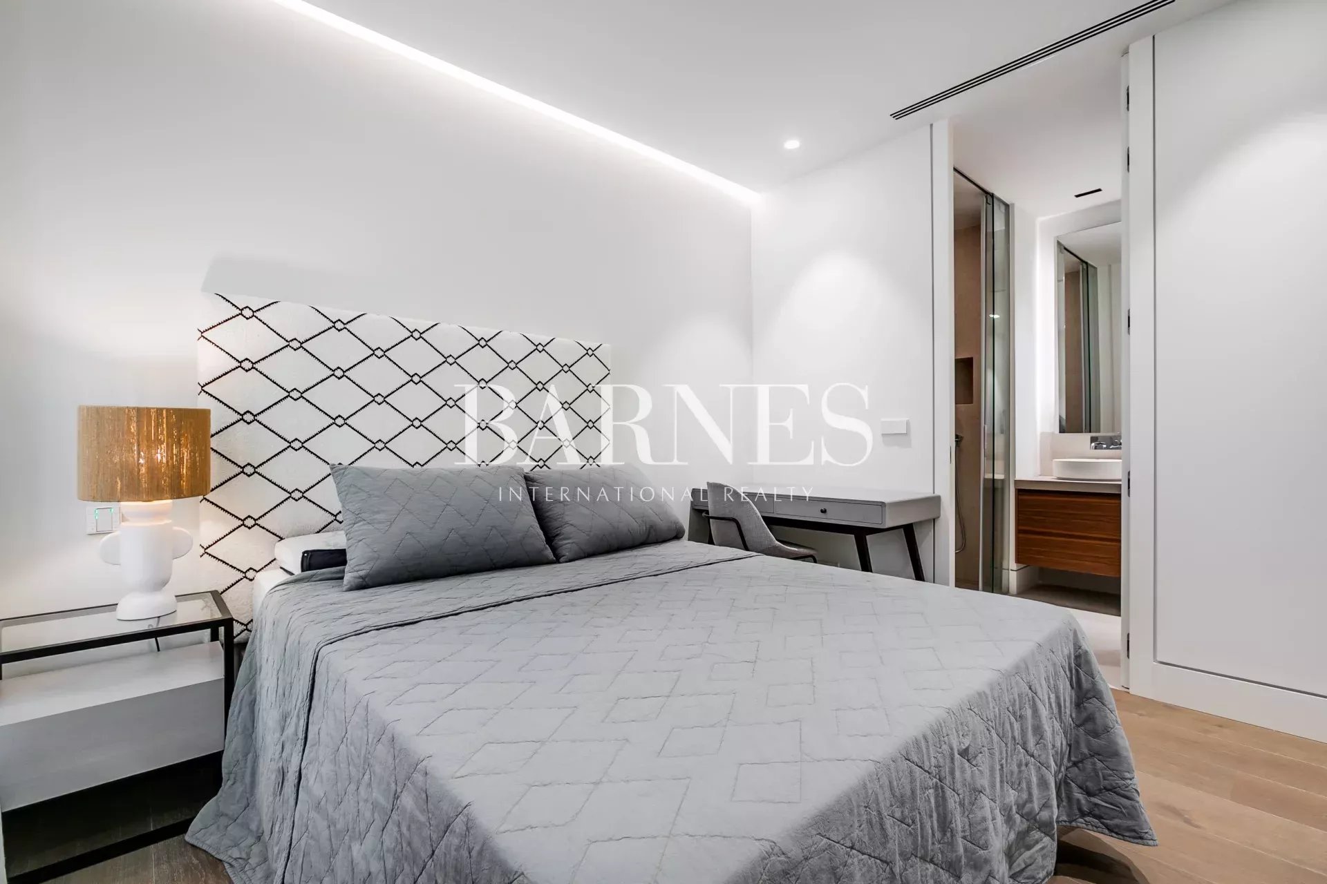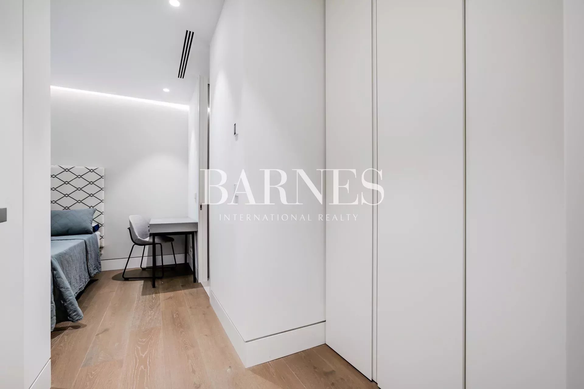 La zona de descanso, separada por puerta corredera, alberga tres dormitorios con baño en suite, incluyendo una amplia suite principal con vestidor. Un espacio adicional cerrado ofrece múltiples usos: despacho, vestidor extra o cuarto polivalente.