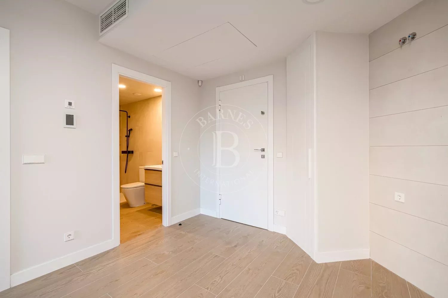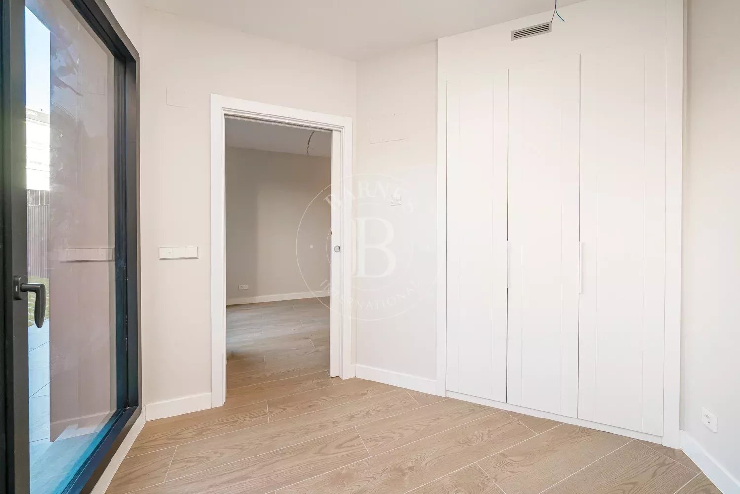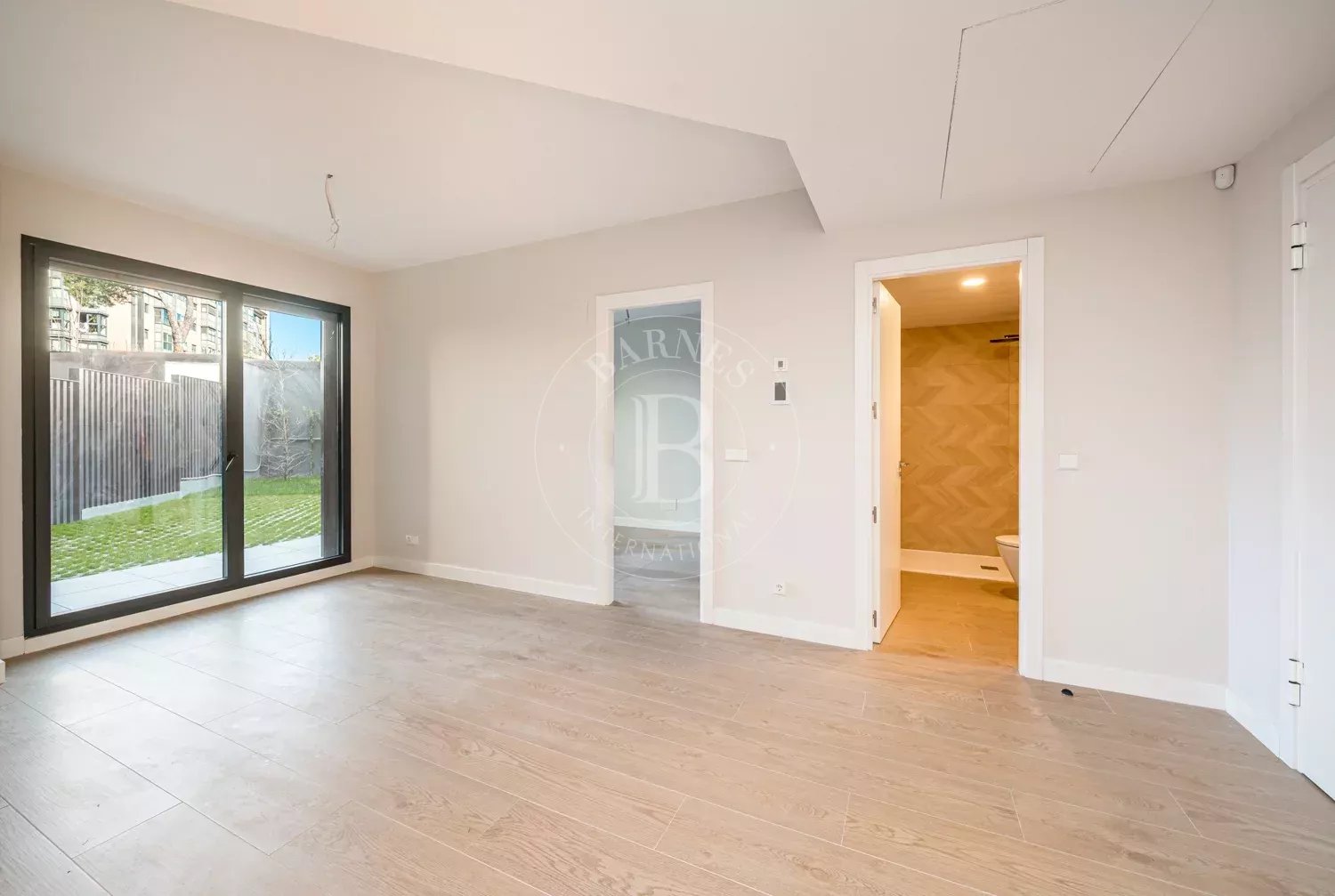 La vivienda se distribuye en dos dormitorios con armarios empotrados, ambos con grandes ventanales de suelo a techo que inundan las estancias de luz natural y ofrecen agradables vistas al jardín privado. Los dormitorios comparten un baño en suite de generosas dimensiones, equipado con un elegante plato de ducha y acabados de alta calidad, creando un ambiente sofisticado y funcional.