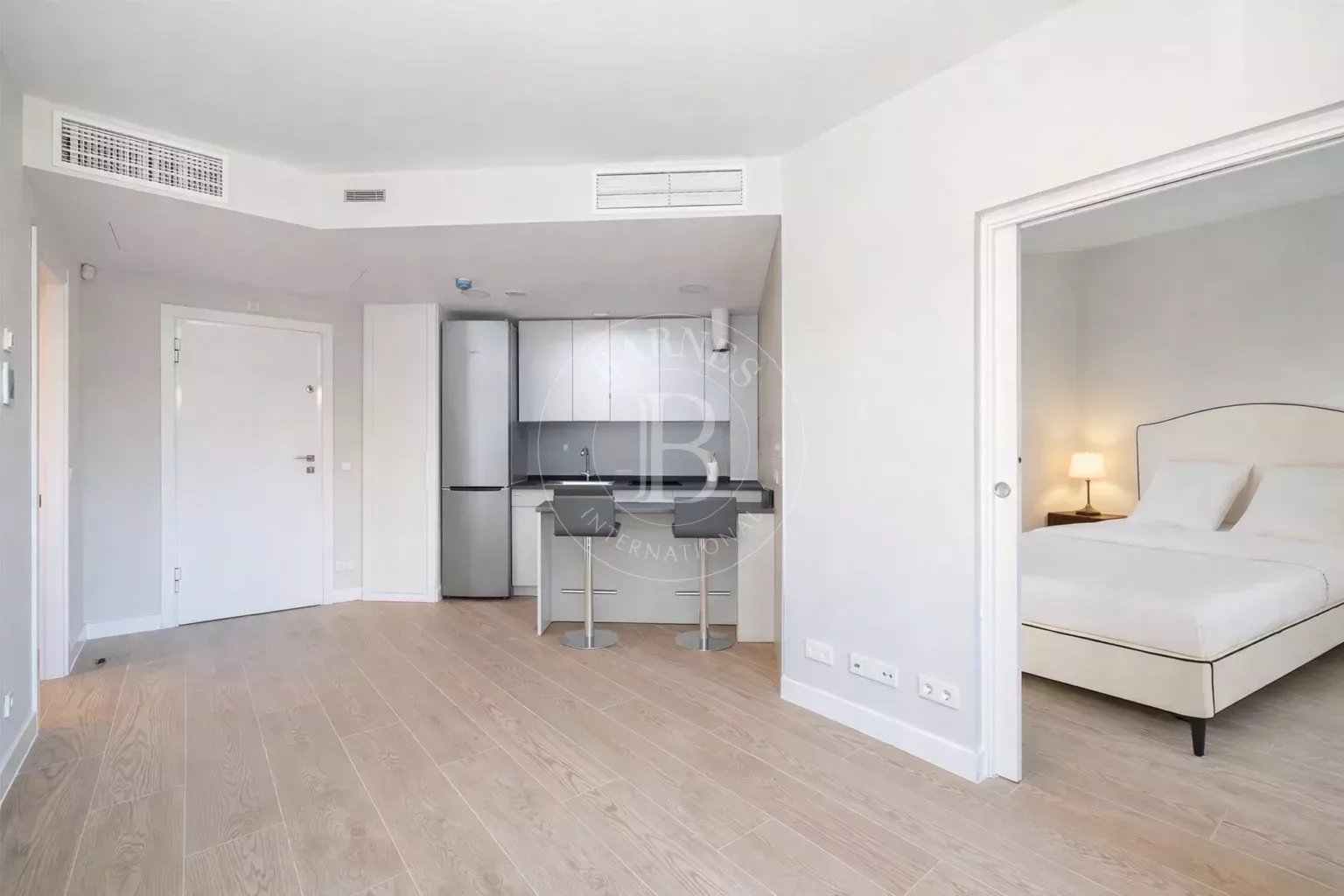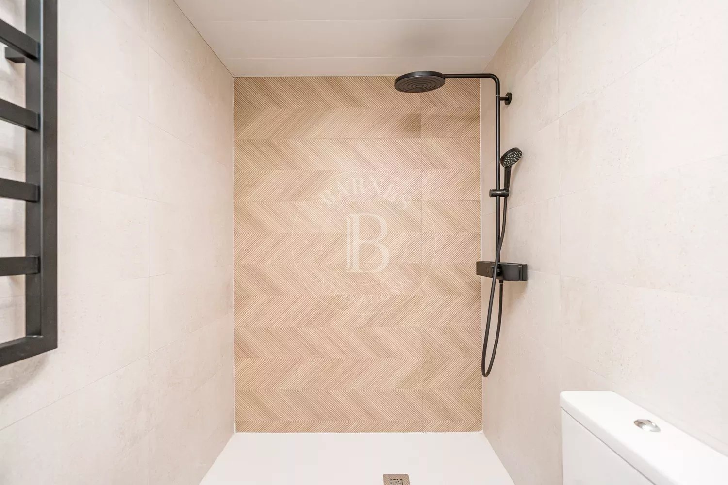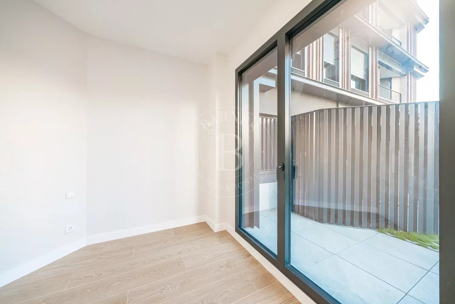 La vivienda se distribuye en dos dormitorios con armarios empotrados, ambos con grandes ventanales de suelo a techo que inundan las estancias de luz natural y ofrecen agradables vistas al jardín privado. Los dormitorios comparten un baño en suite de generosas dimensiones, equipado con un elegante plato de ducha y acabados de alta calidad, creando un ambiente sofisticado y funcional.