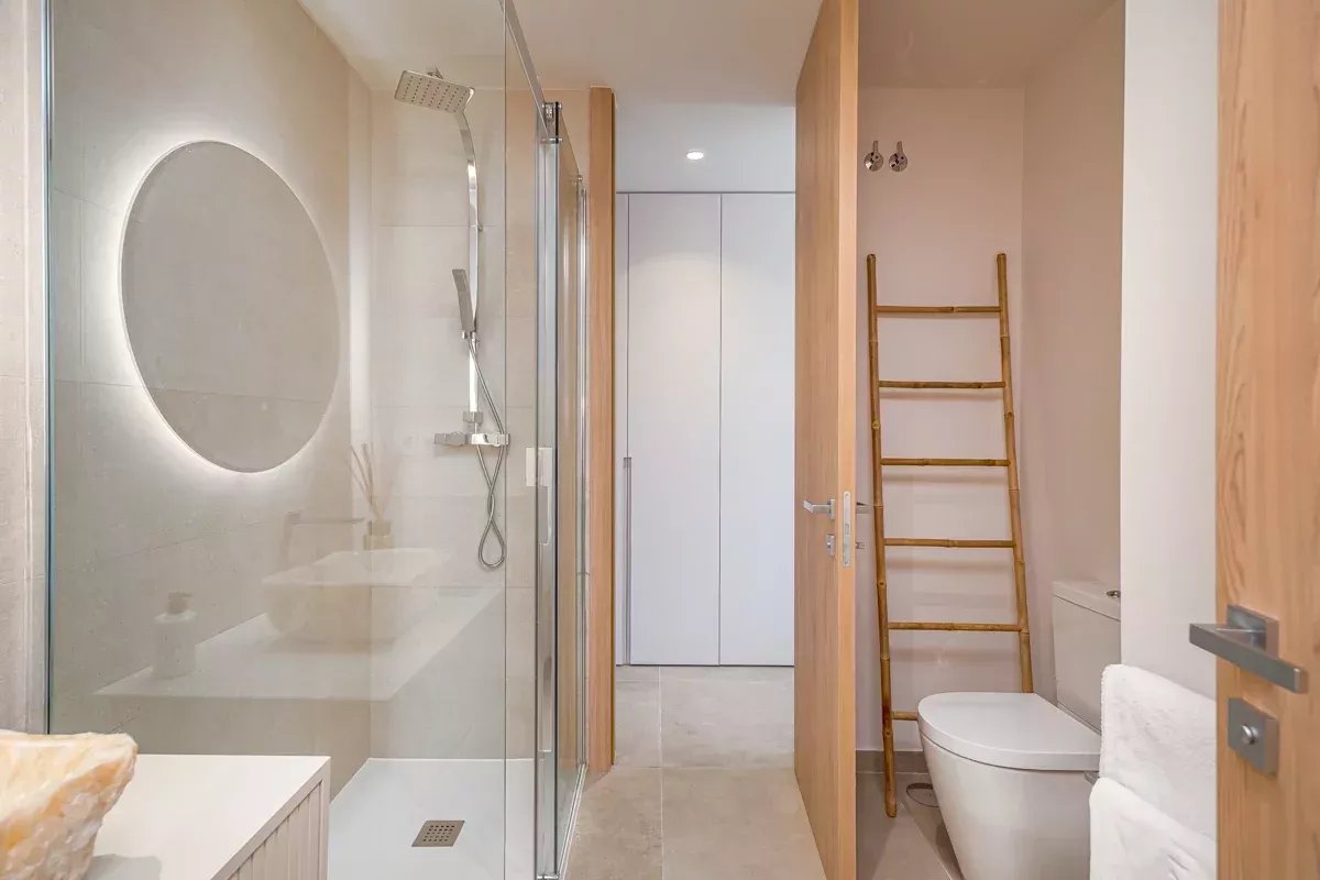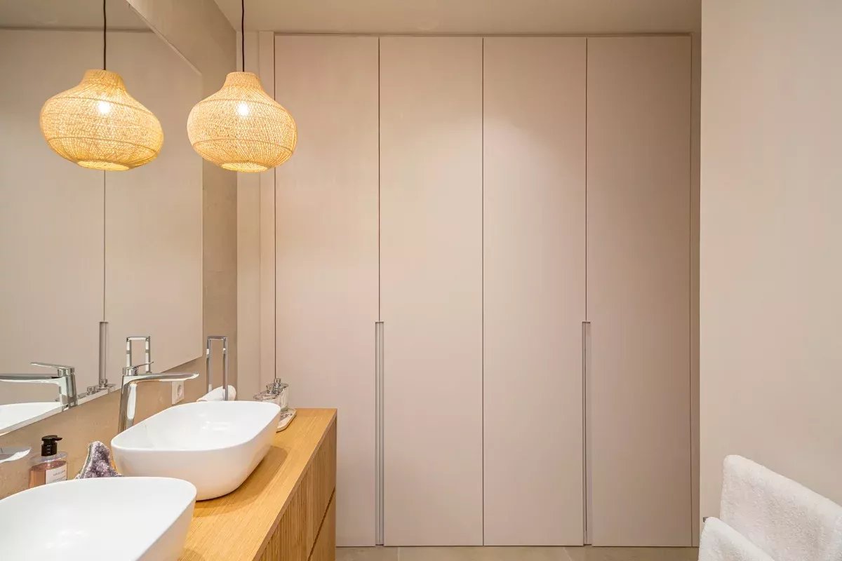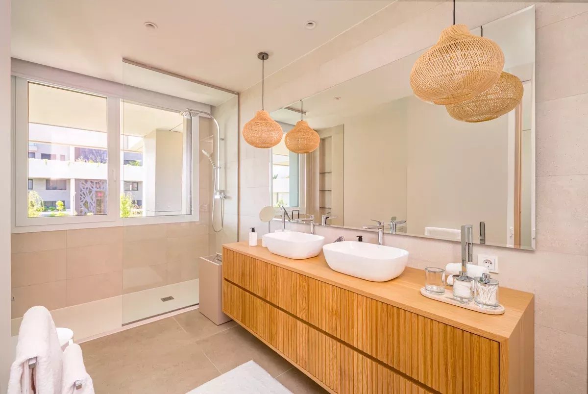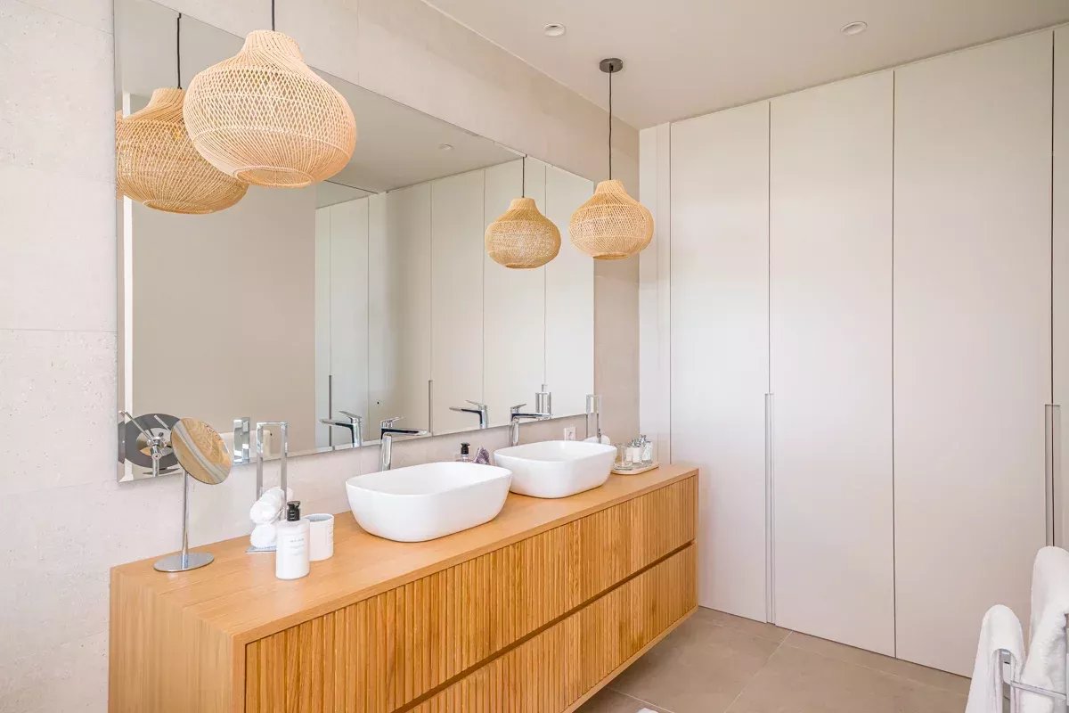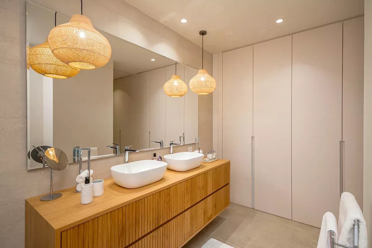 El principal dispone de baño en suite con bañera, mientras que los otros dos comparten un segundo baño completo con ducha amplia y doble lavamanos.