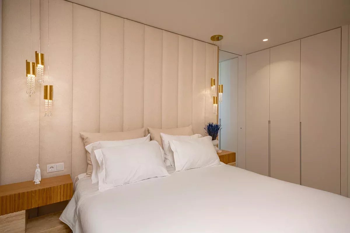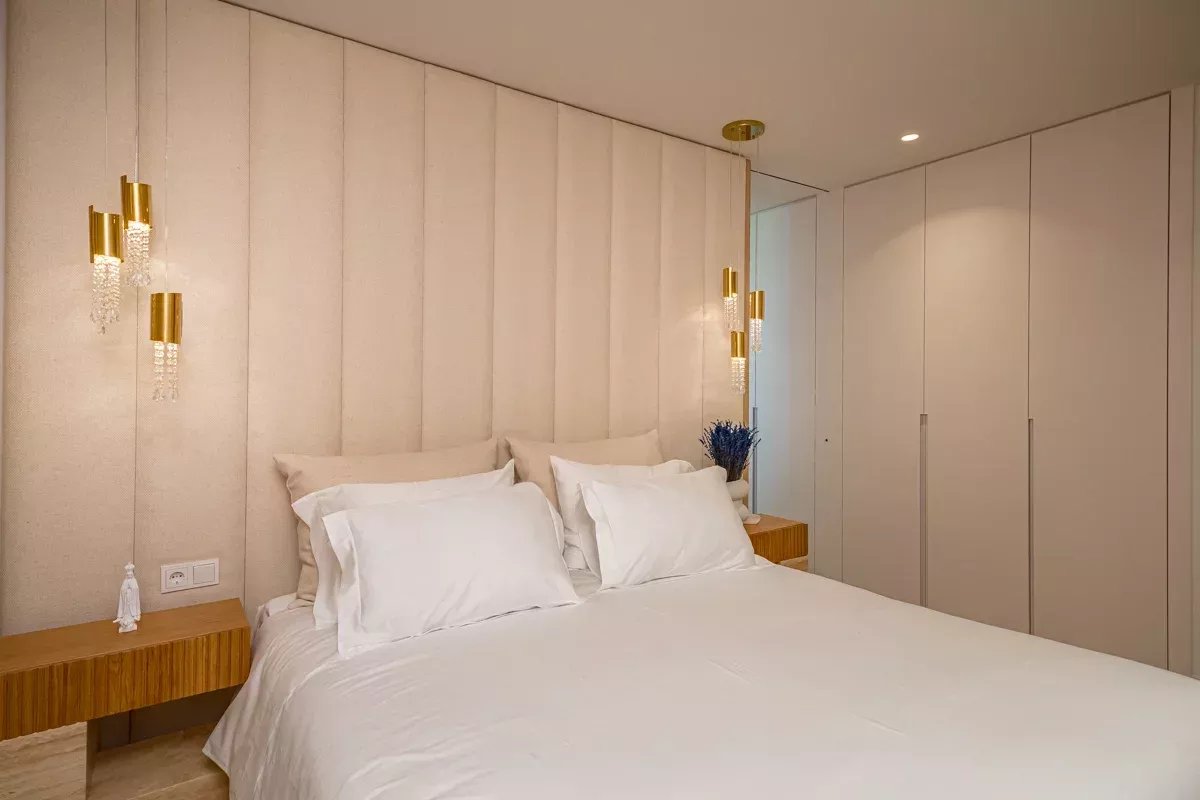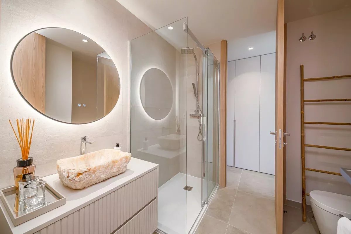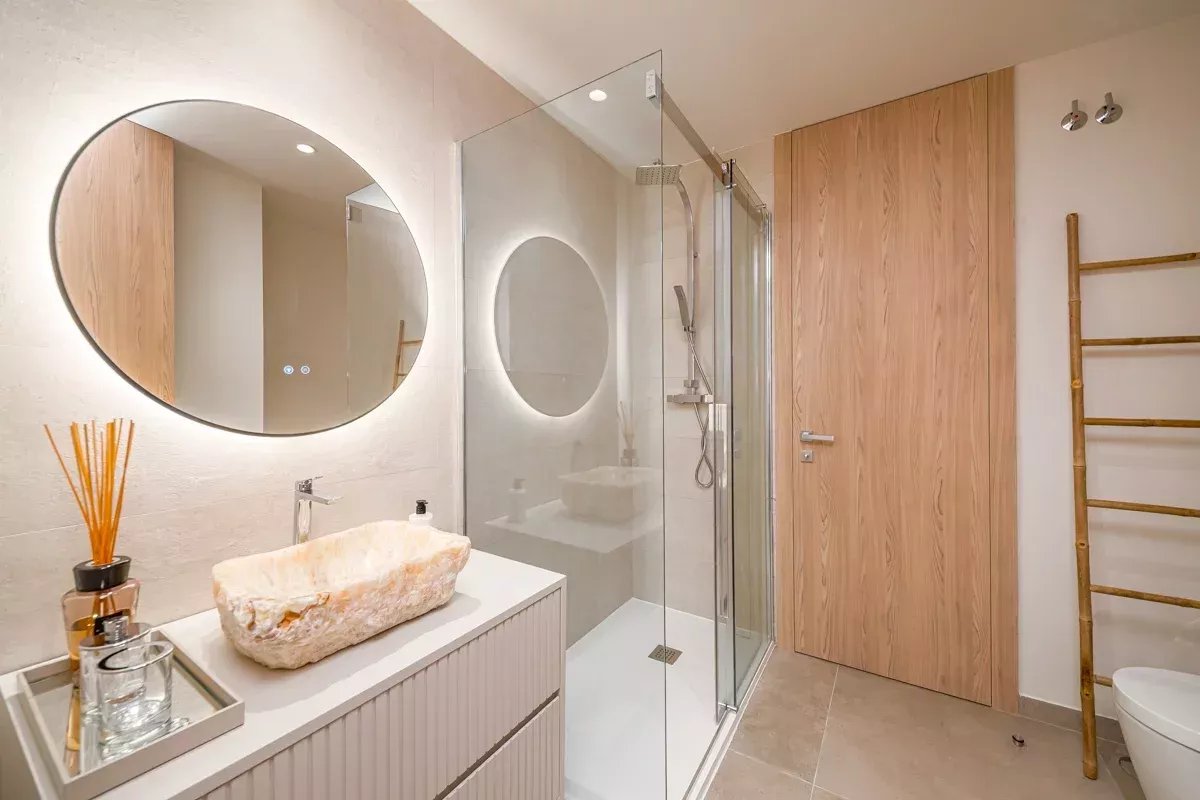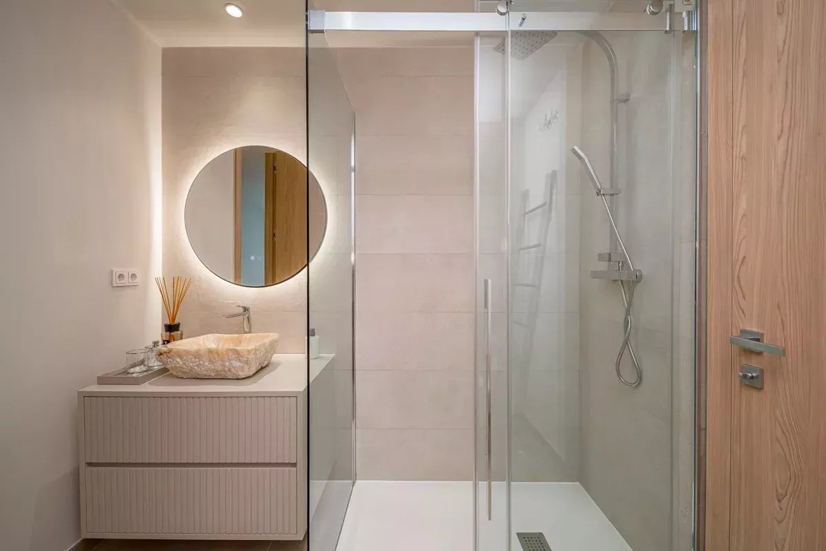 El principal dispone de baño en suite con bañera, mientras que los otros dos comparten un segundo baño completo con ducha amplia y doble lavamanos.
