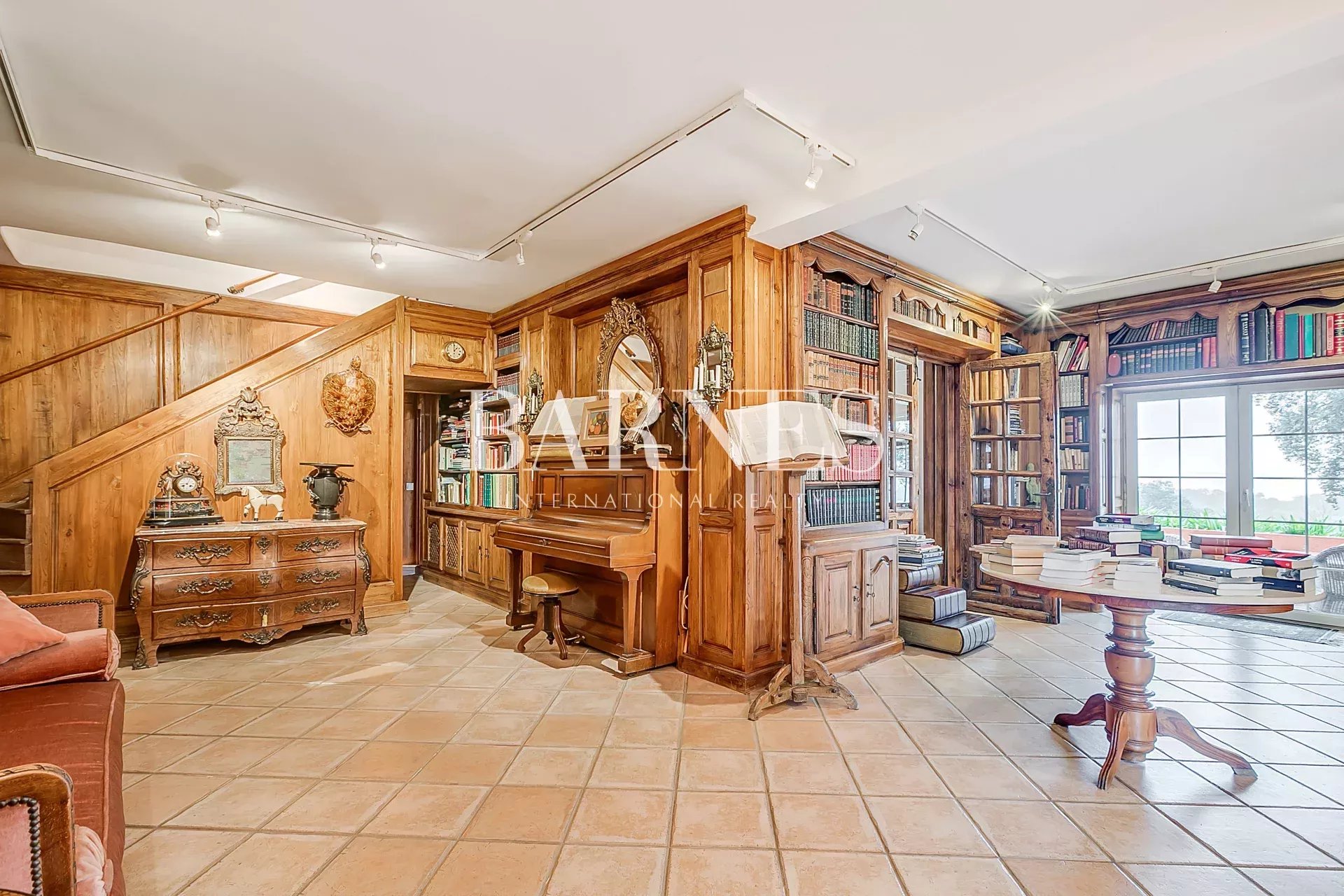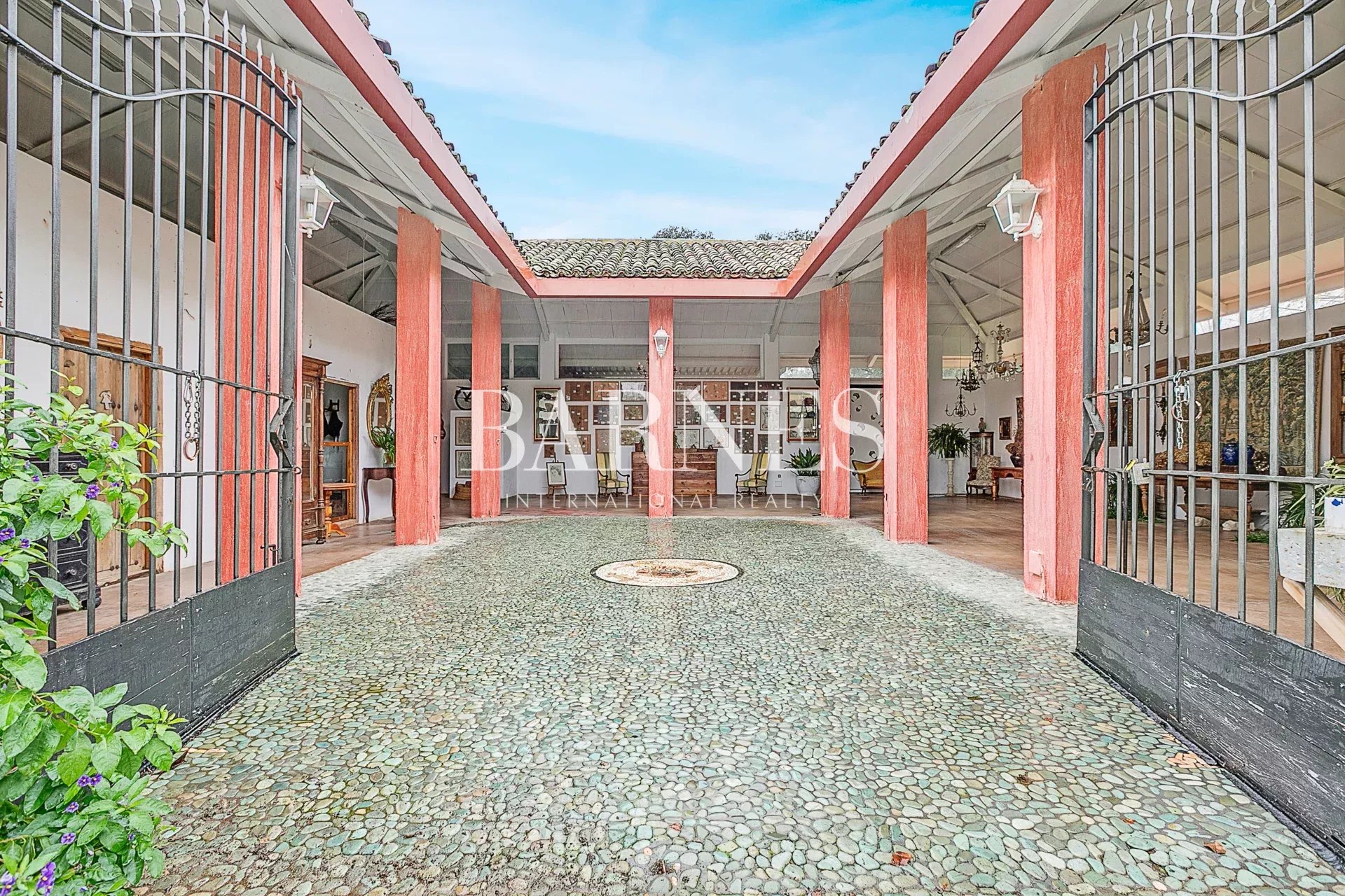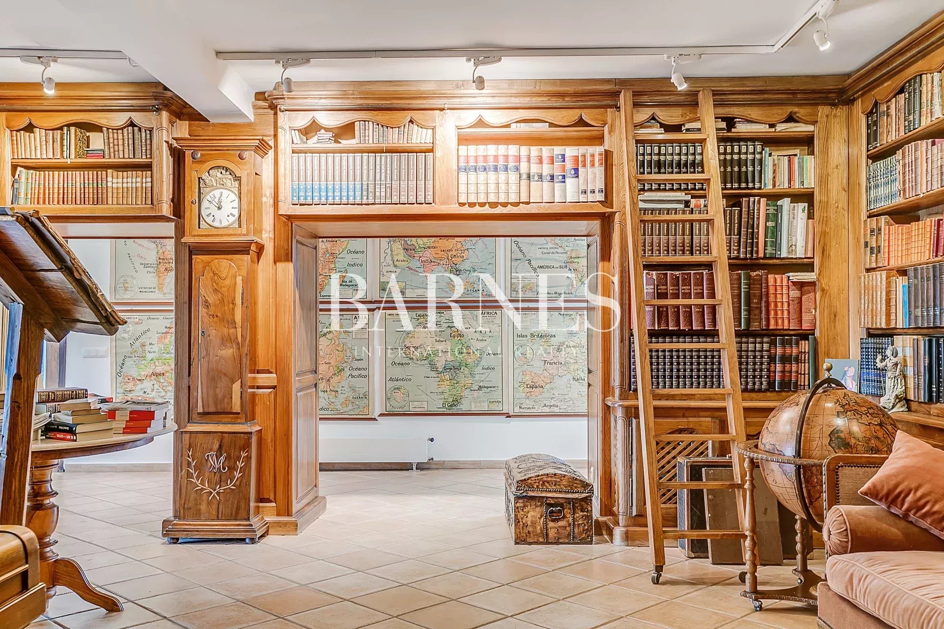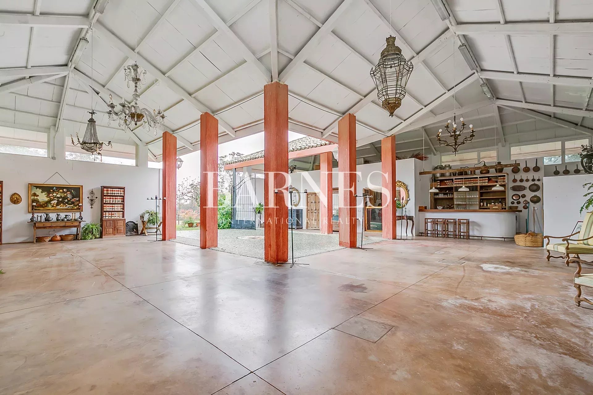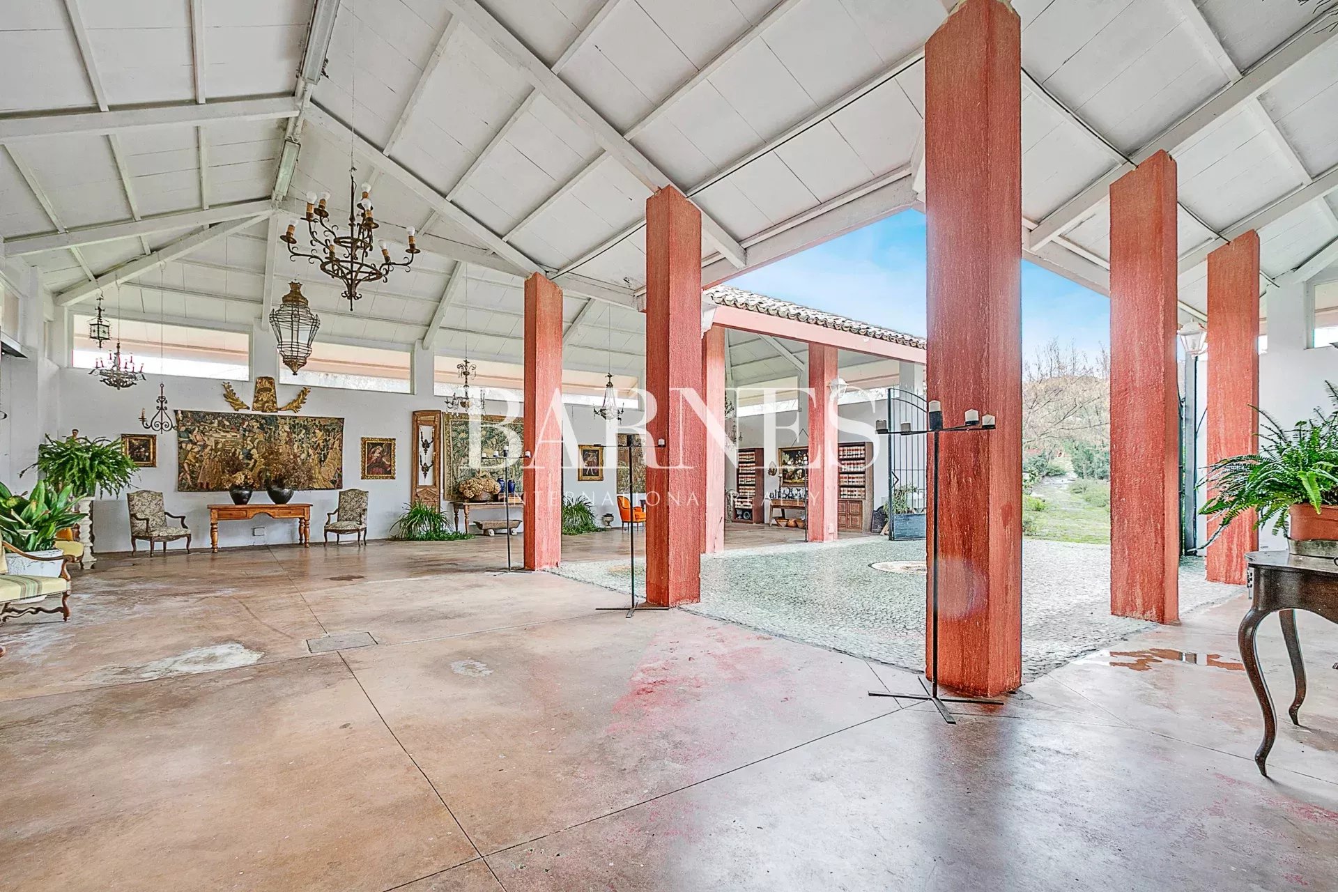 La lujosa vivienda principal está dividida en dos volúmenes: la antigua casa alberga una biblioteca revestida con maderas exóticas, cuarto de estar y despacho, comunicando con una construcción posterior de mayor amplitud y confort contemporáneo.