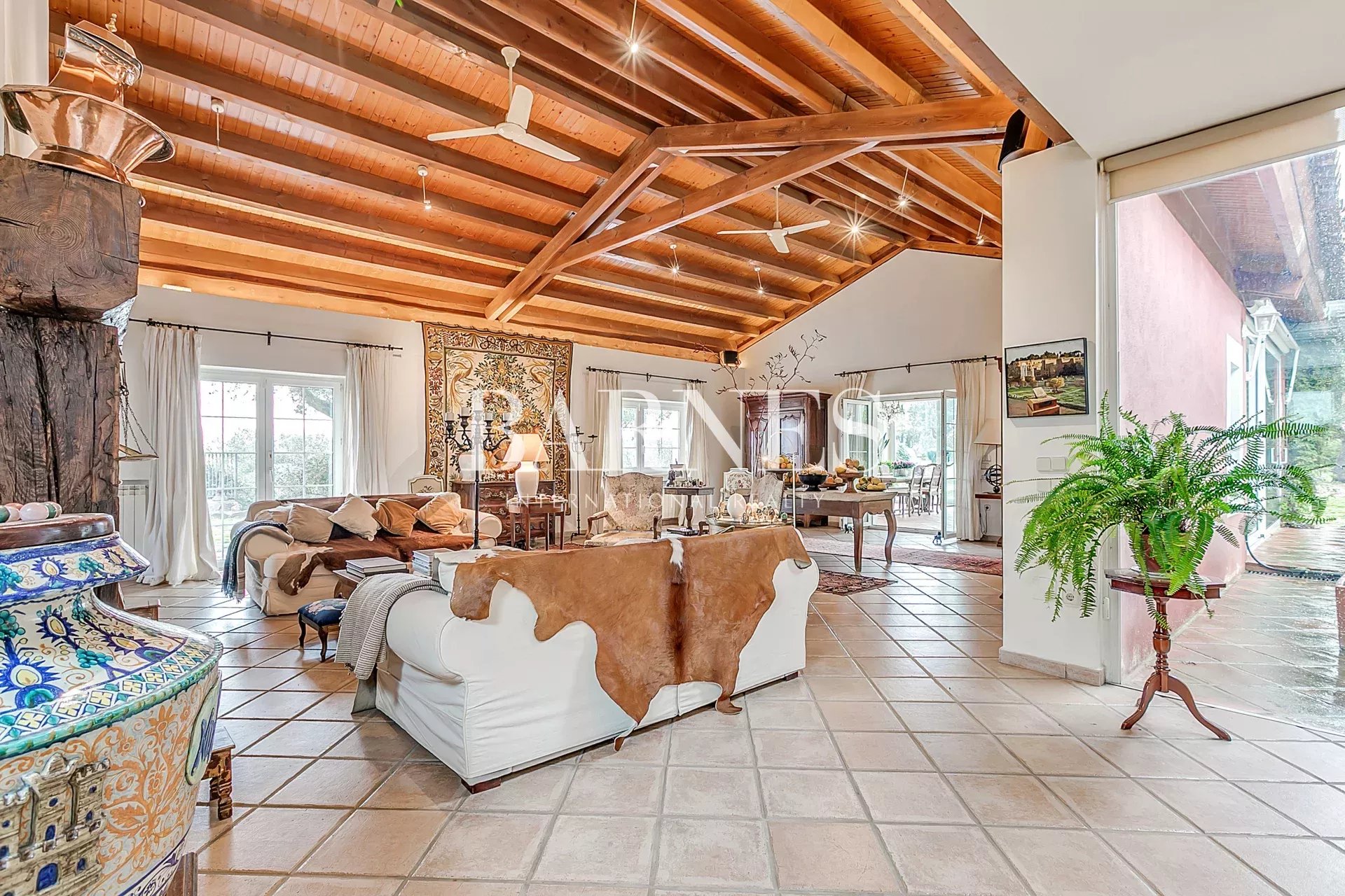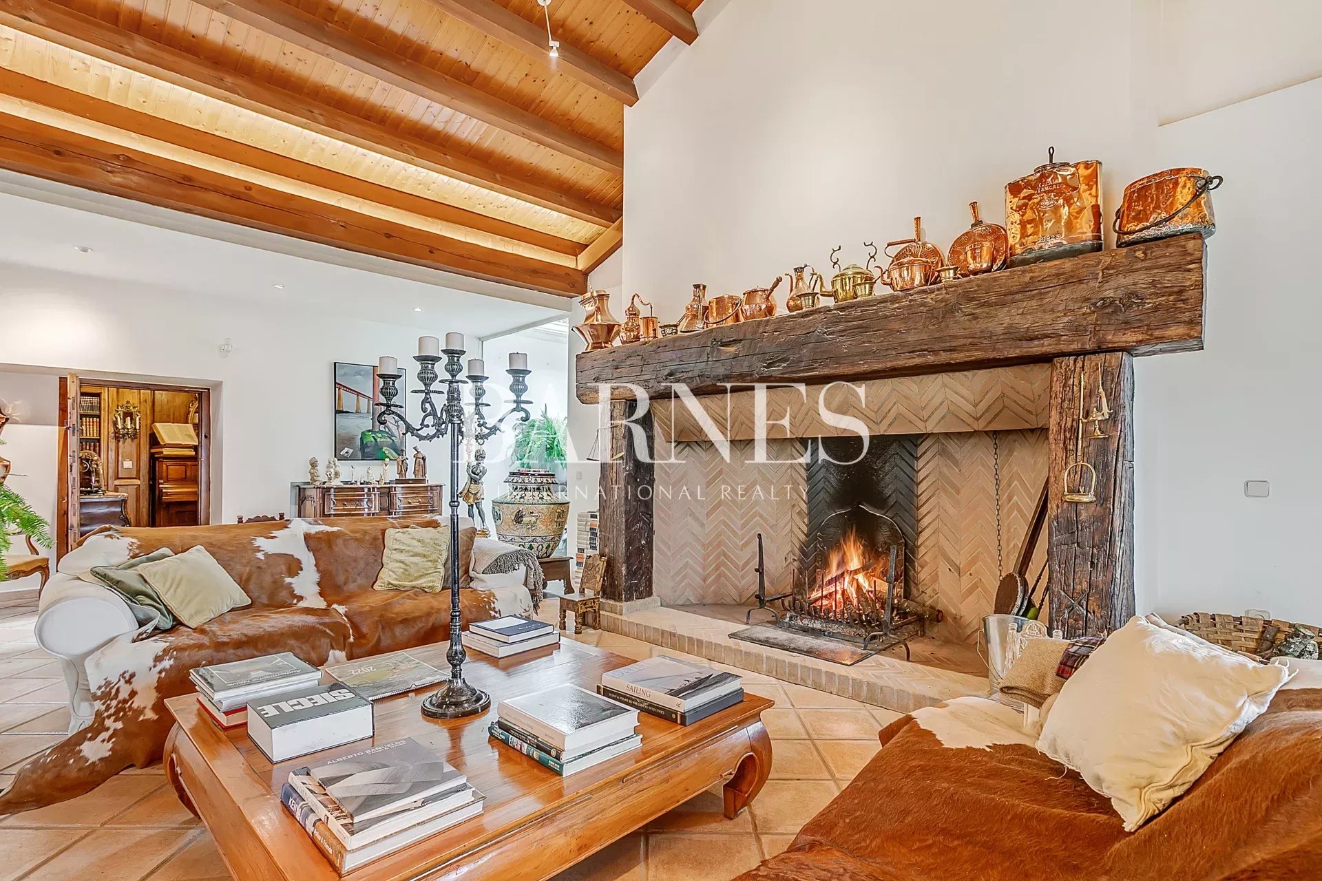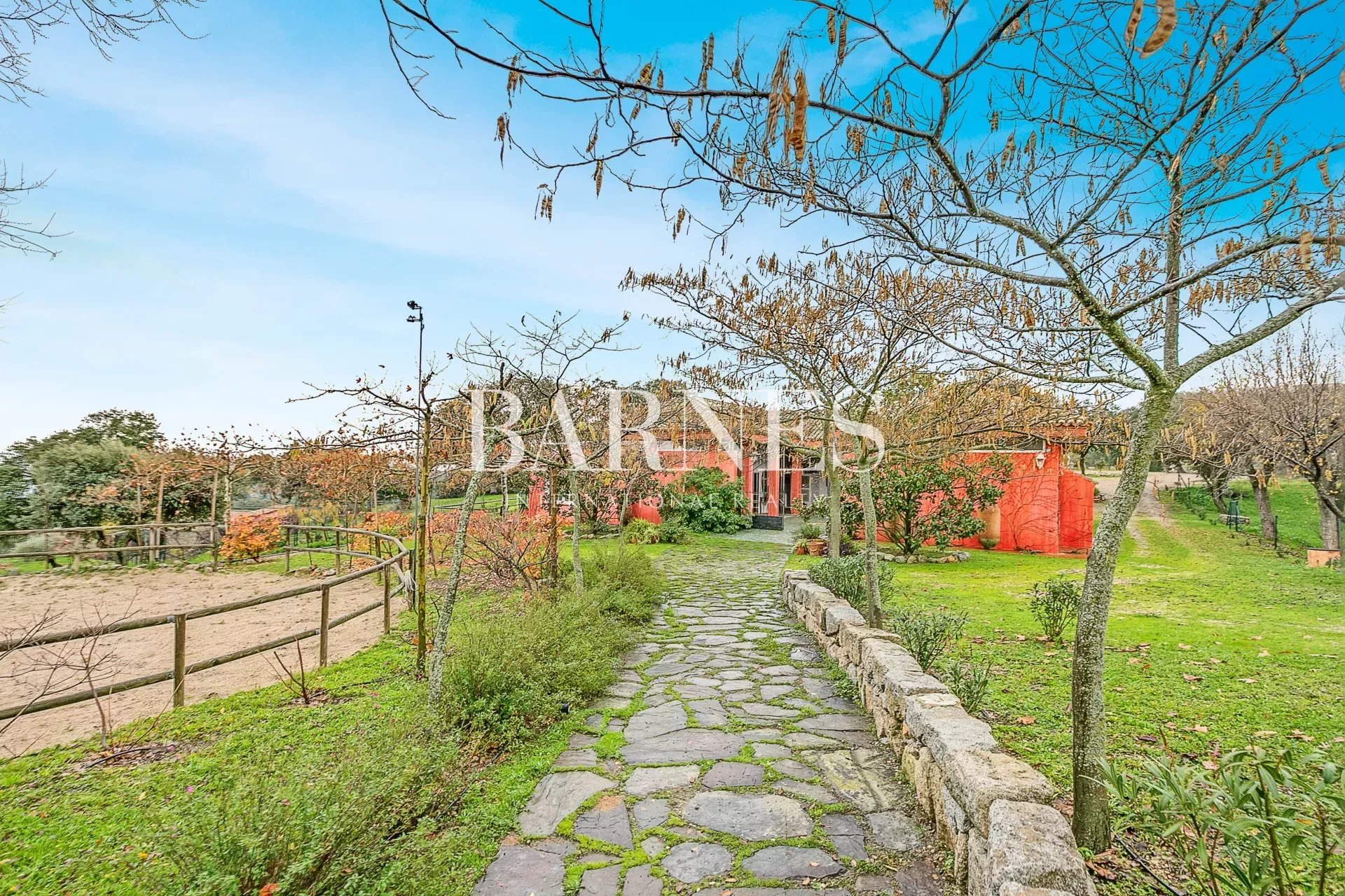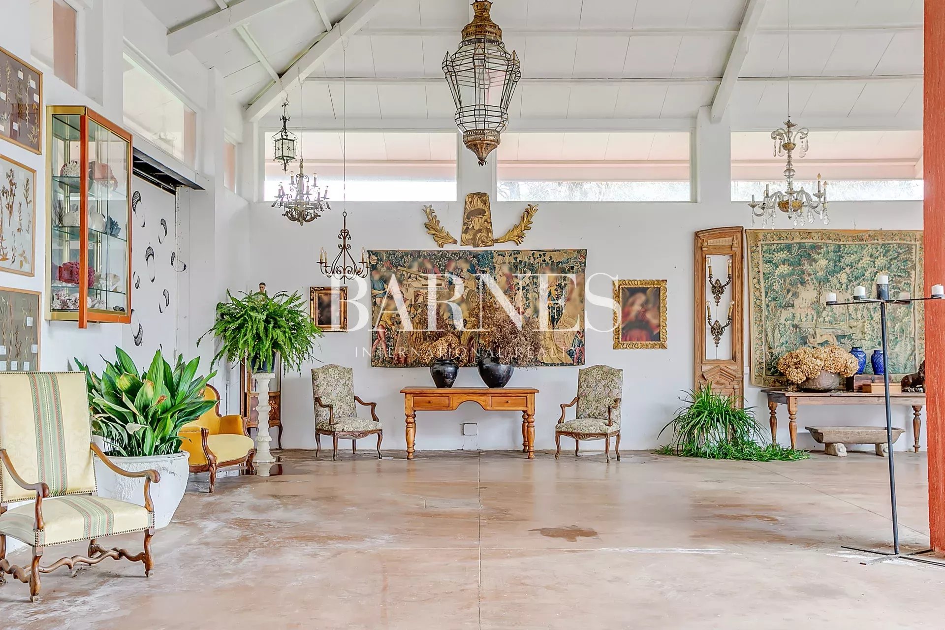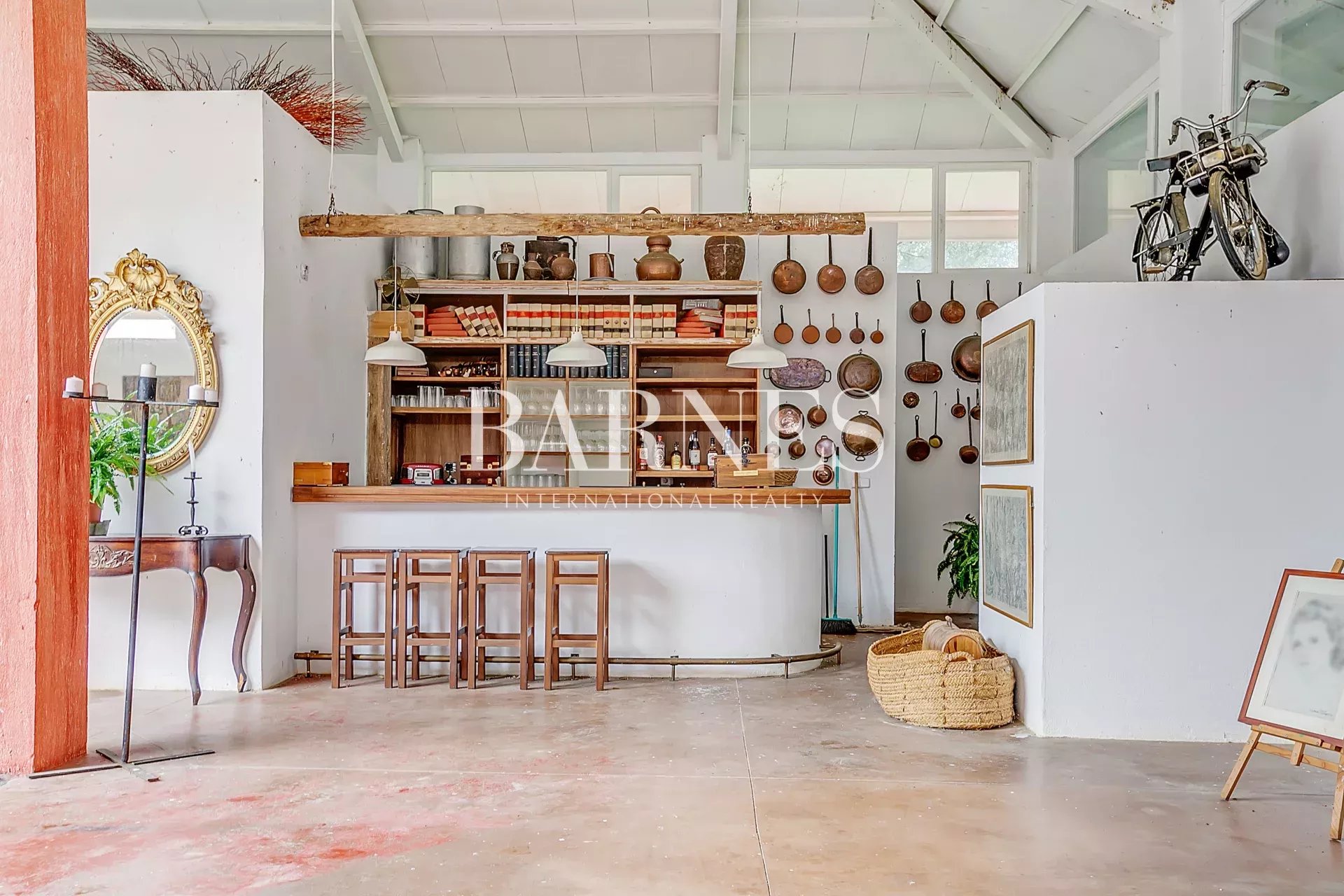 La lujosa vivienda principal está dividida en dos volúmenes: la antigua casa alberga una biblioteca revestida con maderas exóticas, cuarto de estar y despacho, comunicando con una construcción posterior de mayor amplitud y confort contemporáneo.