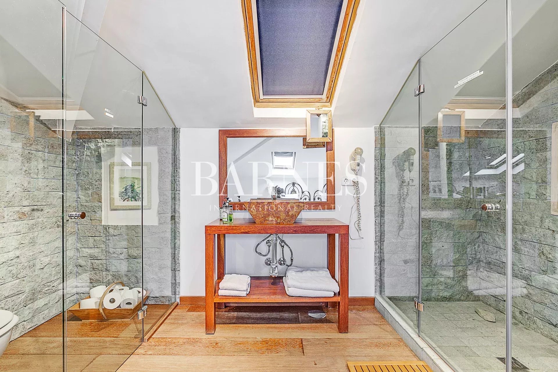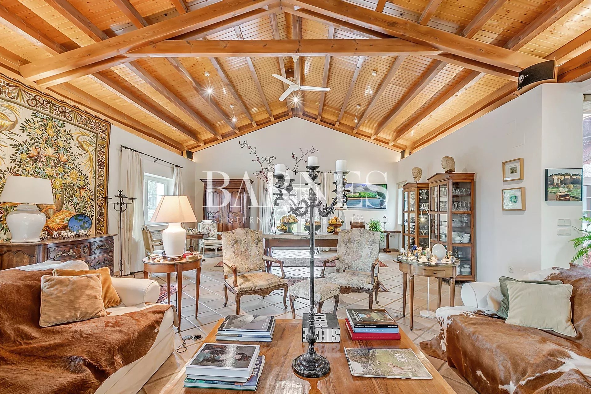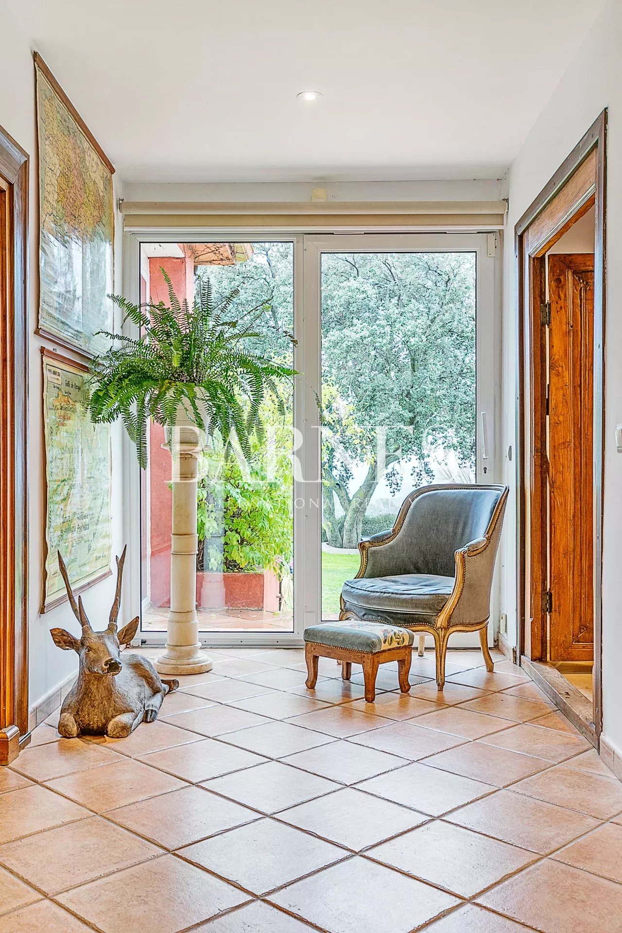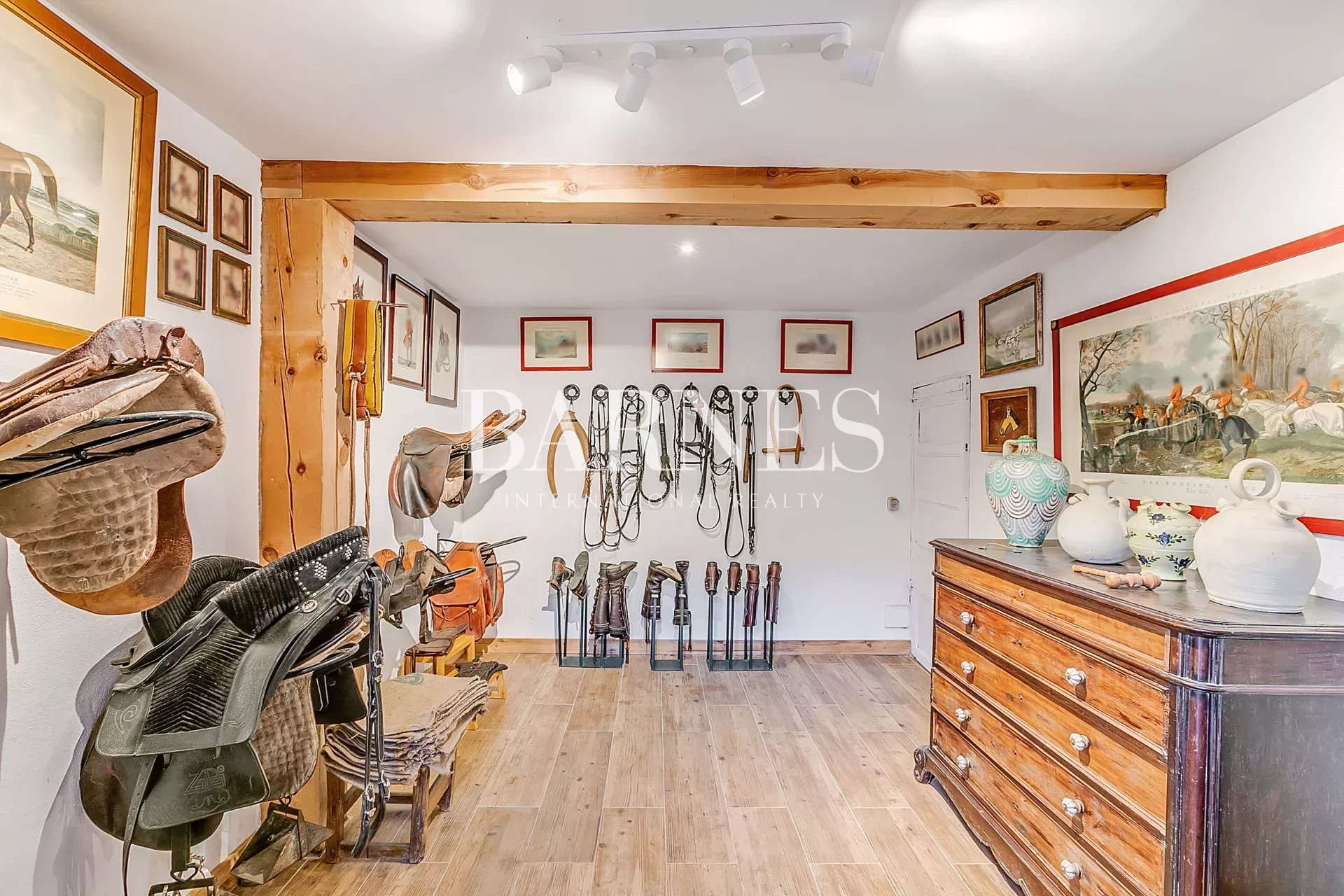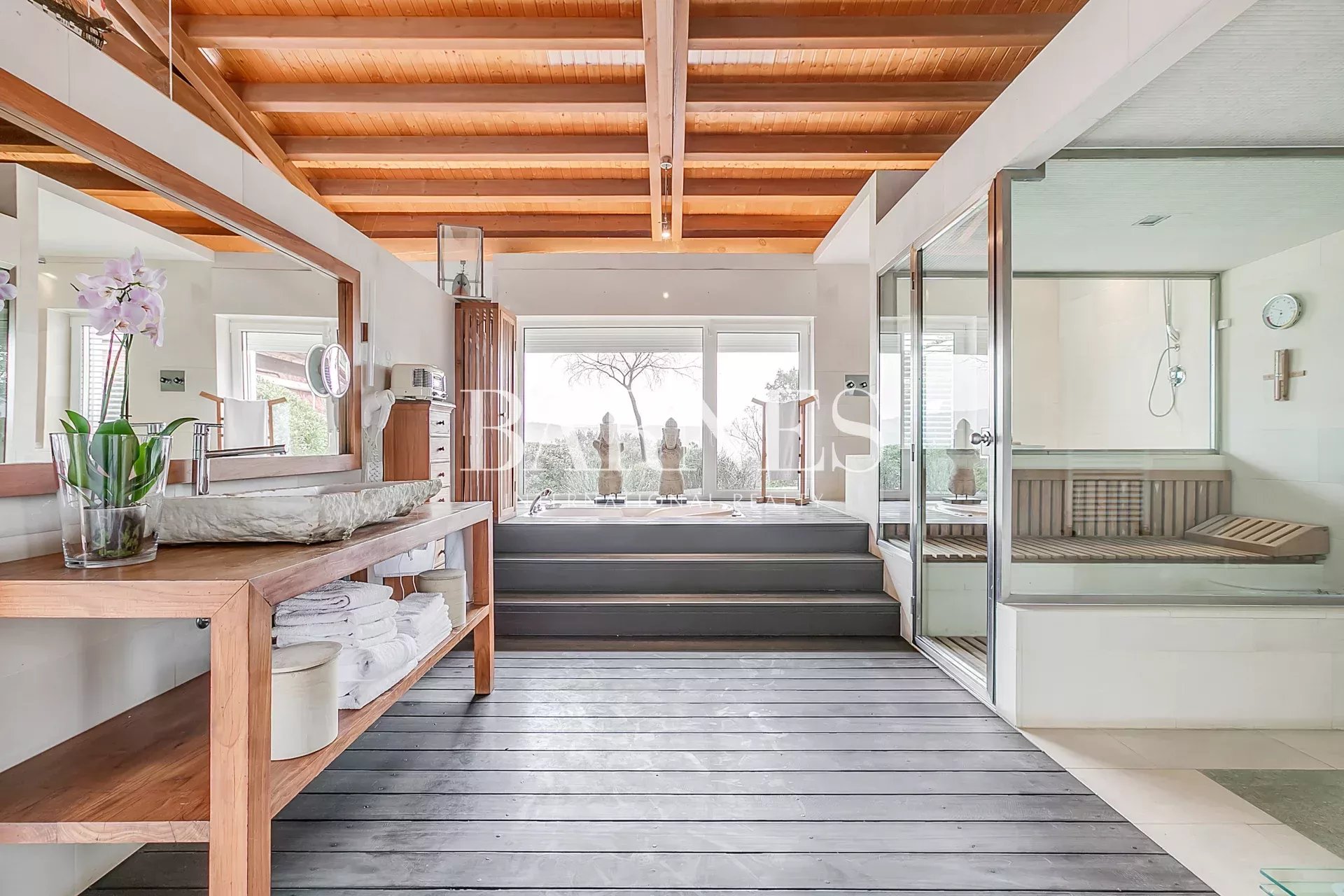 La lujosa vivienda principal está dividida en dos volúmenes: la antigua casa alberga una biblioteca revestida con maderas exóticas, cuarto de estar y despacho, comunicando con una construcción posterior de mayor amplitud y confort contemporáneo.