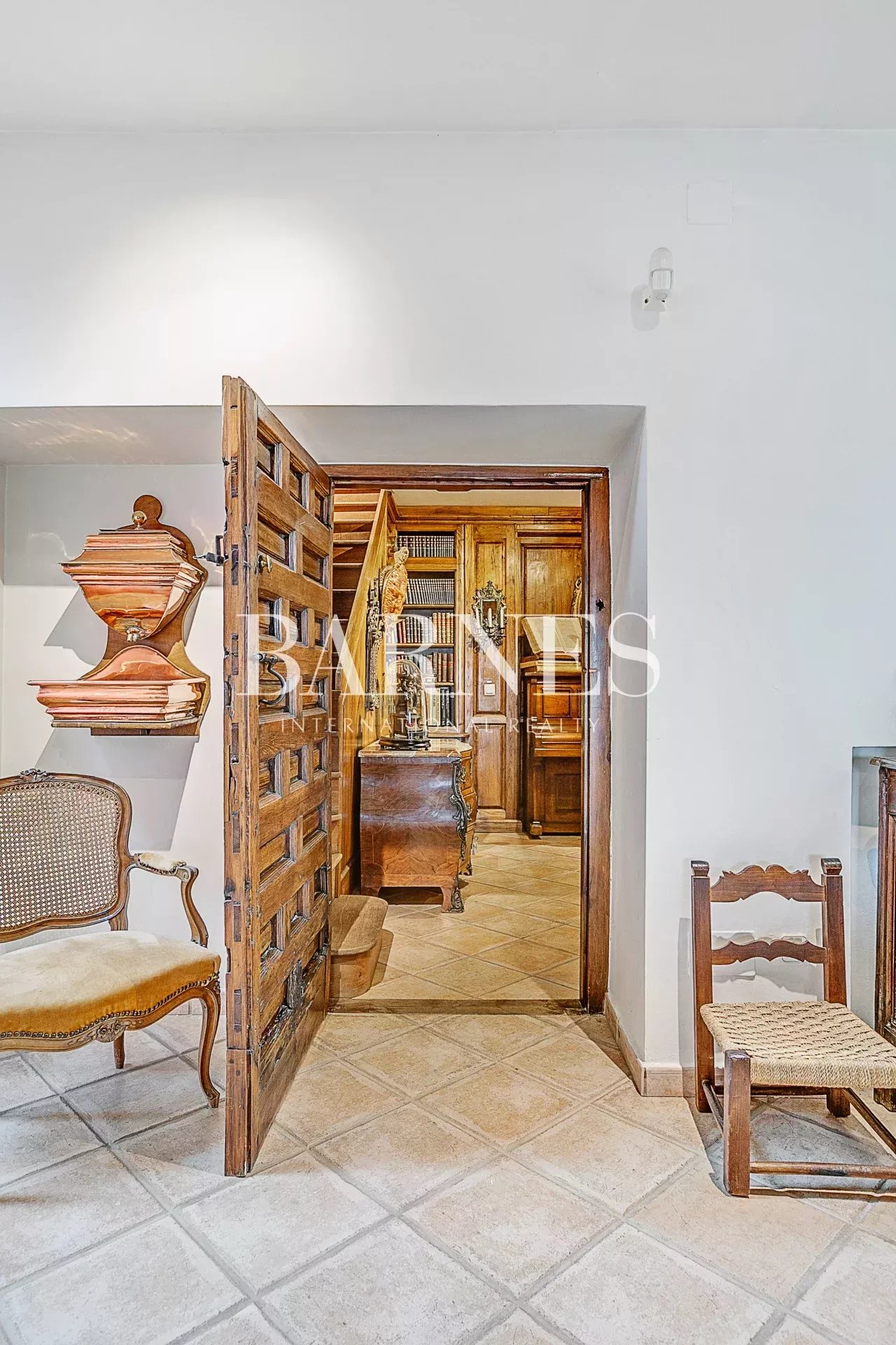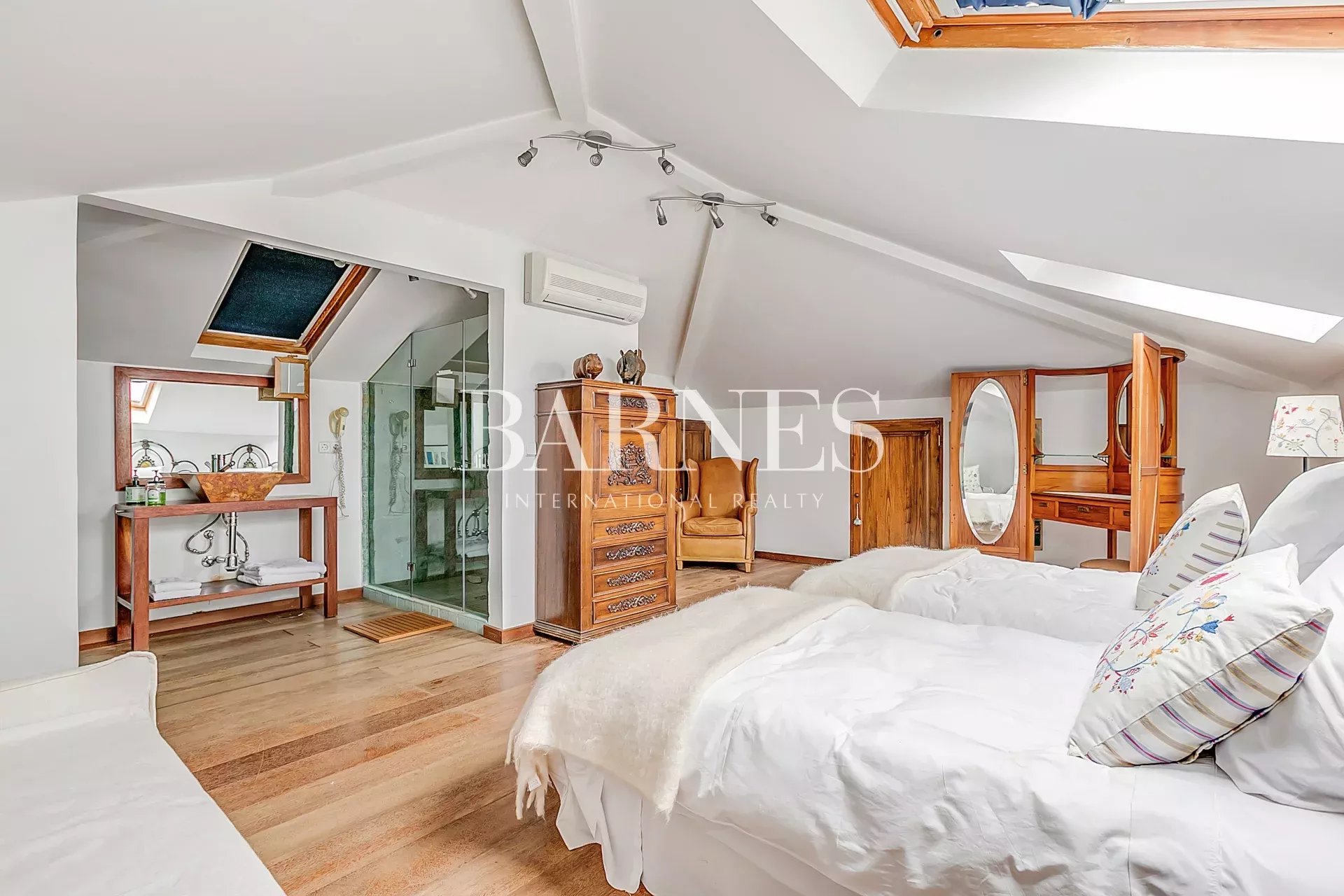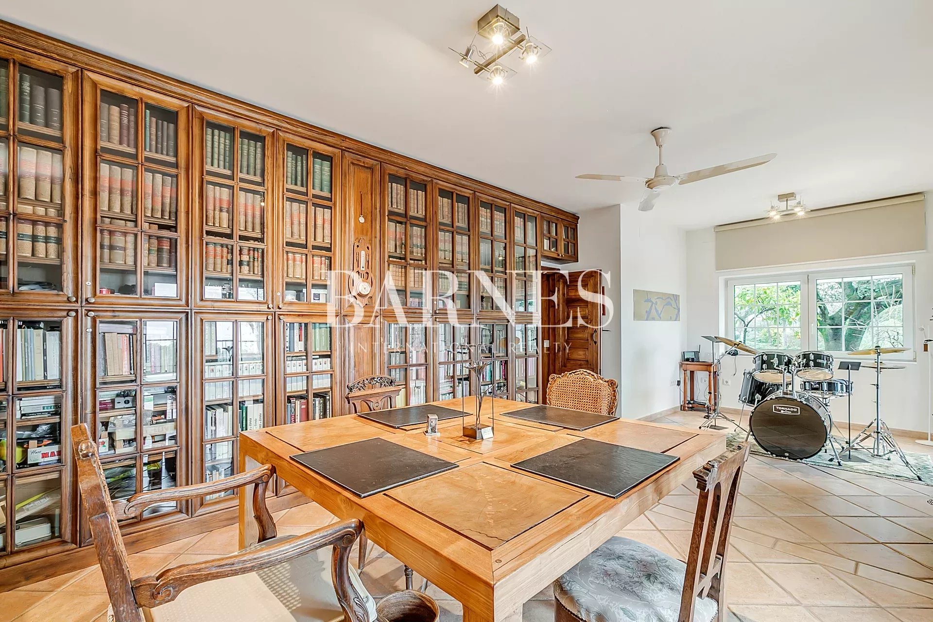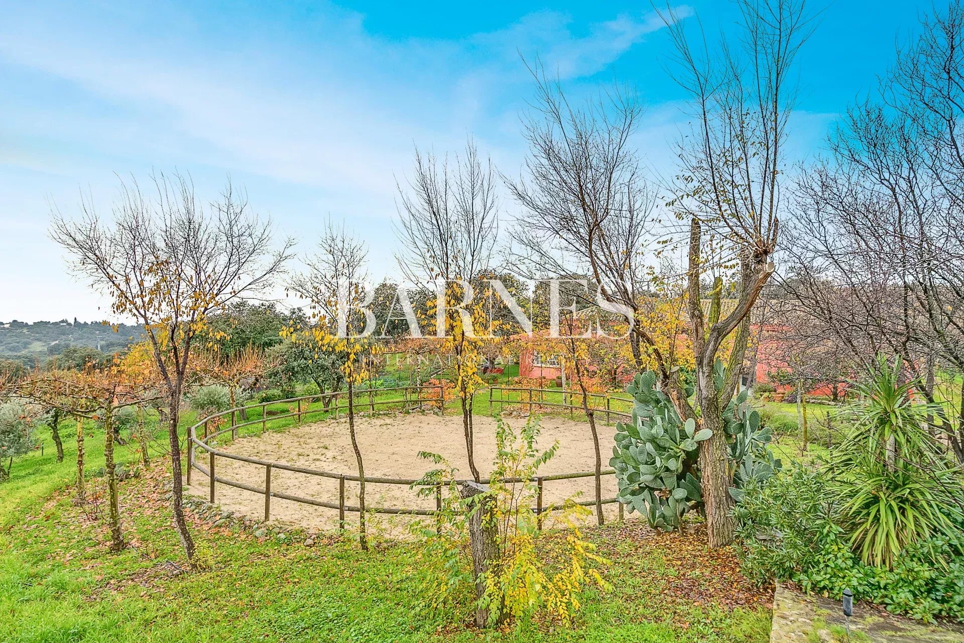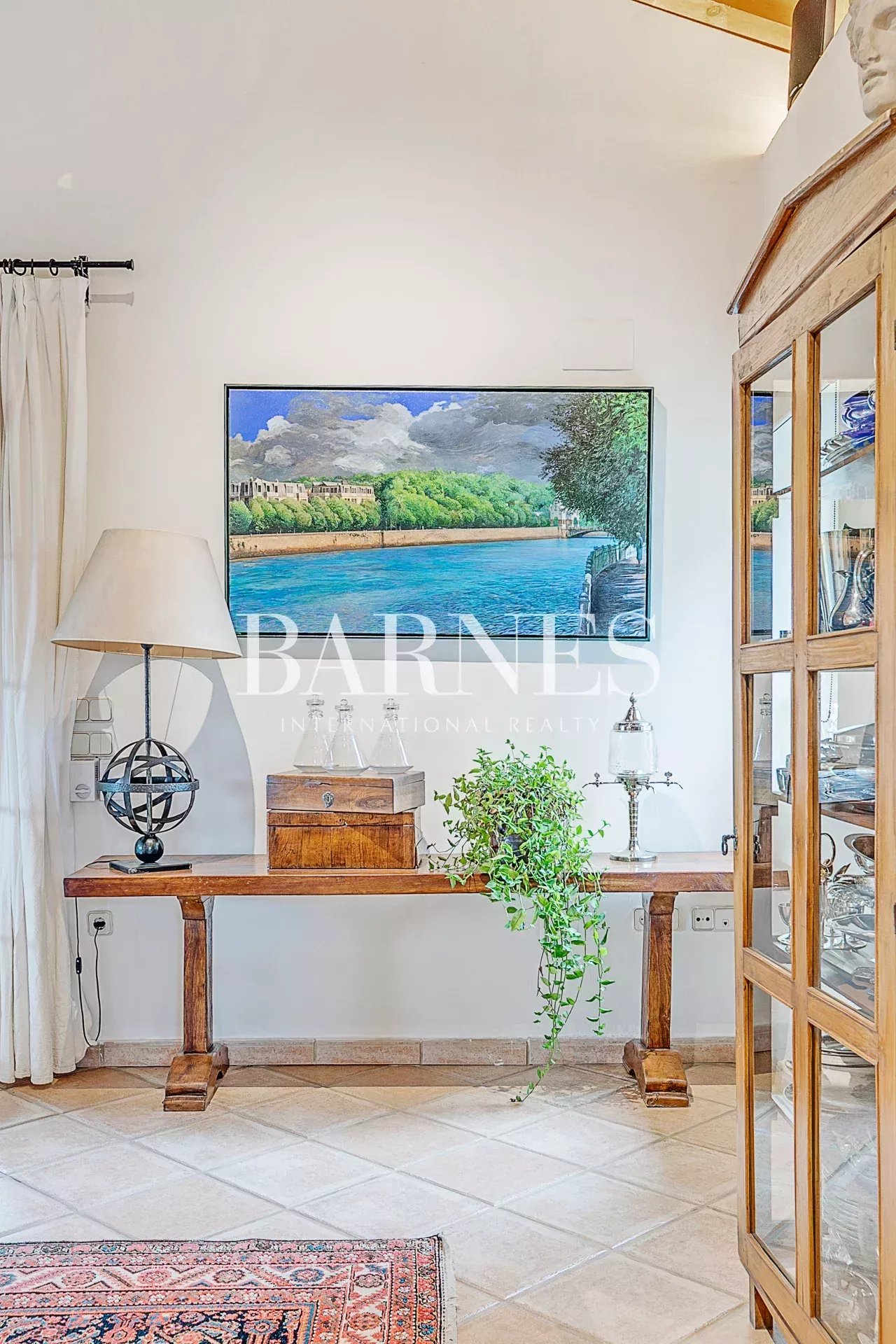 La lujosa vivienda principal está dividida en dos volúmenes: la antigua casa alberga una biblioteca revestida con maderas exóticas, cuarto de estar y despacho, comunicando con una construcción posterior de mayor amplitud y confort contemporáneo.