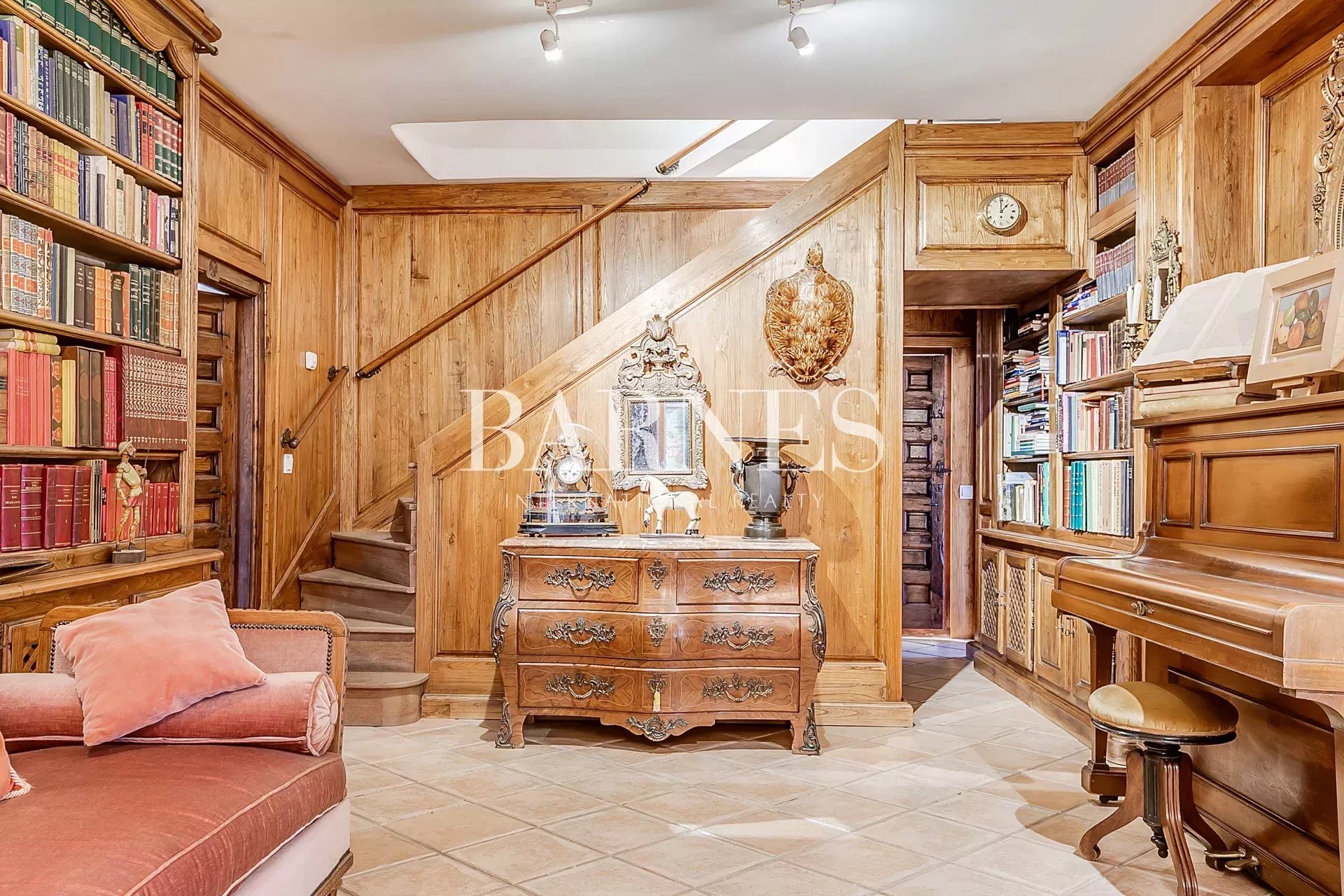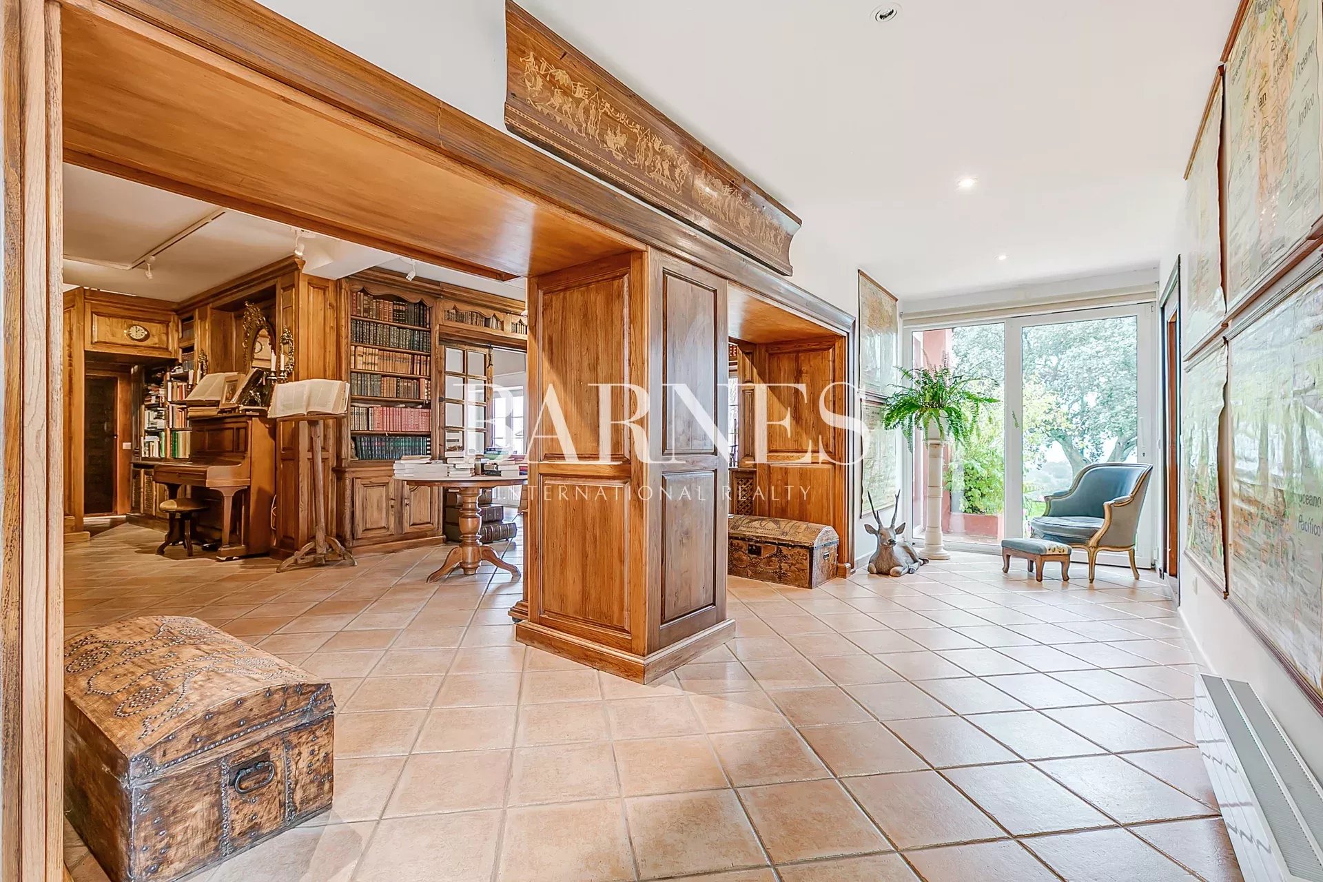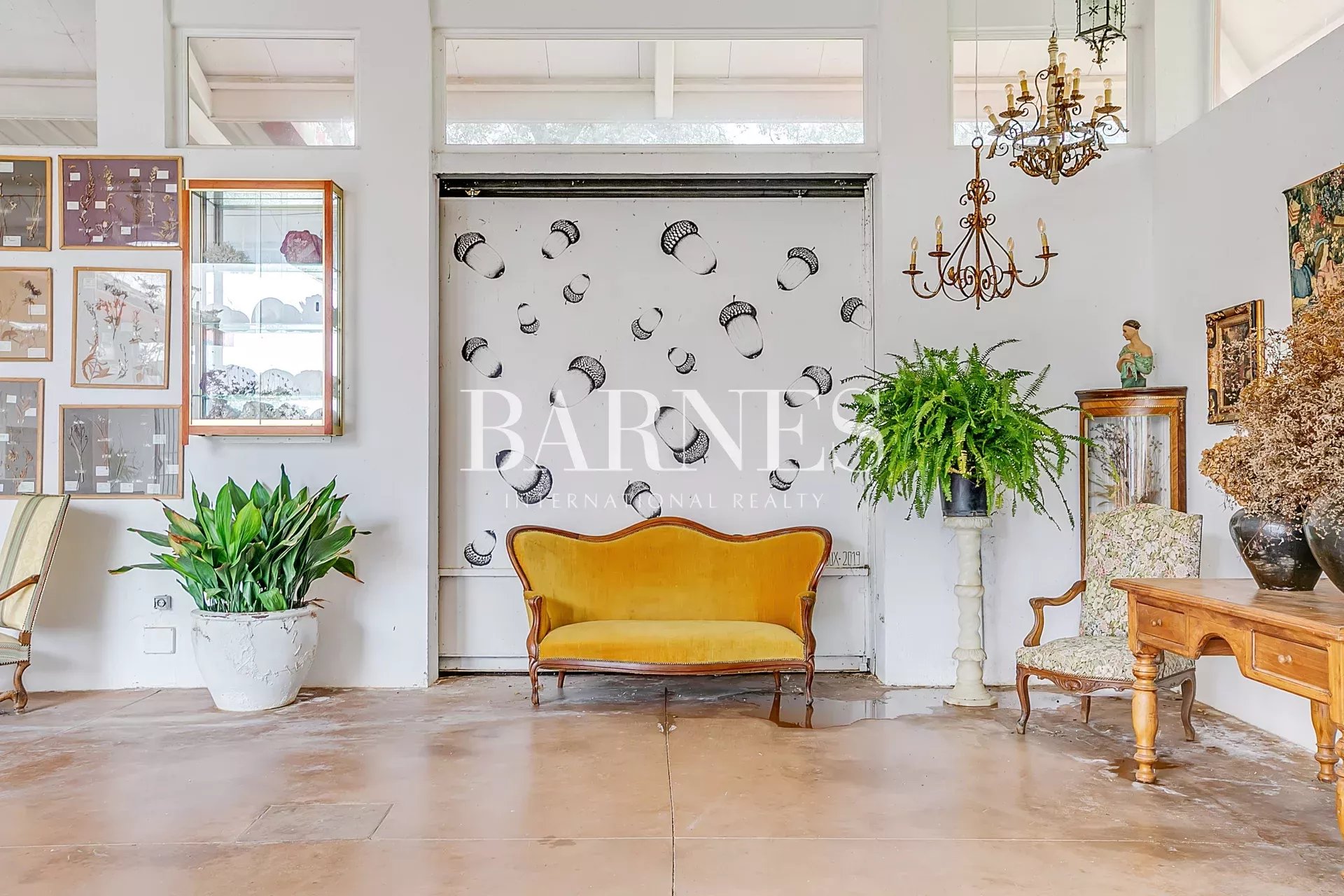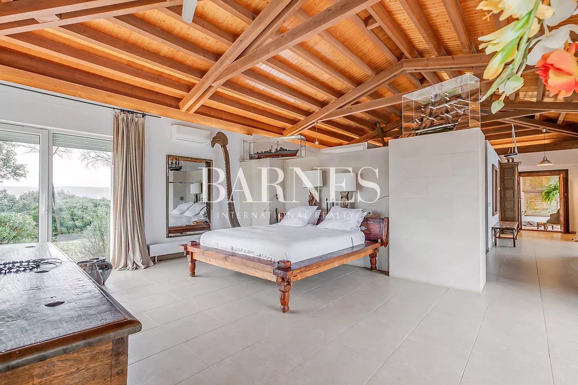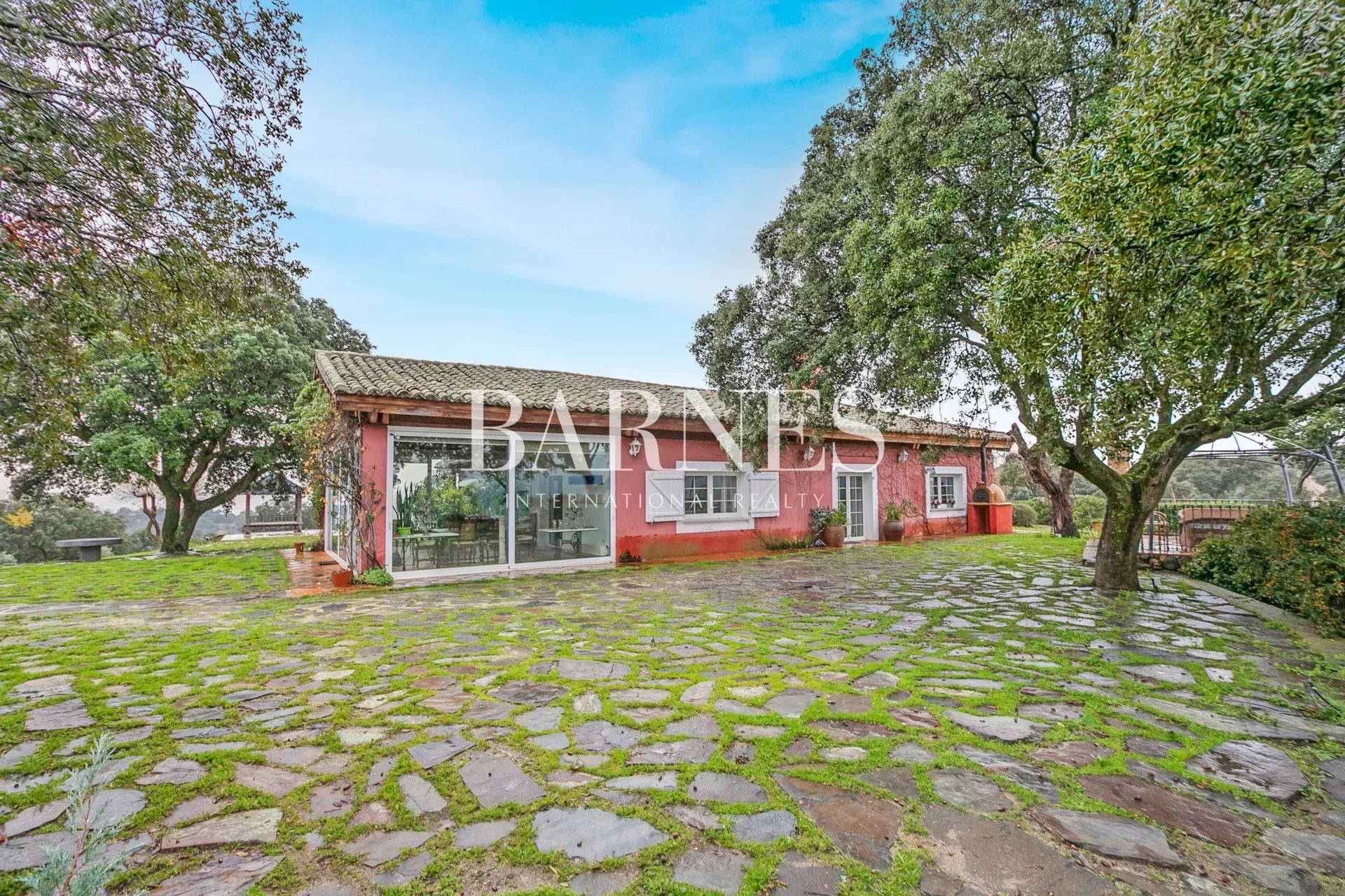 La lujosa vivienda principal está dividida en dos volúmenes: la antigua casa alberga una biblioteca revestida con maderas exóticas, cuarto de estar y despacho, comunicando con una construcción posterior de mayor amplitud y confort contemporáneo.