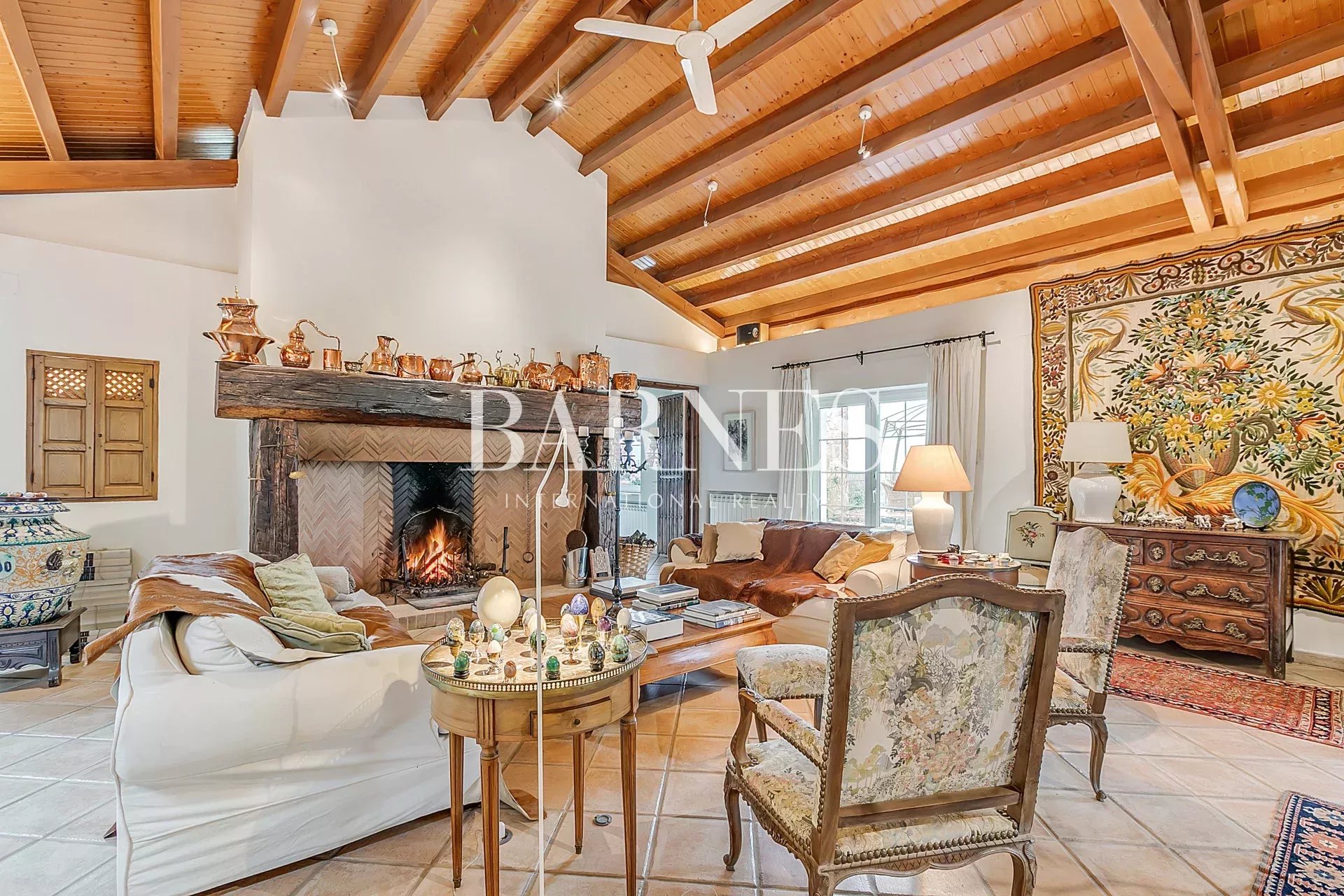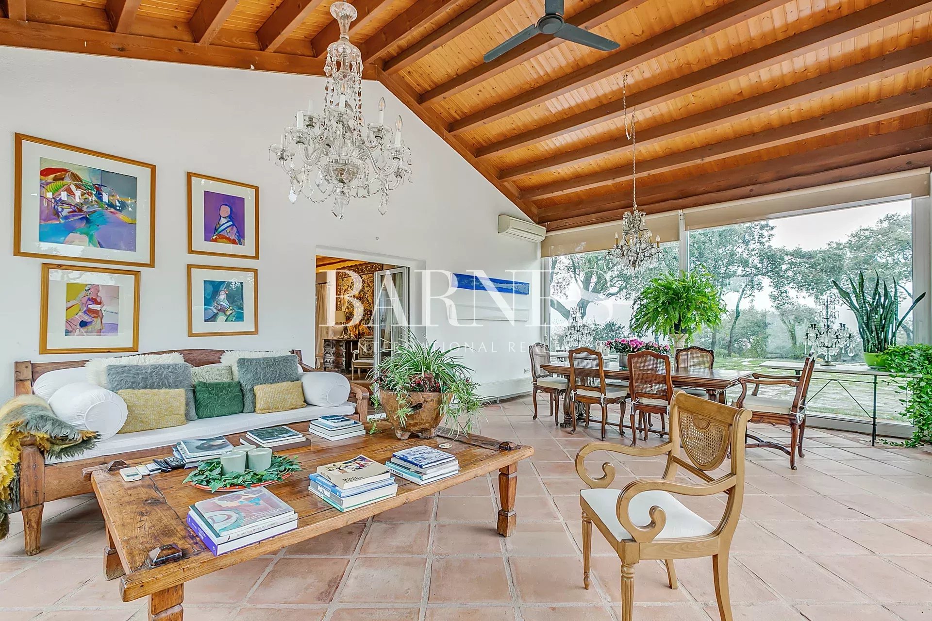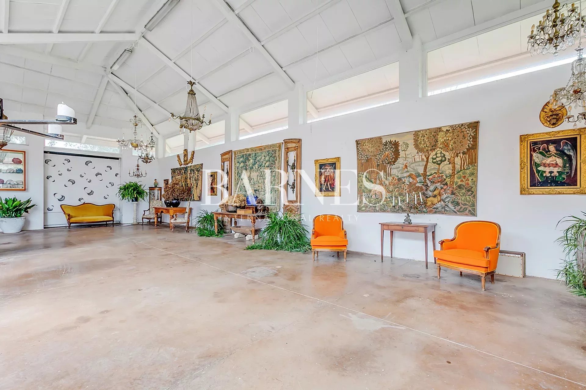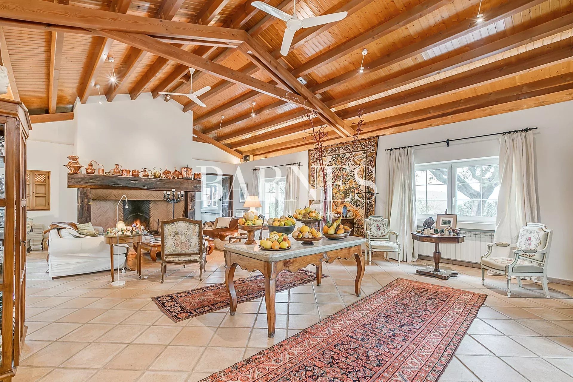 La lujosa vivienda principal está dividida en dos volúmenes: la antigua casa alberga una biblioteca revestida con maderas exóticas, cuarto de estar y despacho, comunicando con una construcción posterior de mayor amplitud y confort contemporáneo.