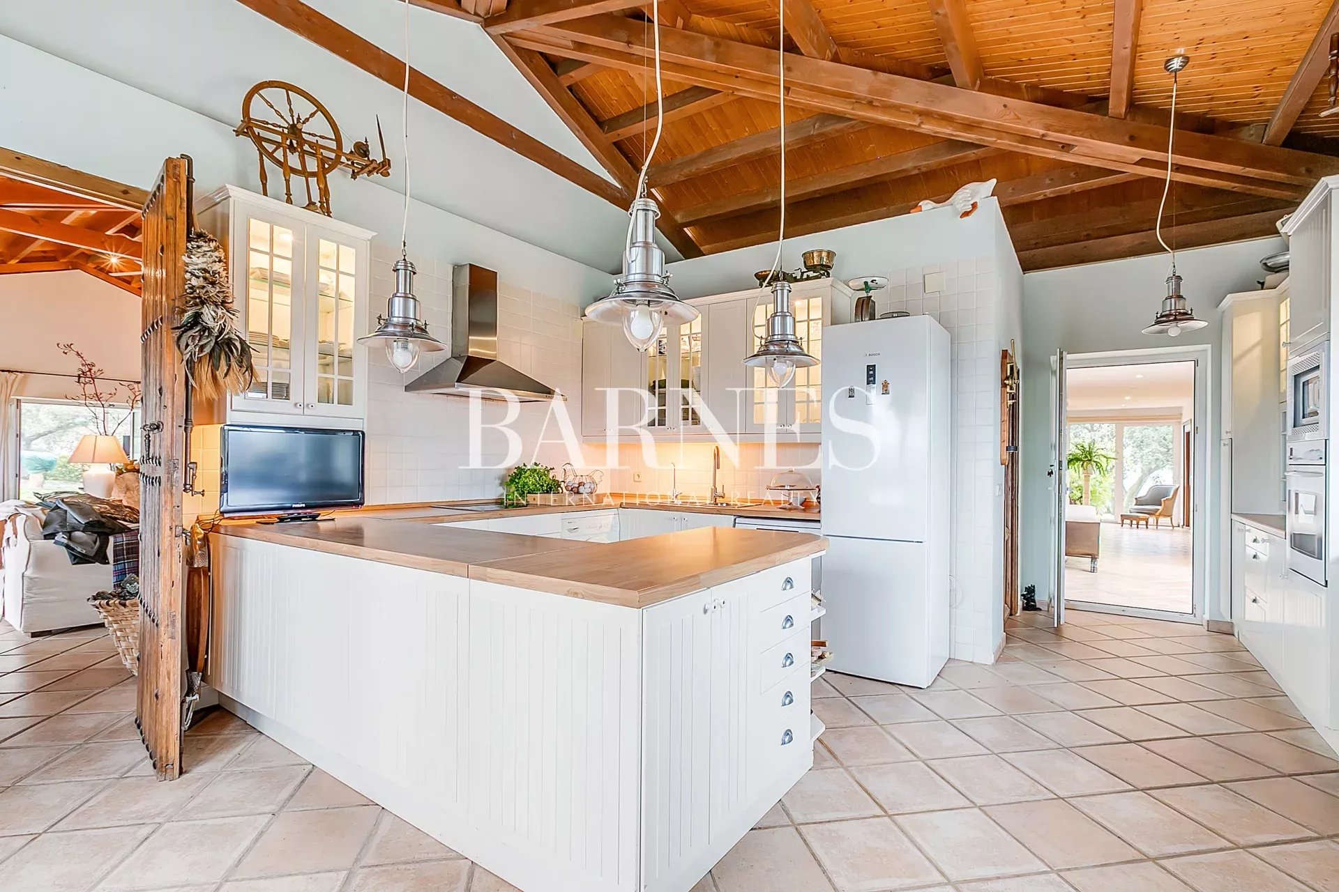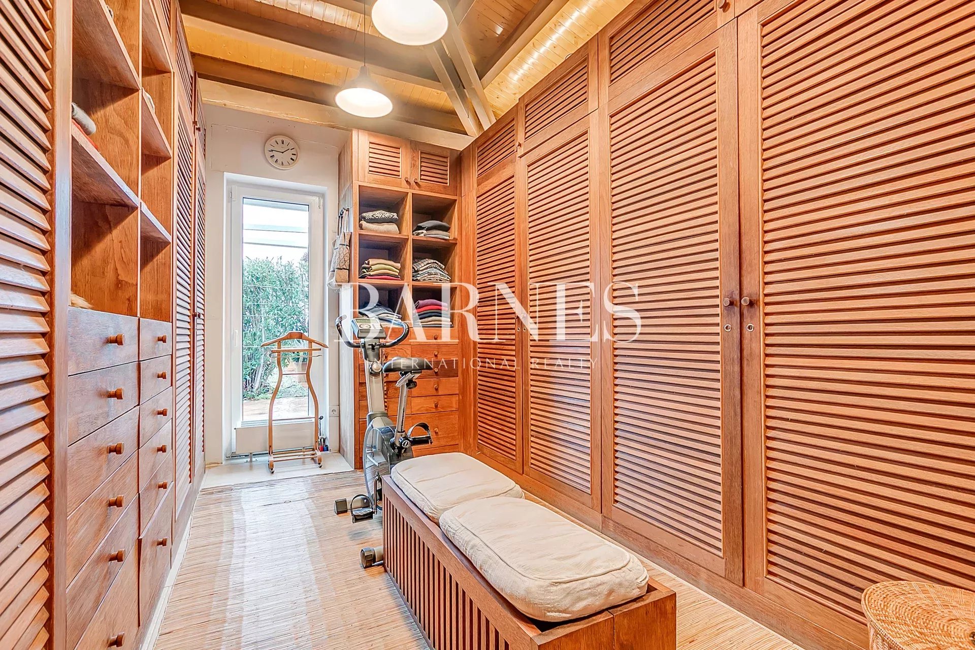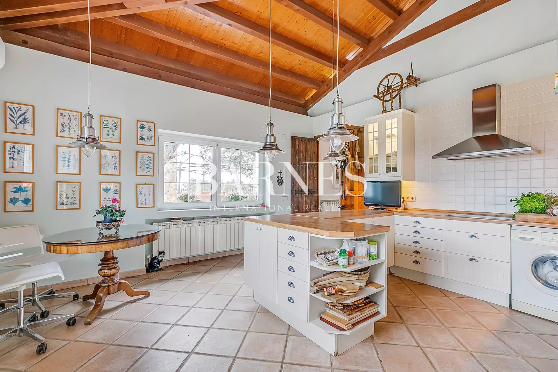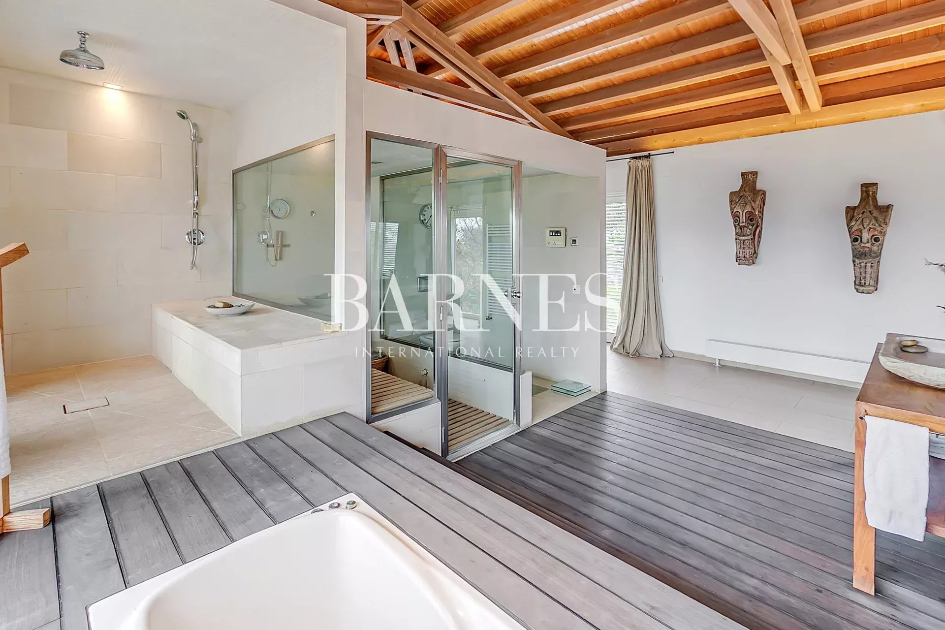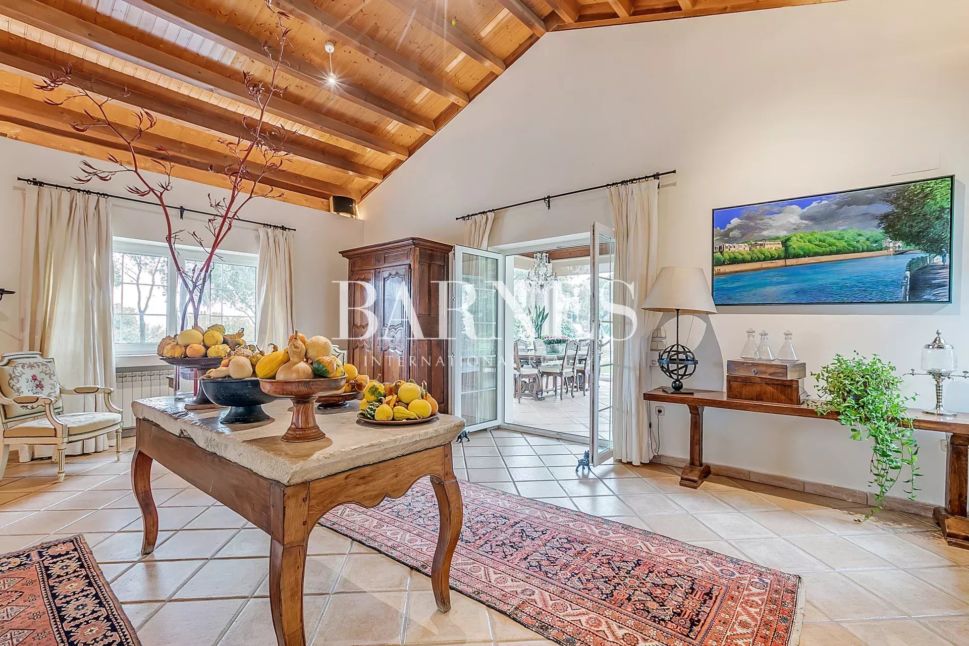 La lujosa vivienda principal está dividida en dos volúmenes: la antigua casa alberga una biblioteca revestida con maderas exóticas, cuarto de estar y despacho, comunicando con una construcción posterior de mayor amplitud y confort contemporáneo.