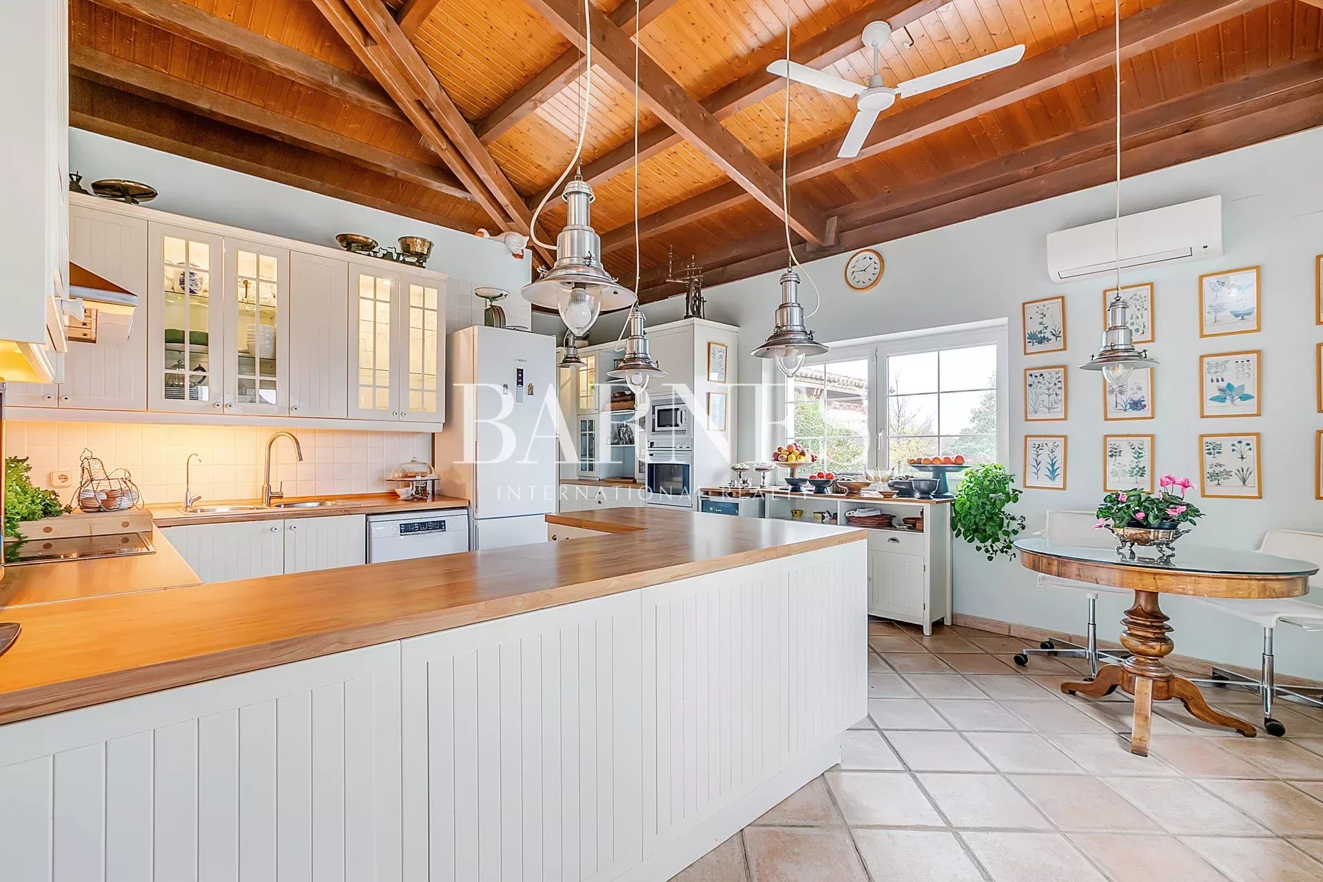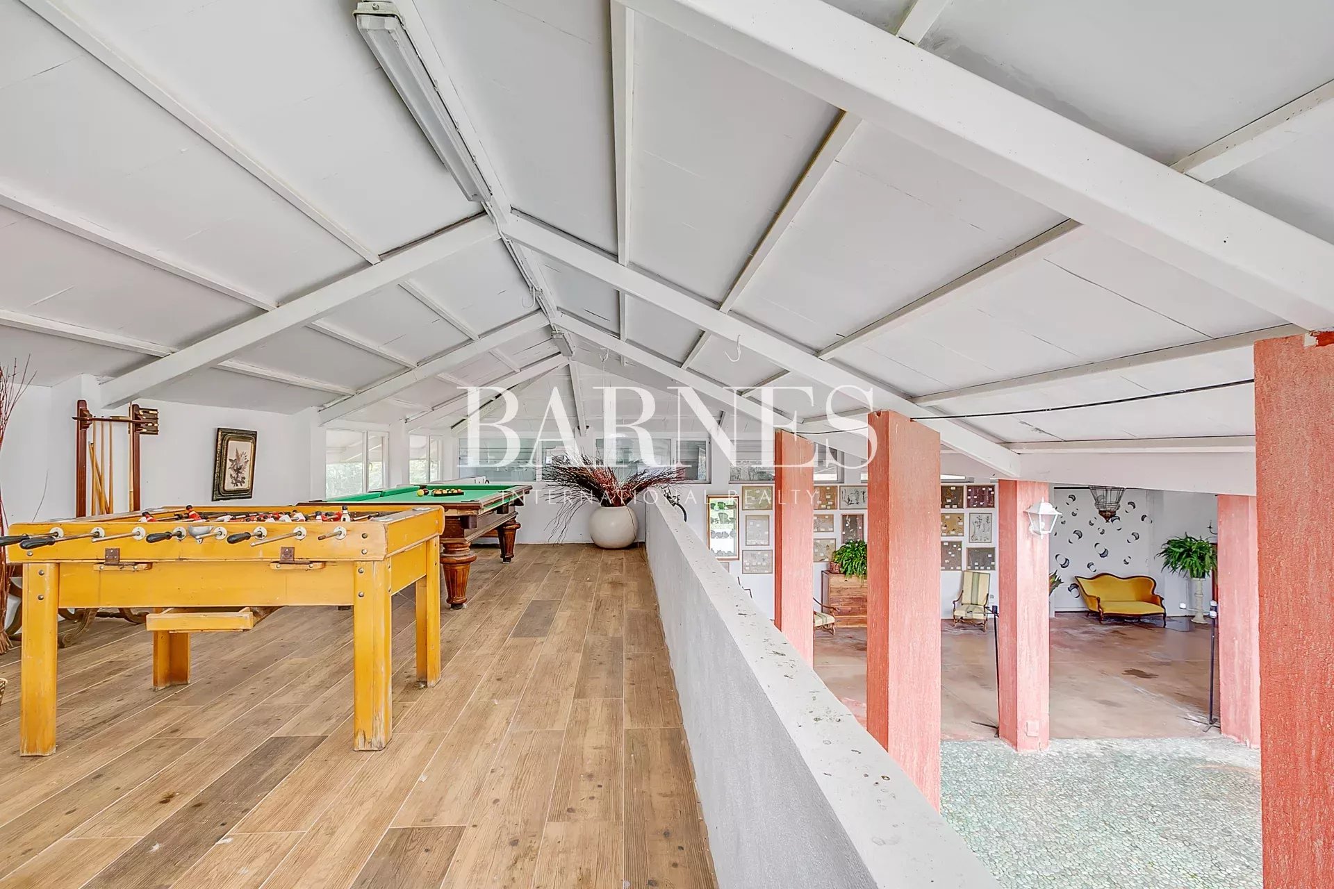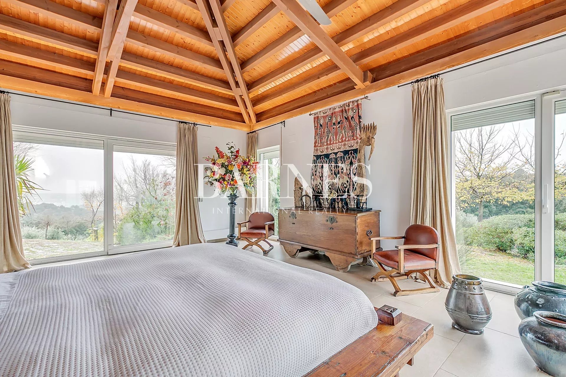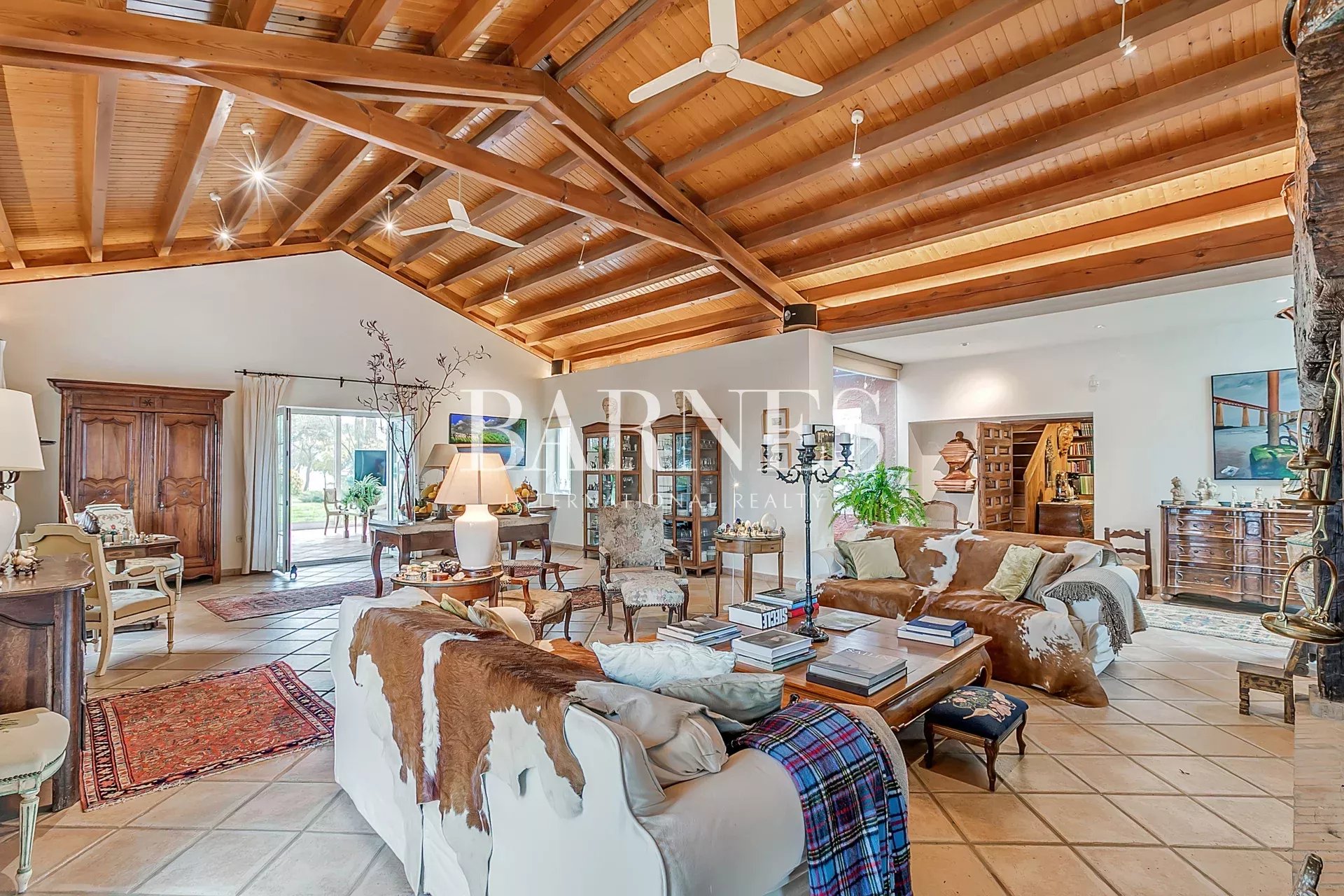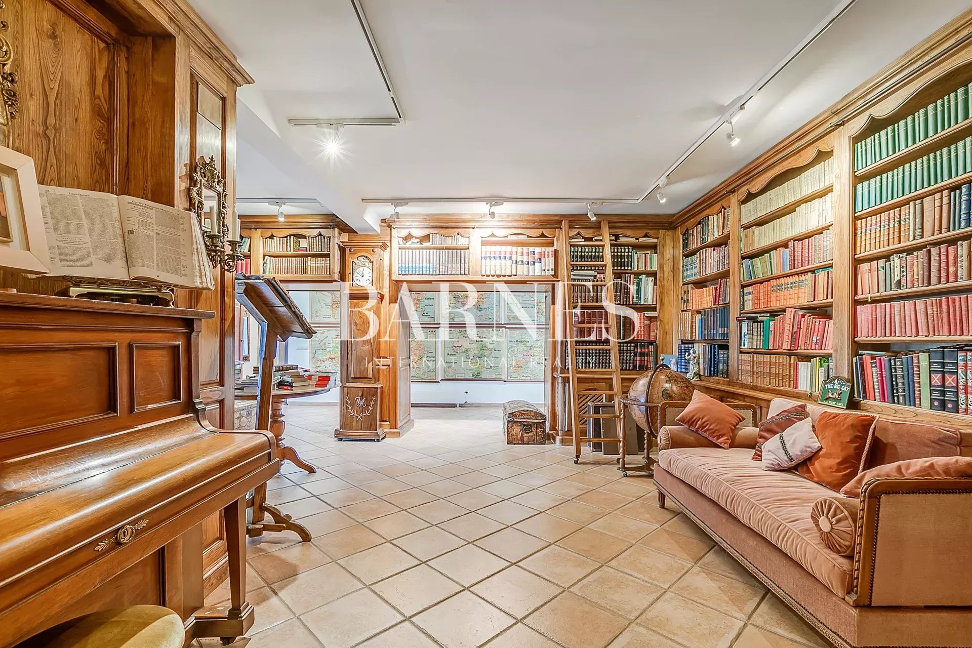 La lujosa vivienda principal está dividida en dos volúmenes: la antigua casa alberga una biblioteca revestida con maderas exóticas, cuarto de estar y despacho, comunicando con una construcción posterior de mayor amplitud y confort contemporáneo.