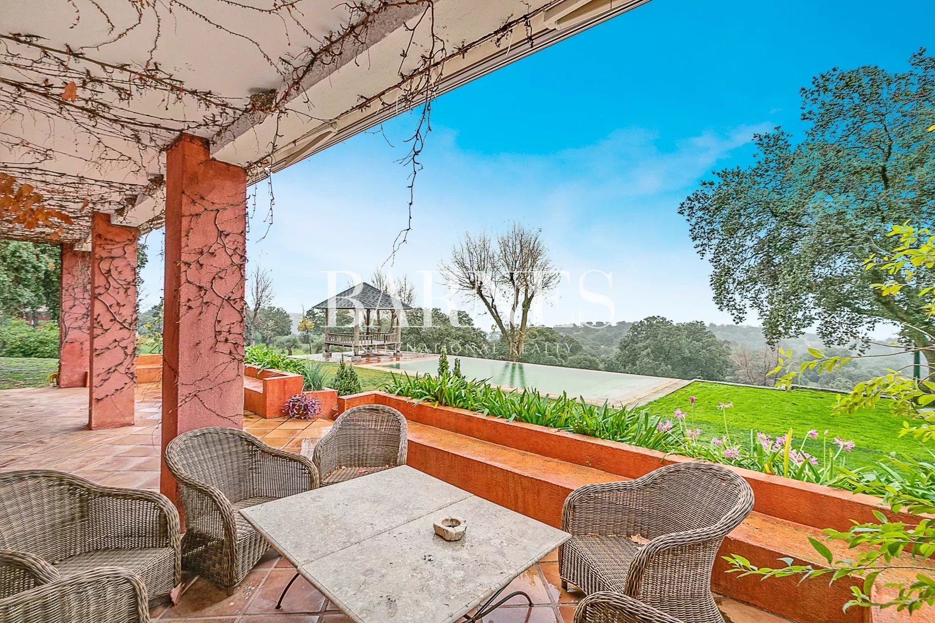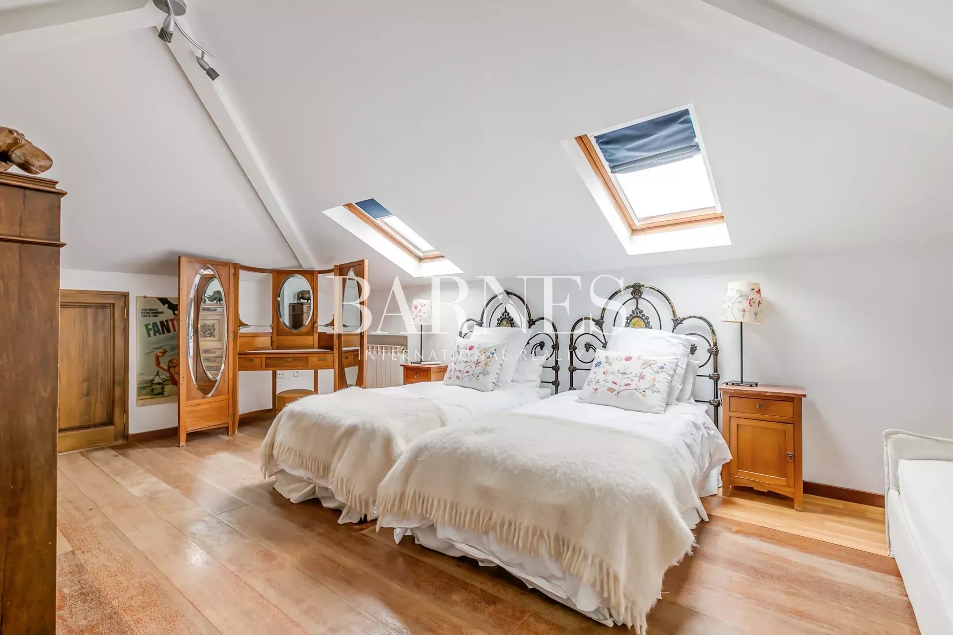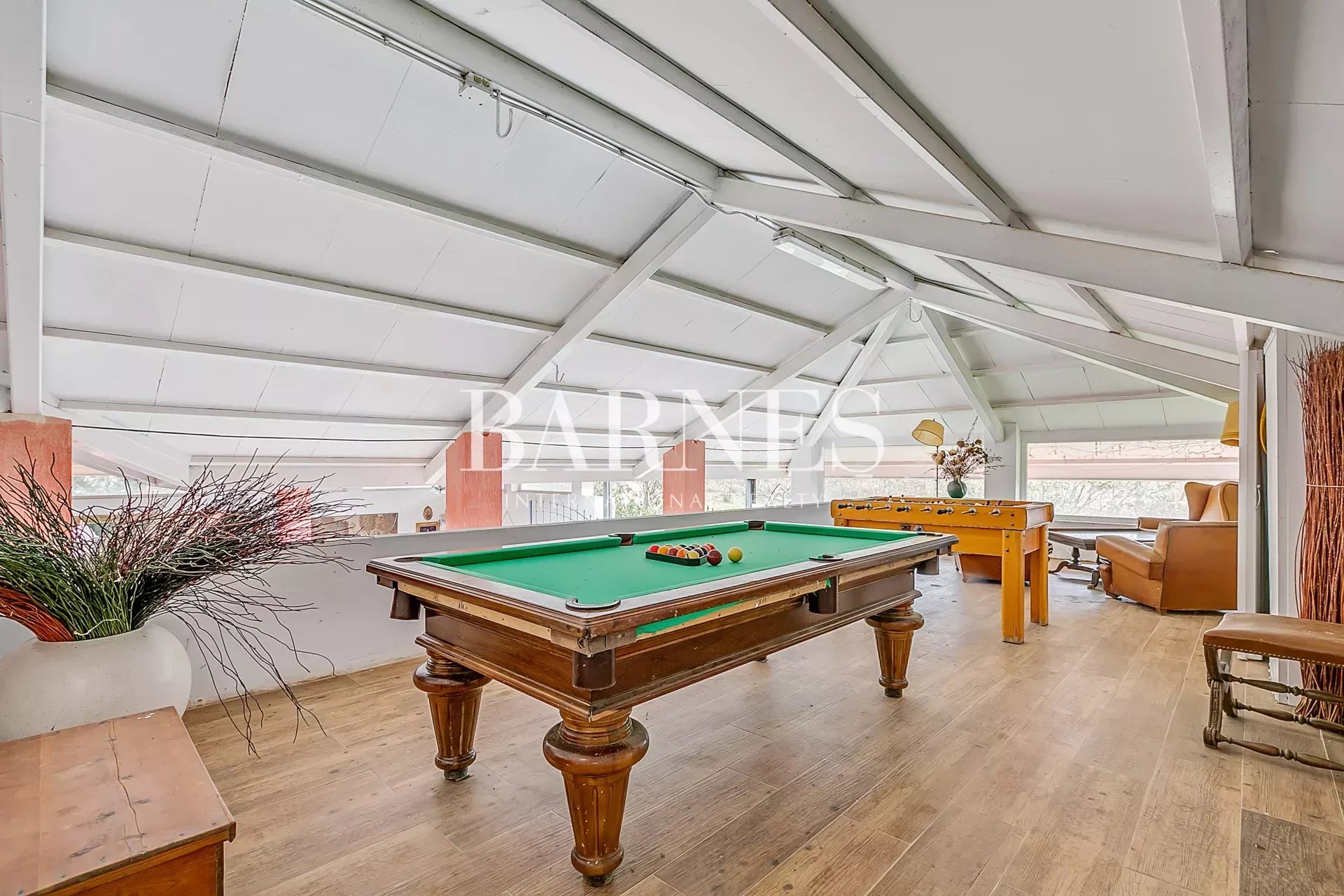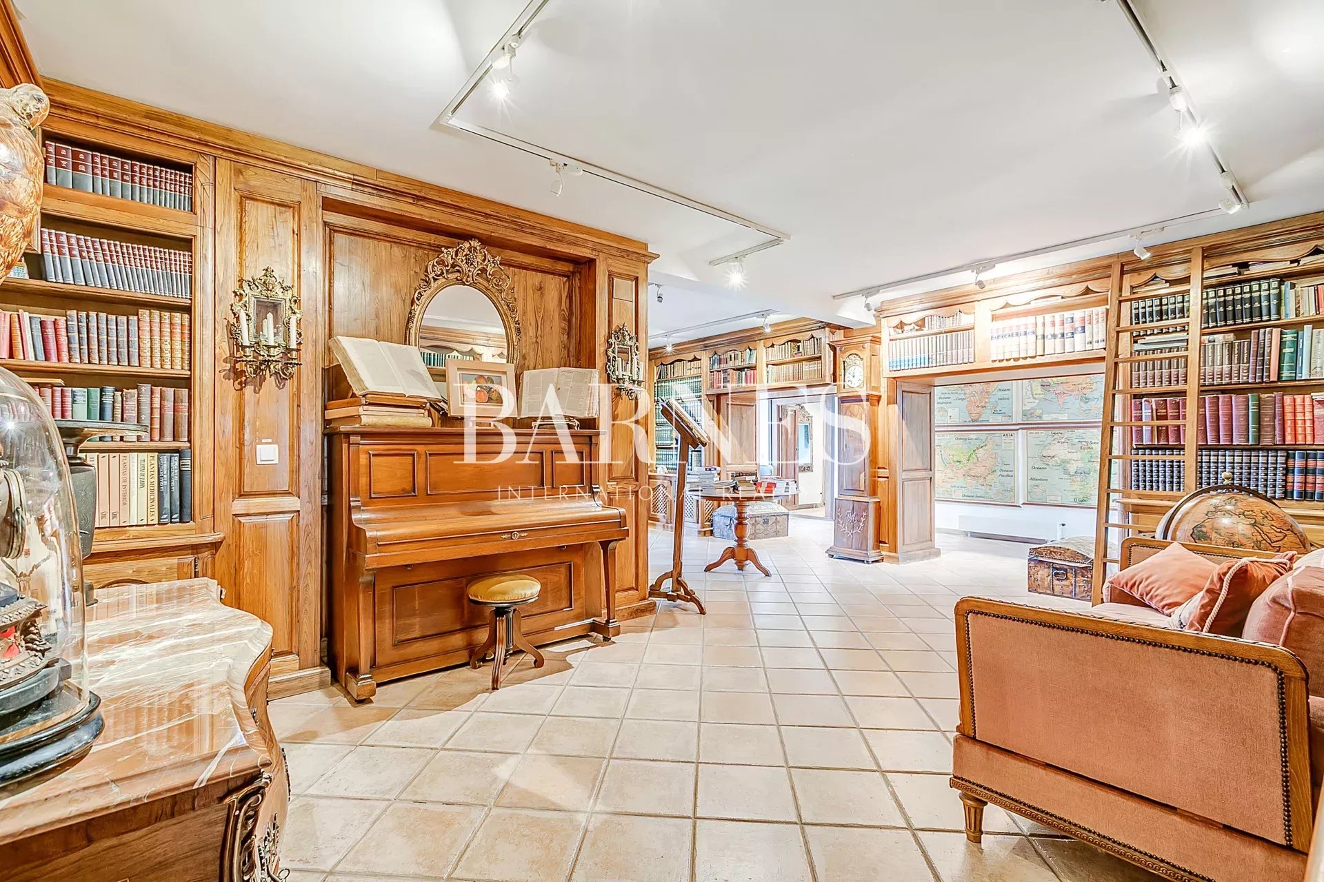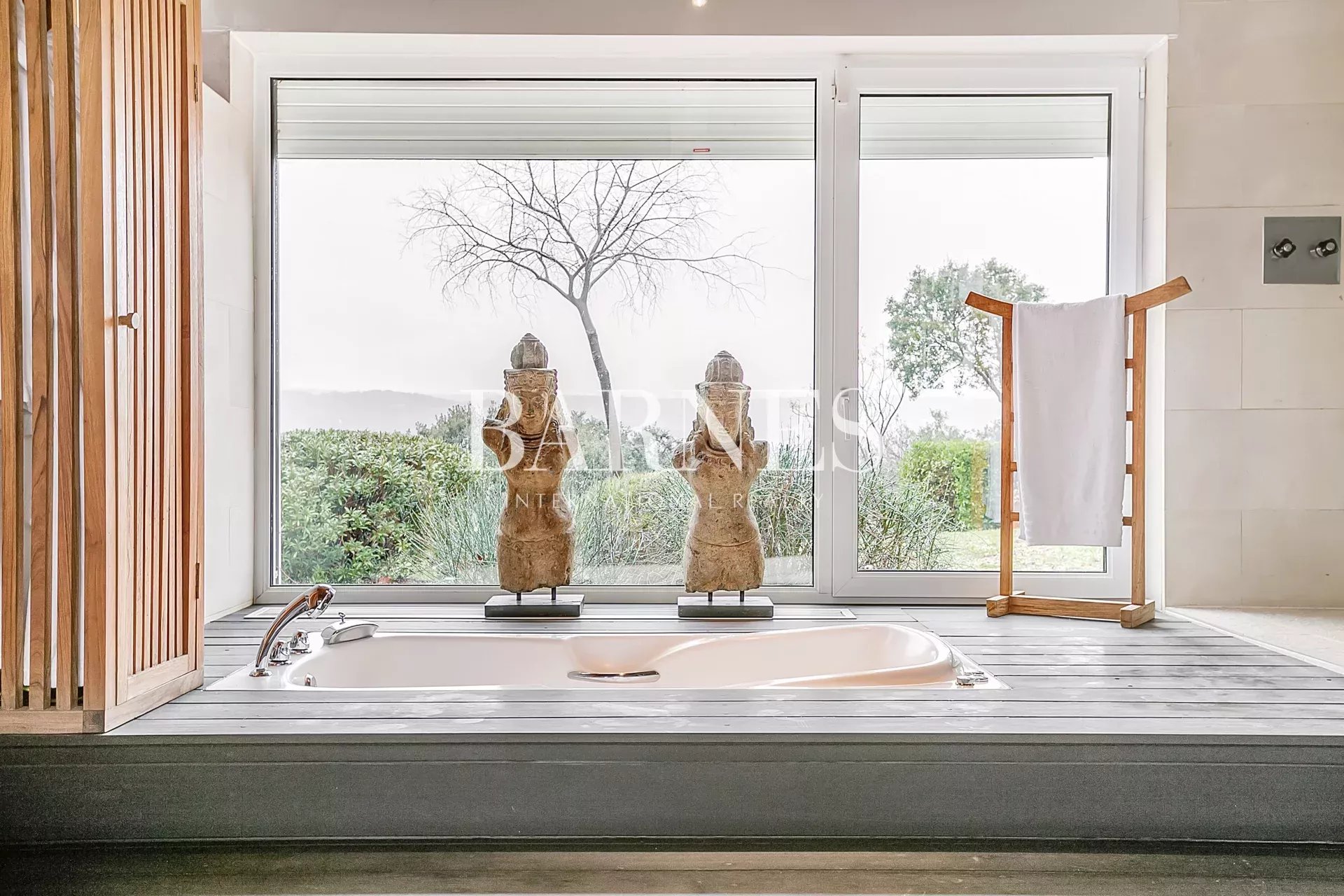 La lujosa vivienda principal está dividida en dos volúmenes: la antigua casa alberga una biblioteca revestida con maderas exóticas, cuarto de estar y despacho, comunicando con una construcción posterior de mayor amplitud y confort contemporáneo.
