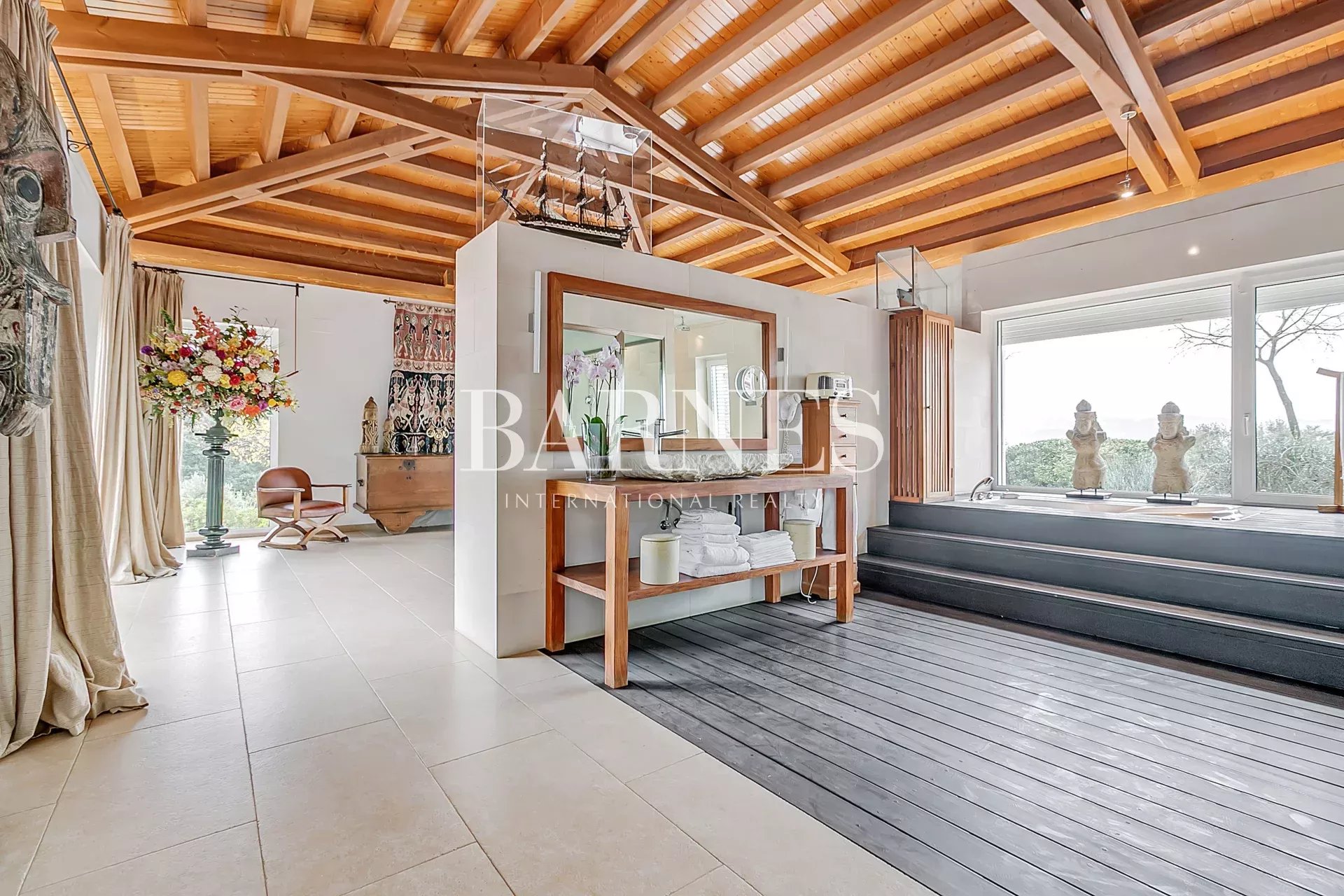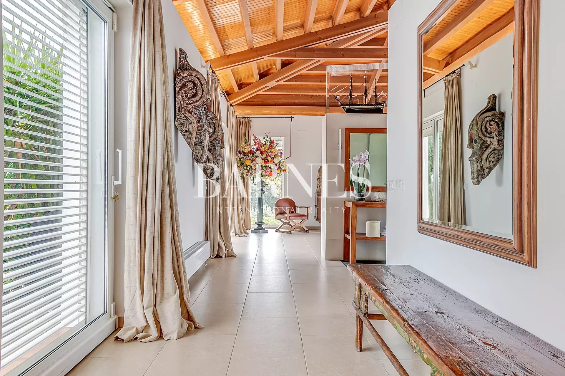 El diseño interior fusiona estilo rústico refinado con influencias de Bali, incorporando elementos decorativos y mobiliario original traído desde Indonesia, así como antigüedades francesas del siglo XVII.