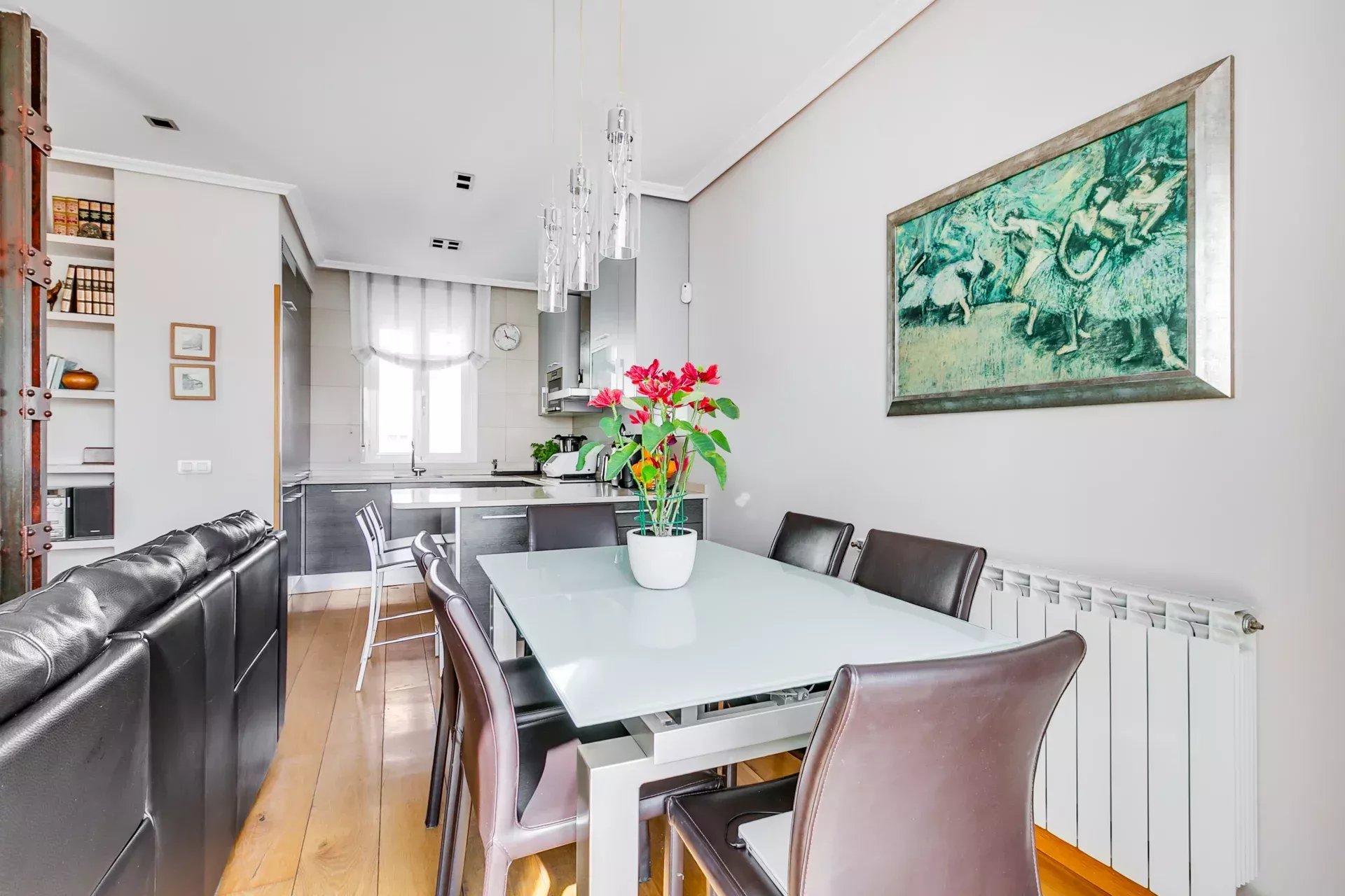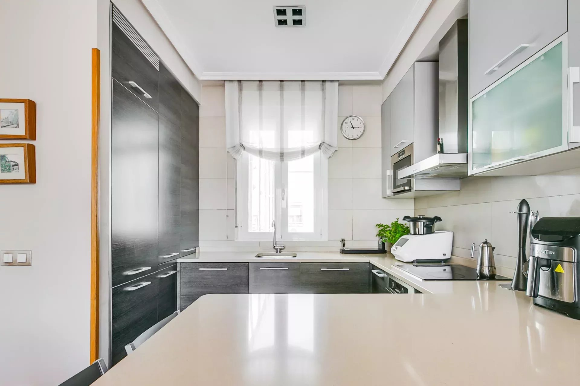 La cocina, integrada en el salón, está equipada con electrodomésticos con paneles integrales que combinan funcionalidad y diseño moderno.