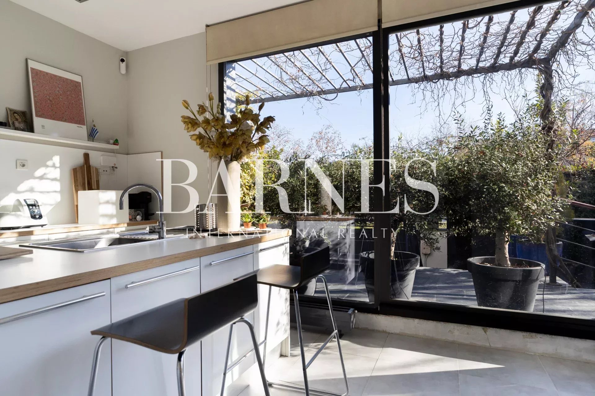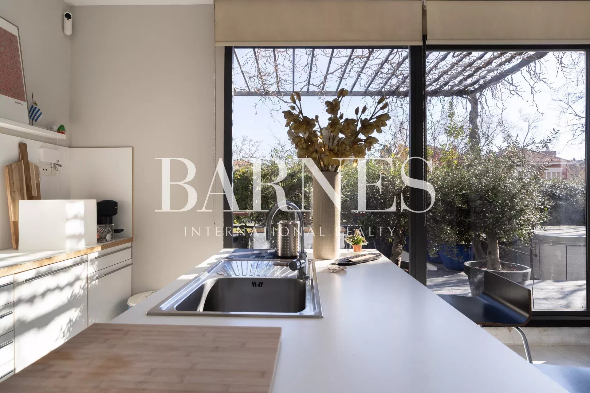 A mano derecha tenemos el acceso a una amplia cocina con isla y ventanales con apertura y acceso directo al exterior. La cocina esta totalmente equipada, desde ella también accedemos a una despensa o cuarto de lavandería que a su vez nos lleva a la parte interior del jardín con su zona de comedor y chill por separado. El comedor externo al igual que la zona chill esta cubierto por pérgola de vegetación de plantas. En la parte del comedor tenemos el espacio pensado para la instalación de entrada de cocina y bbq.
