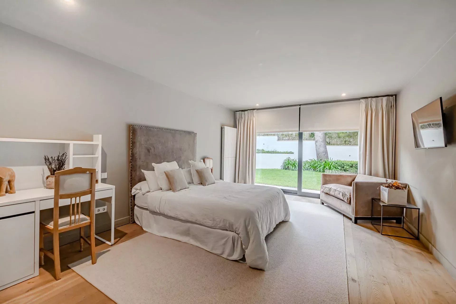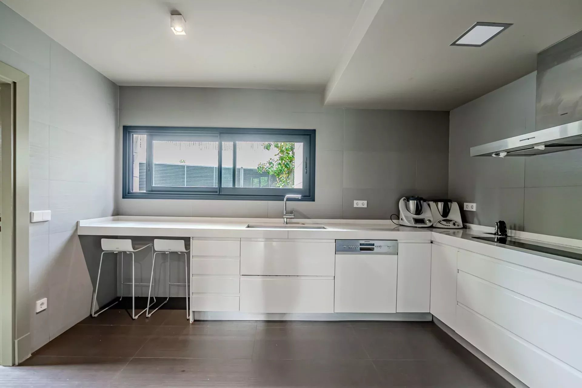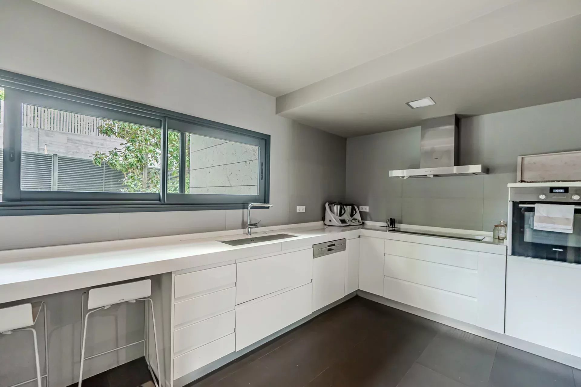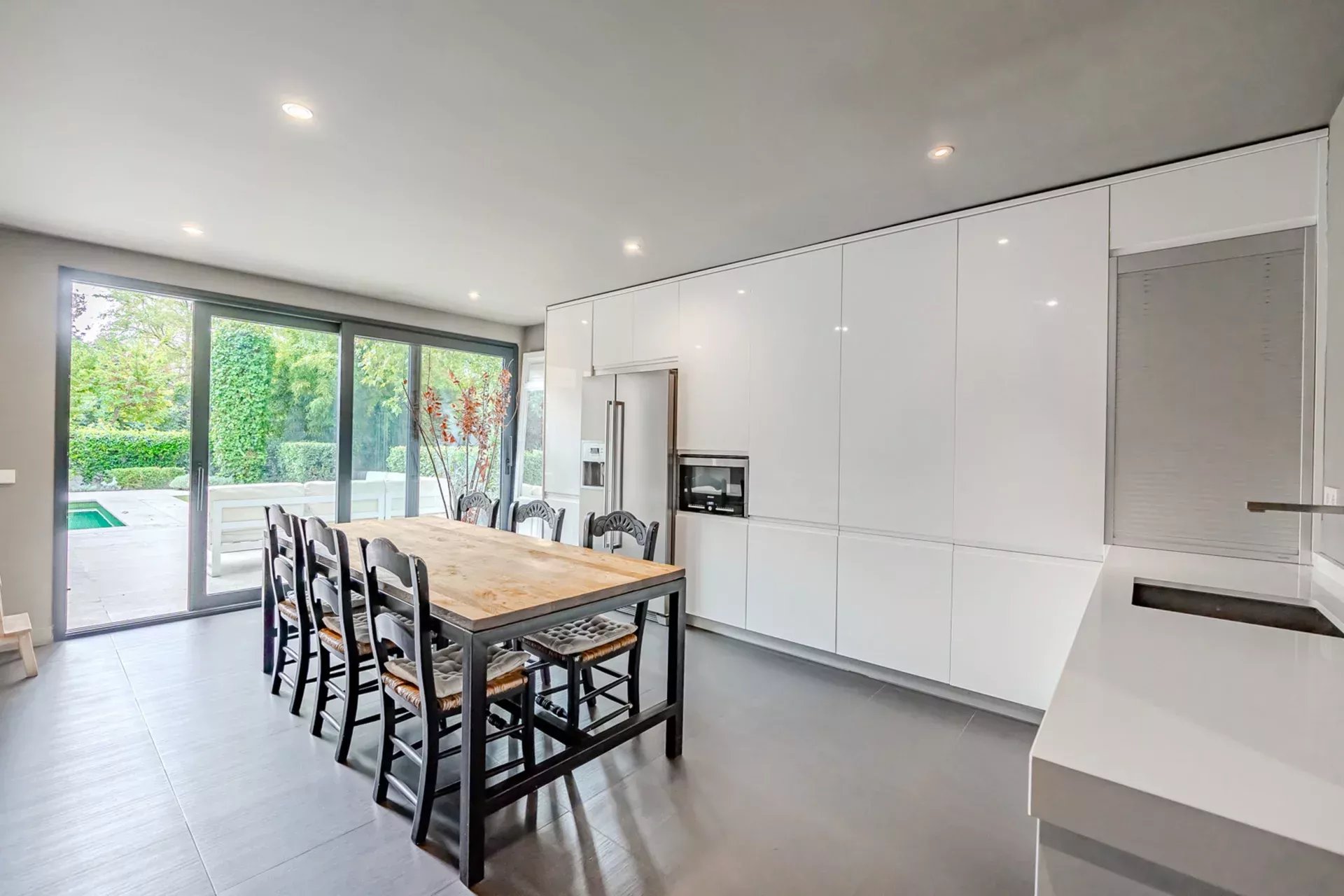 En la planta principal, destaca un amplio salón con grandes ventanales que se abren hacia el jardín y la piscina, rodeados de vegetación y árboles maduros que confieren al conjunto un ambiente sereno y natural. La cocina, completamente equipada con electrodomésticos de última generación, ofrece un espacio ideal para los amantes de la gastronomía y el entretenimiento.