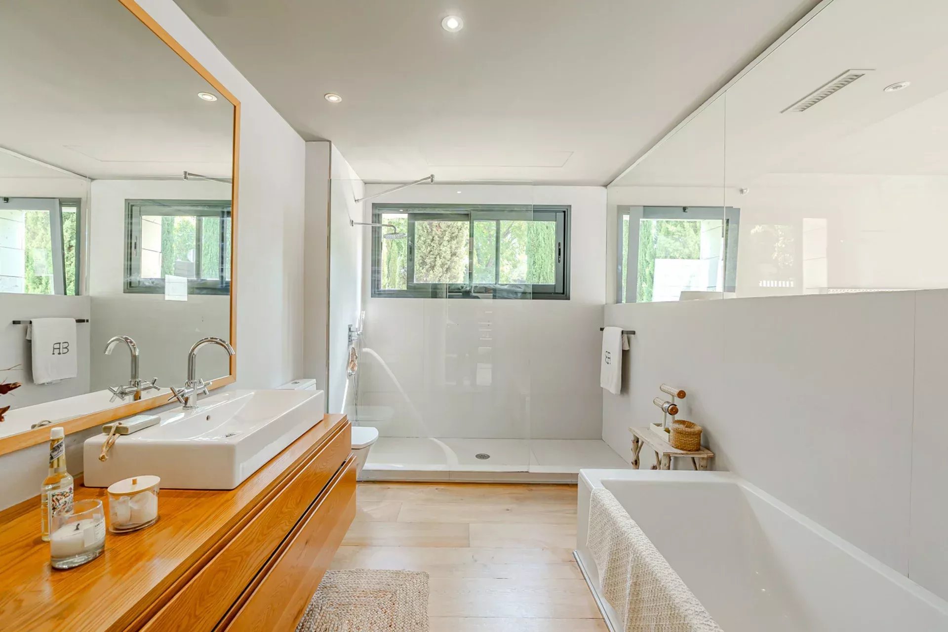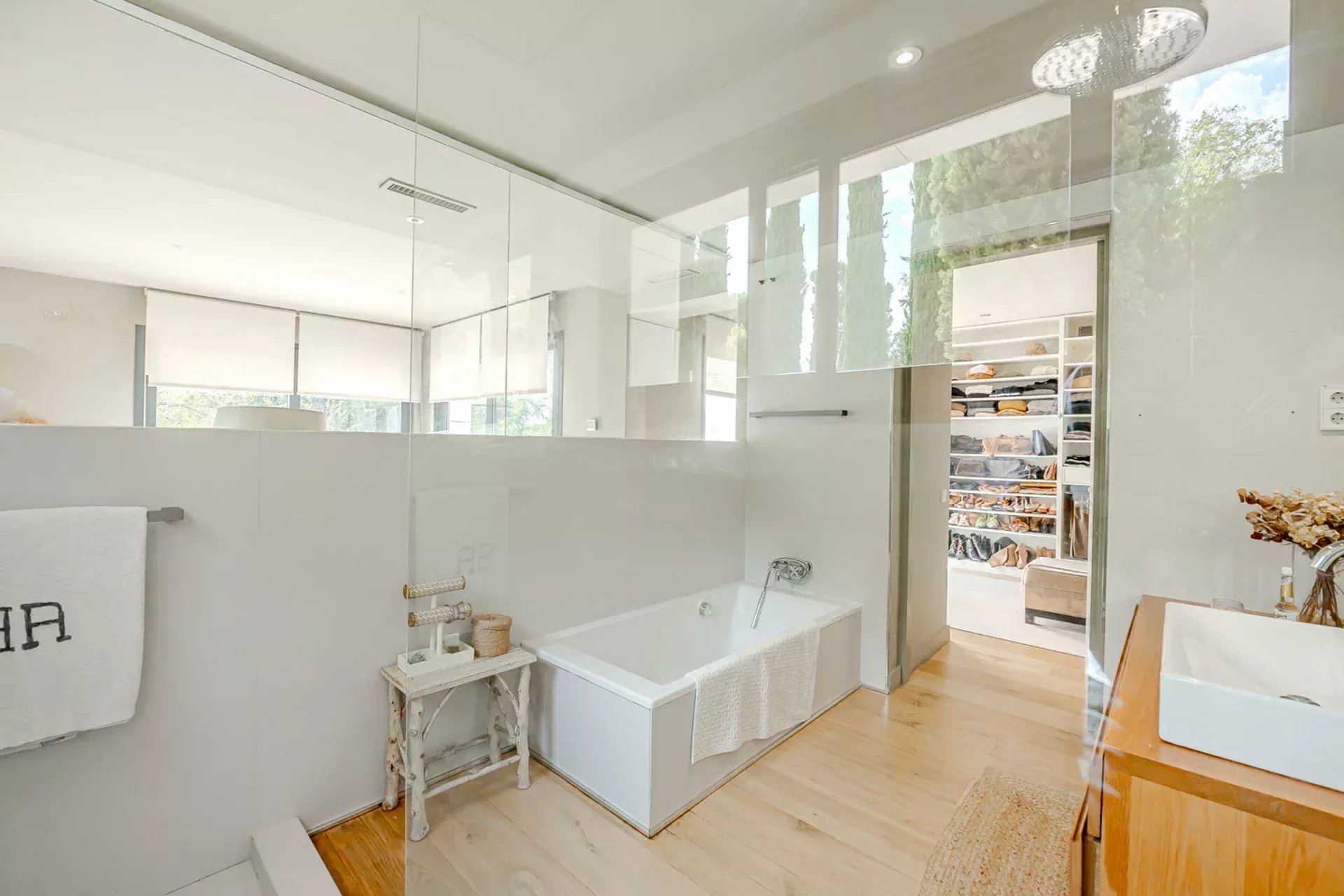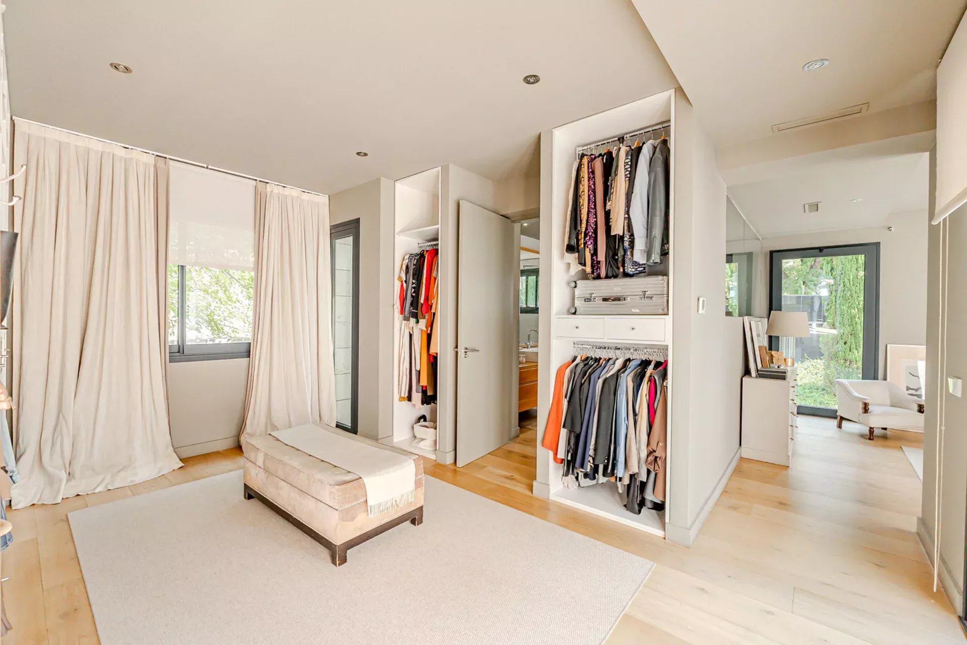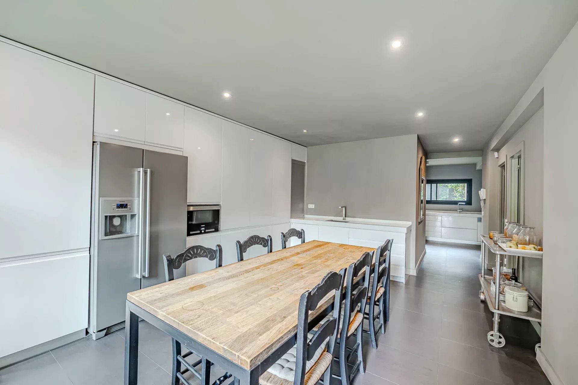 En la planta principal, destaca un amplio salón con grandes ventanales que se abren hacia el jardín y la piscina, rodeados de vegetación y árboles maduros que confieren al conjunto un ambiente sereno y natural. La cocina, completamente equipada con electrodomésticos de última generación, ofrece un espacio ideal para los amantes de la gastronomía y el entretenimiento.