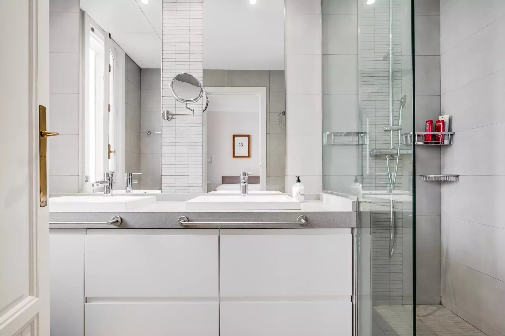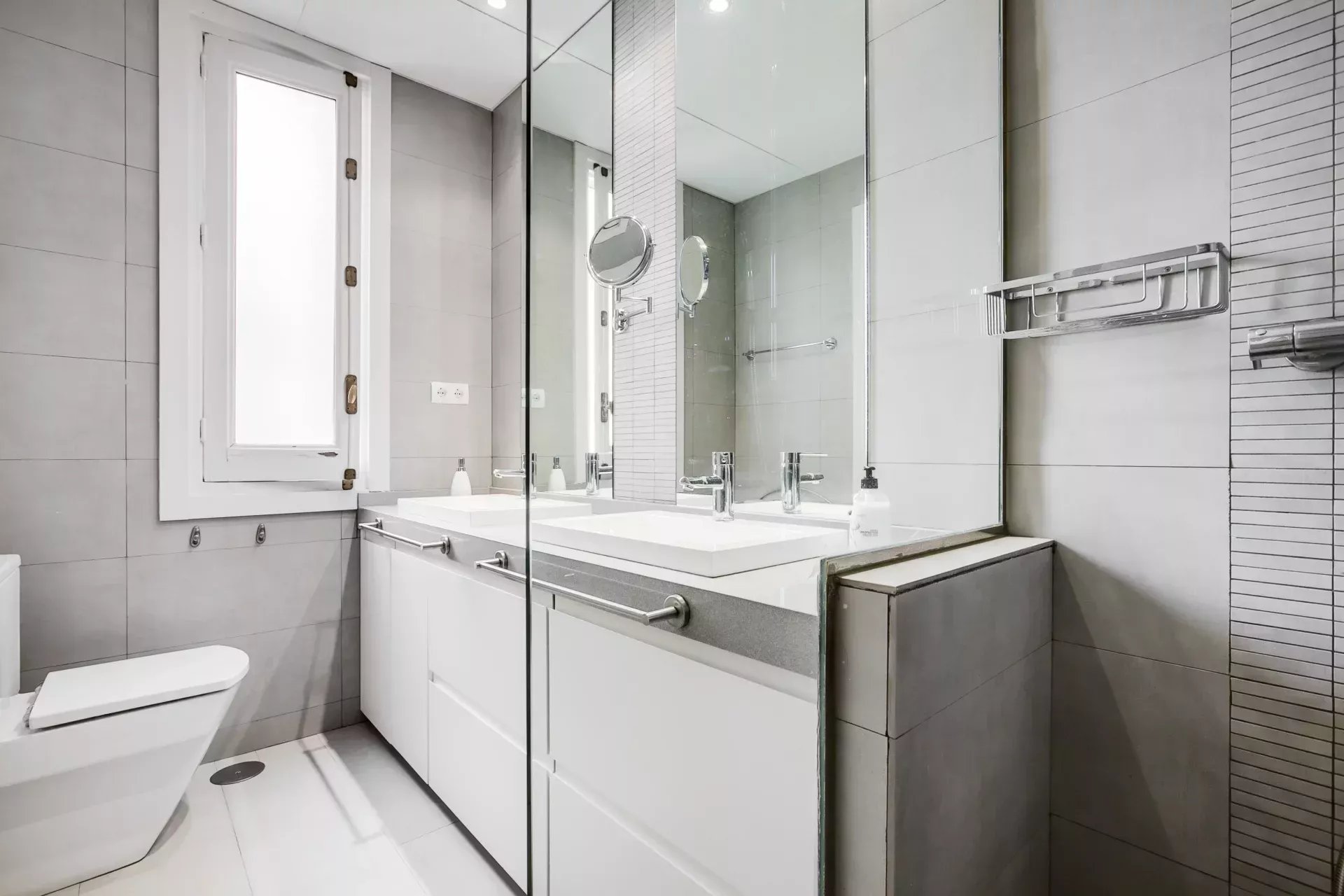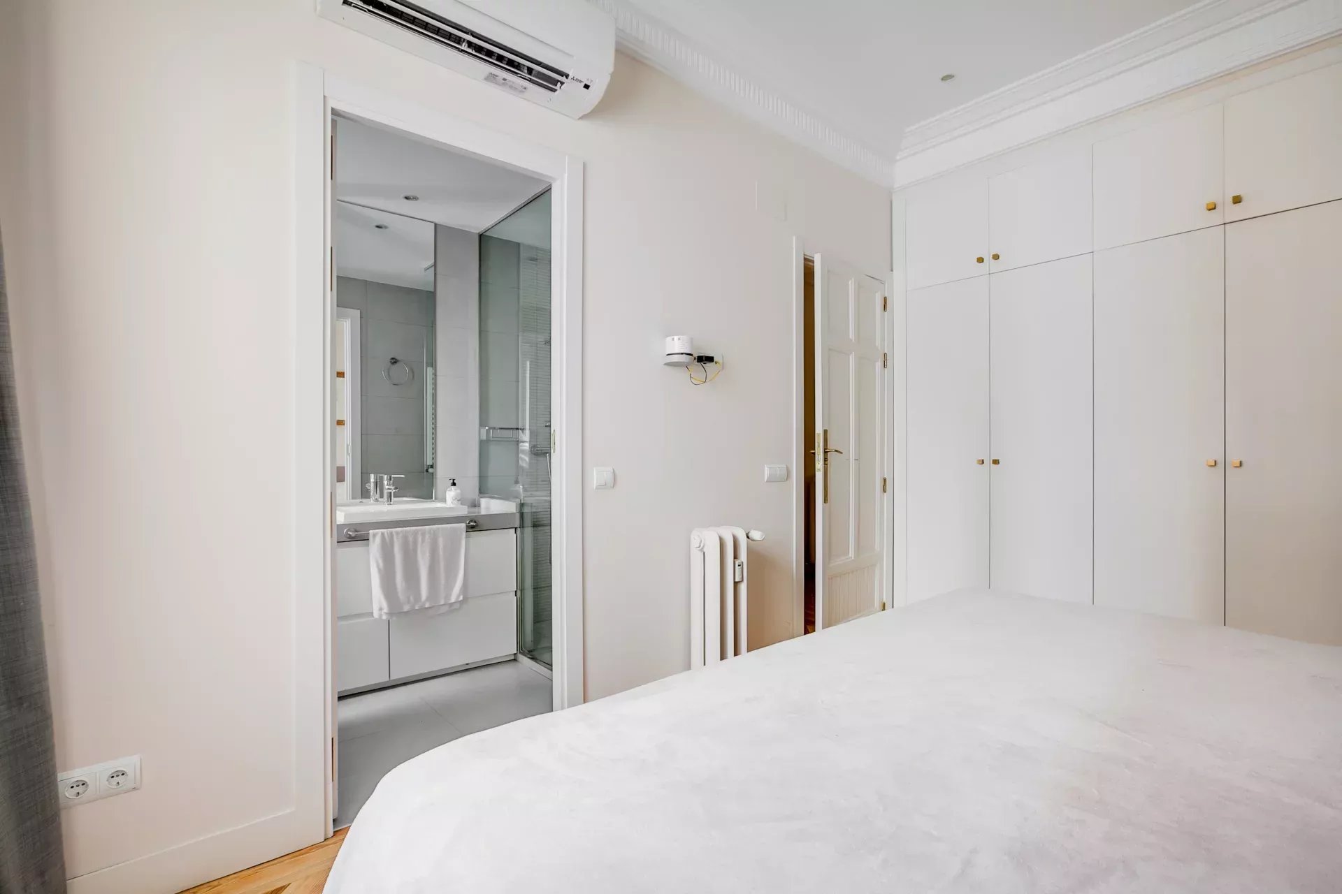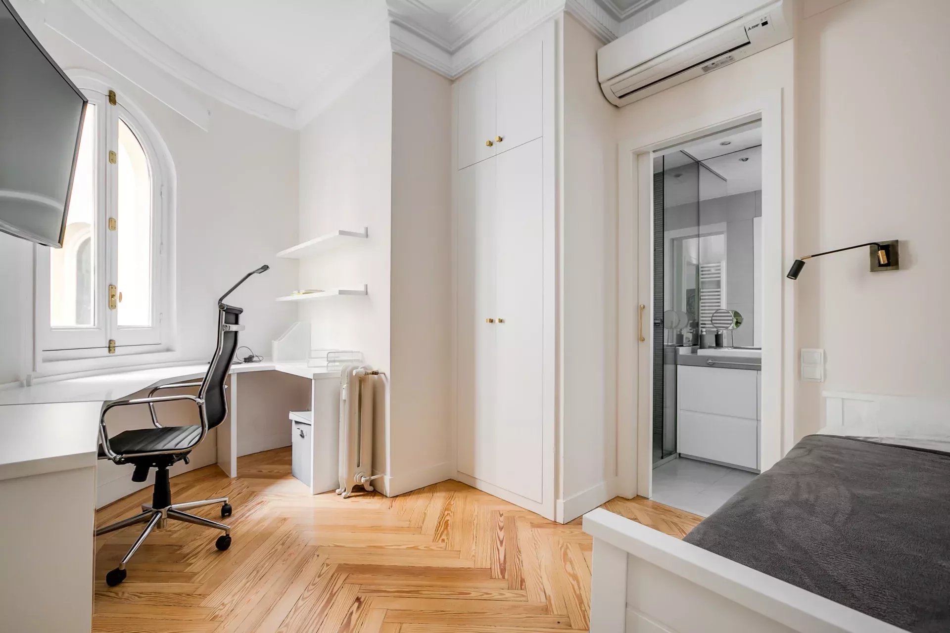 Tras la zona social aparecen los otros dos dormitorios. Comparten un baño completo, con acceso independiente desde cada habitación, aportando privacidad y practicidad a partes iguales. Esta distribución, equilibrada y eficiente, encaja con lo que muchos compradores buscan en viviendas de lujo en venta en el Barrio de Salamanca: confort, luminosidad y una ubicación prime.
