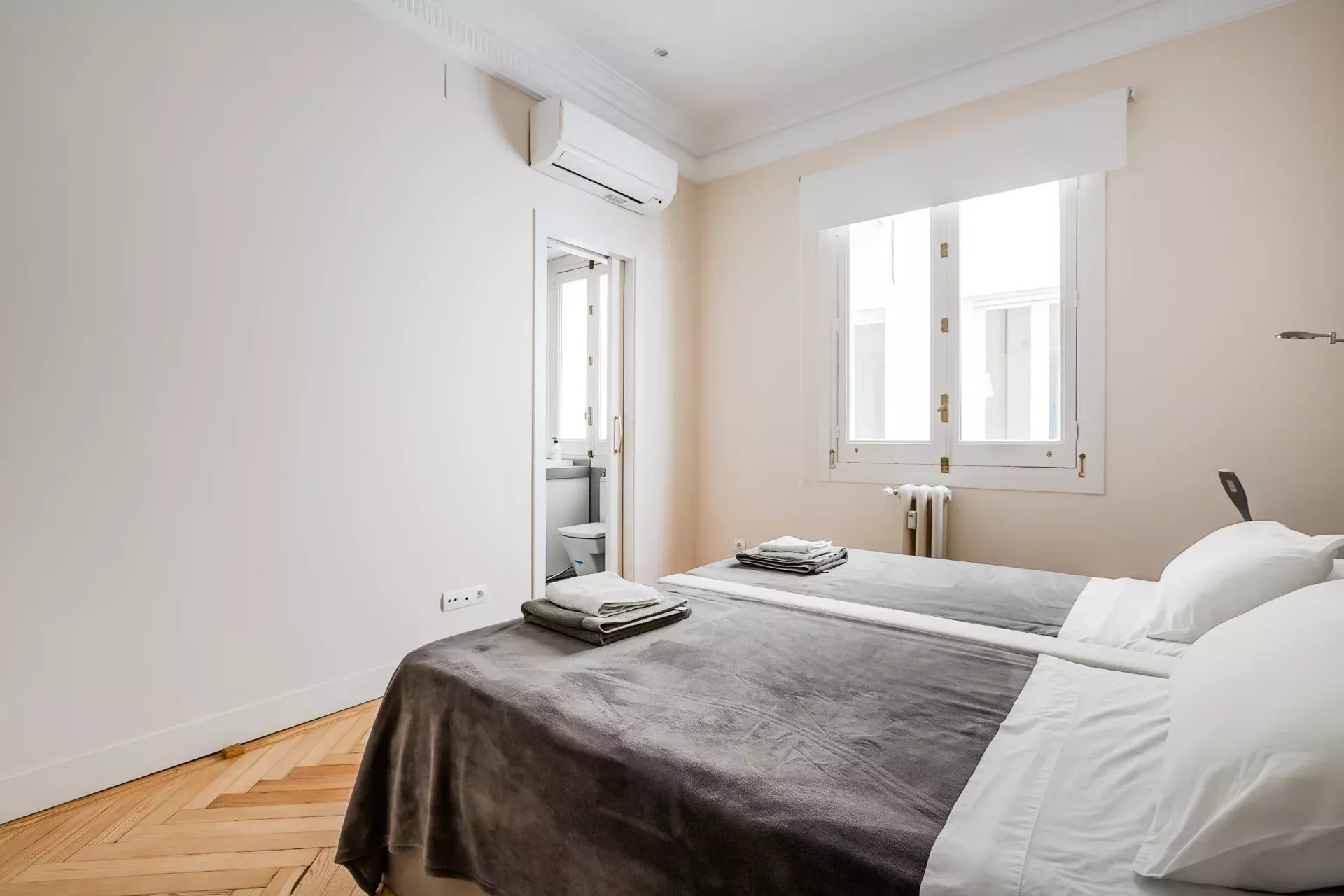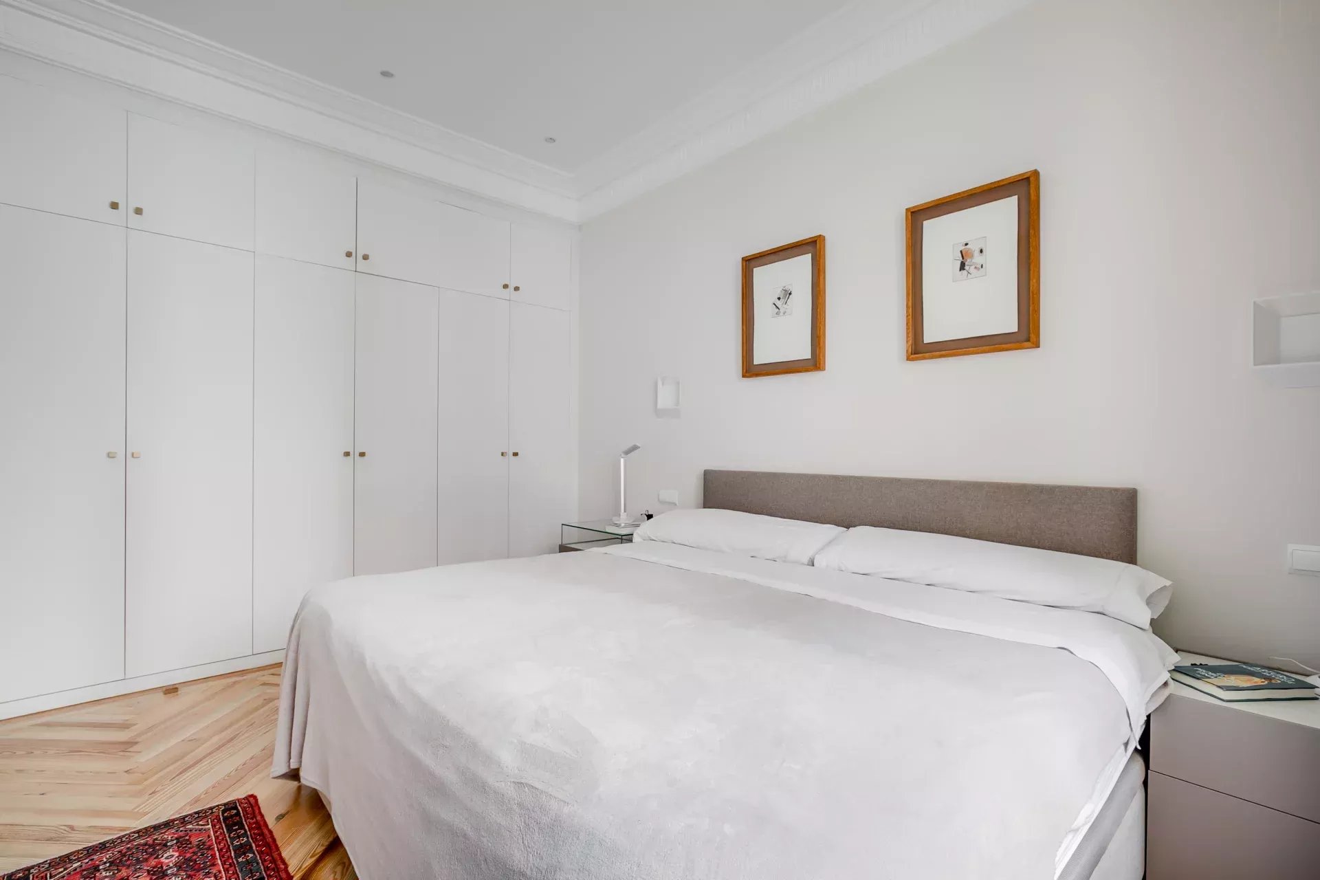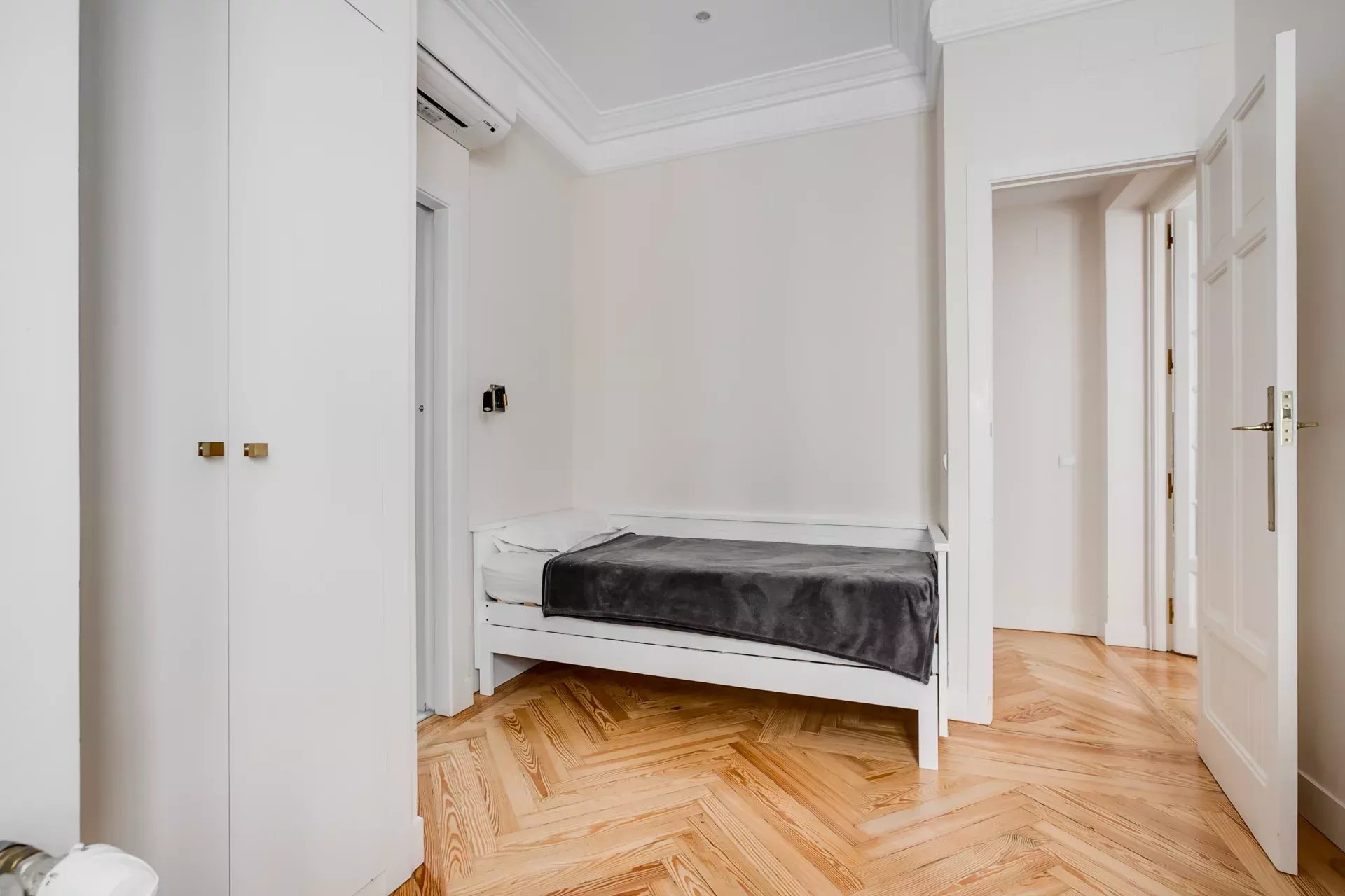 Tras la zona social aparecen los otros dos dormitorios. Comparten un baño completo, con acceso independiente desde cada habitación, aportando privacidad y practicidad a partes iguales. Esta distribución, equilibrada y eficiente, encaja con lo que muchos compradores buscan en viviendas de lujo en venta en el Barrio de Salamanca: confort, luminosidad y una ubicación prime.