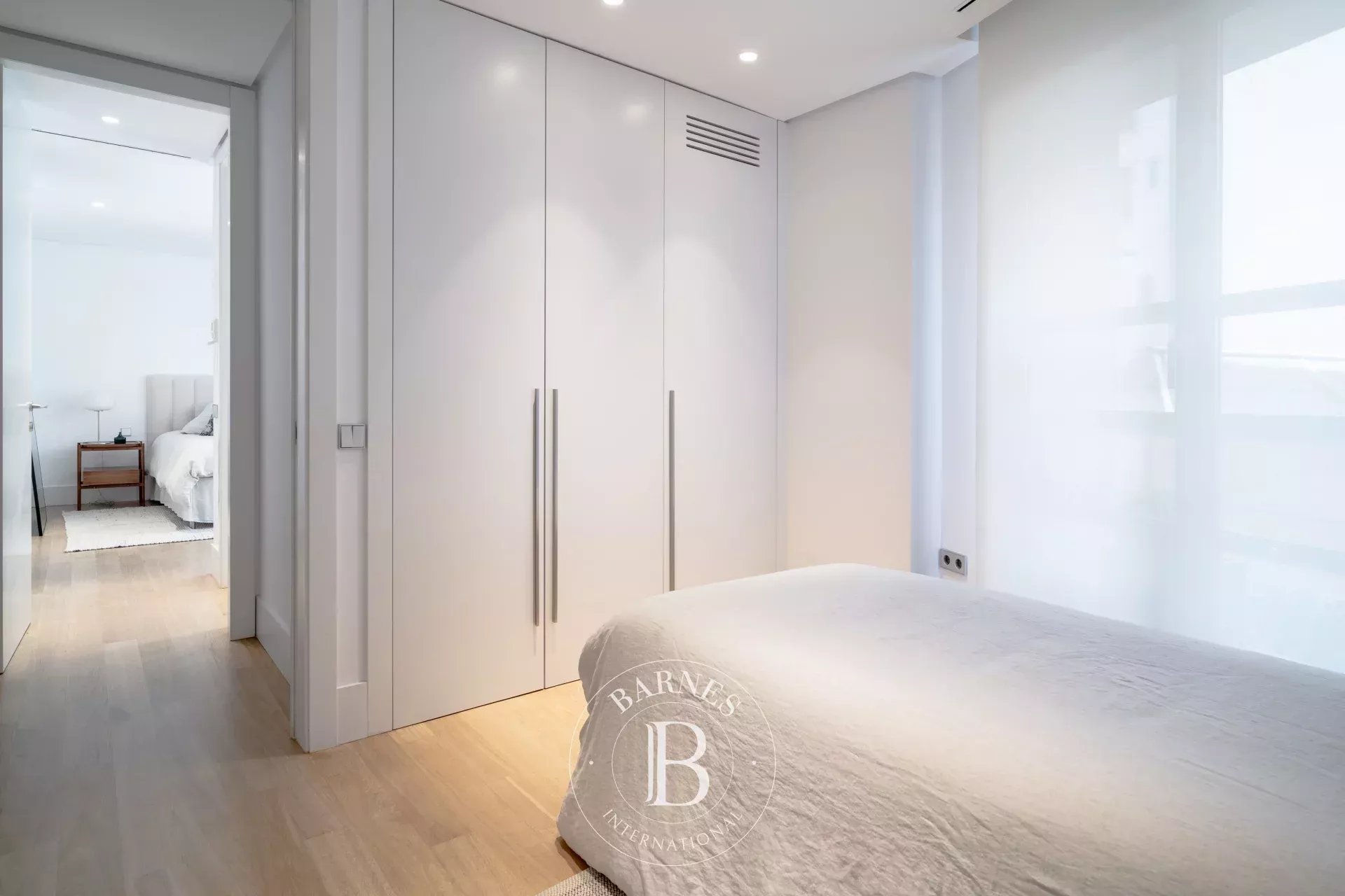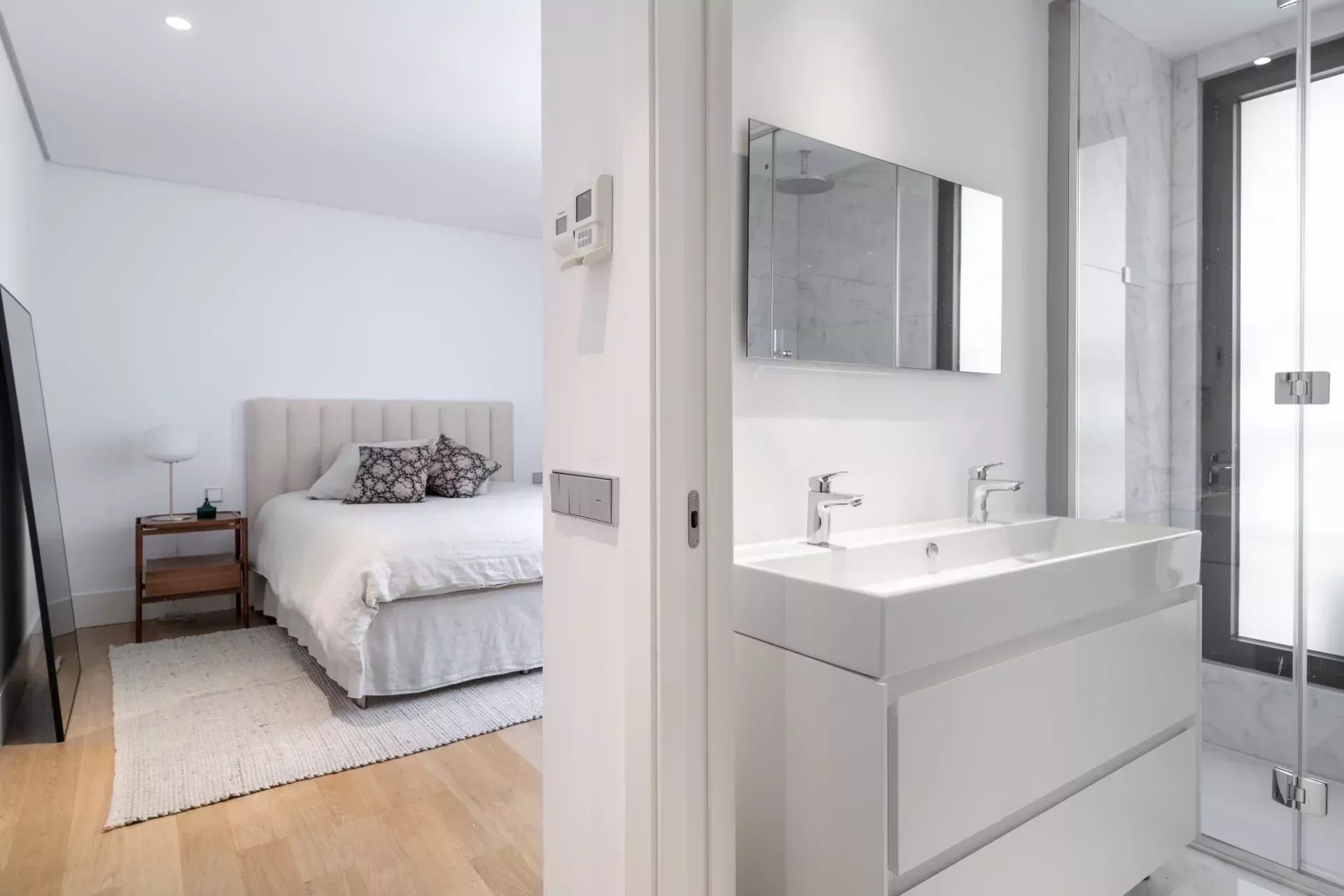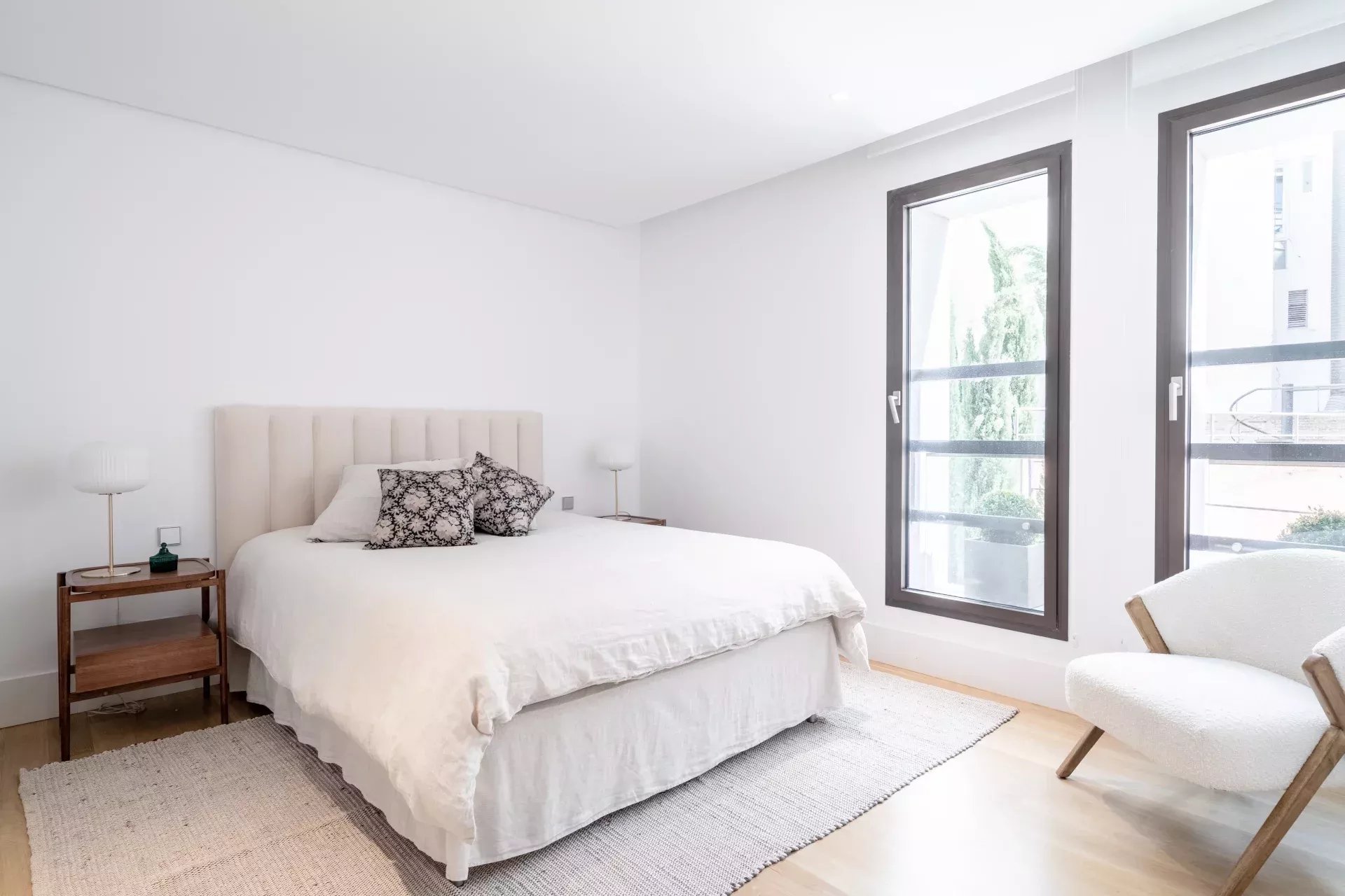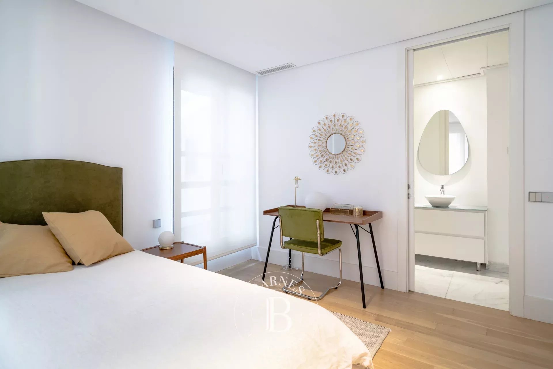 Subiendo por una escalera de diseño de roble macizo, nos encontramos con dos dormitorios, ambos con baño en suite y el principal con un gran vestidor. El jardín de uso privativo cuenta con más de 35 metros cuadrados, repartidos en una lavandería y zona social de barbacoa.