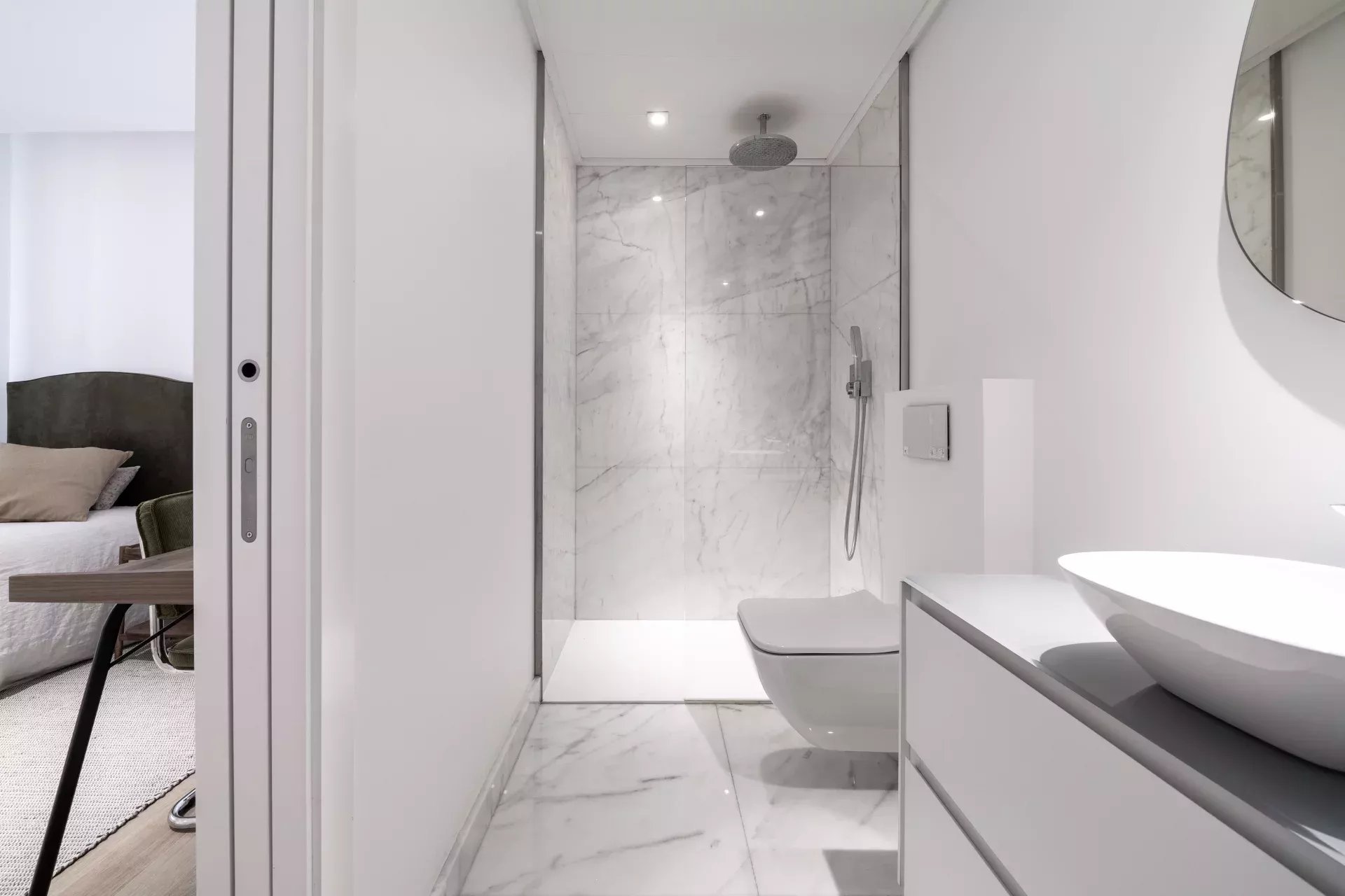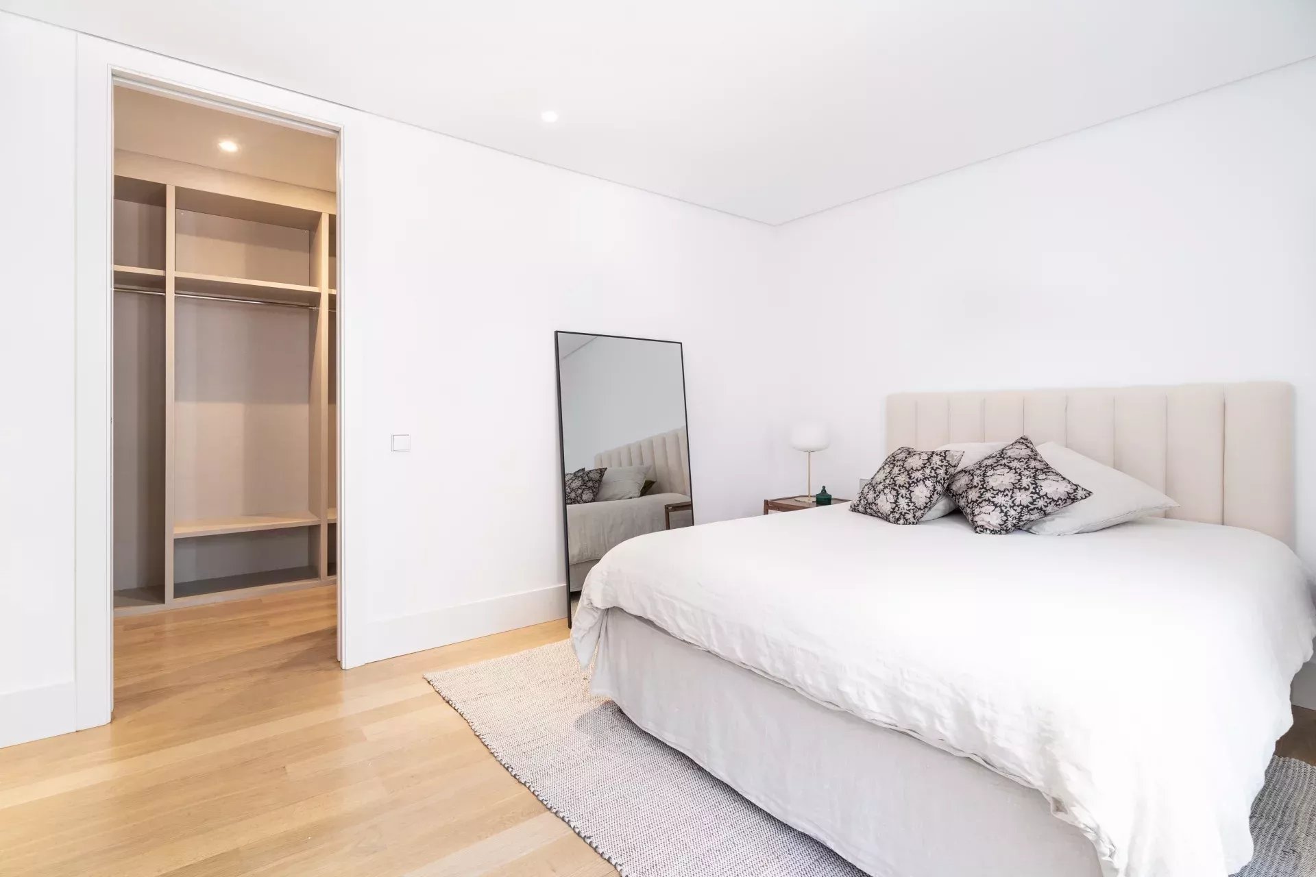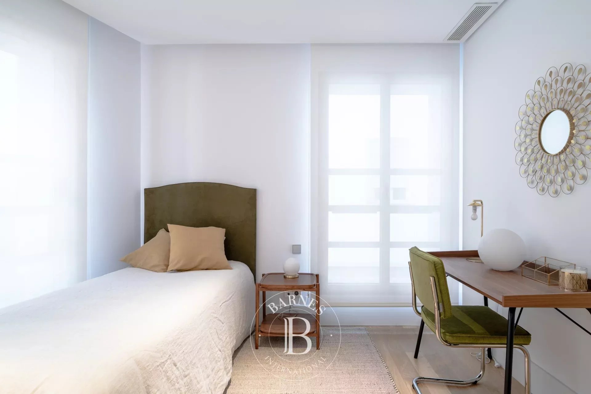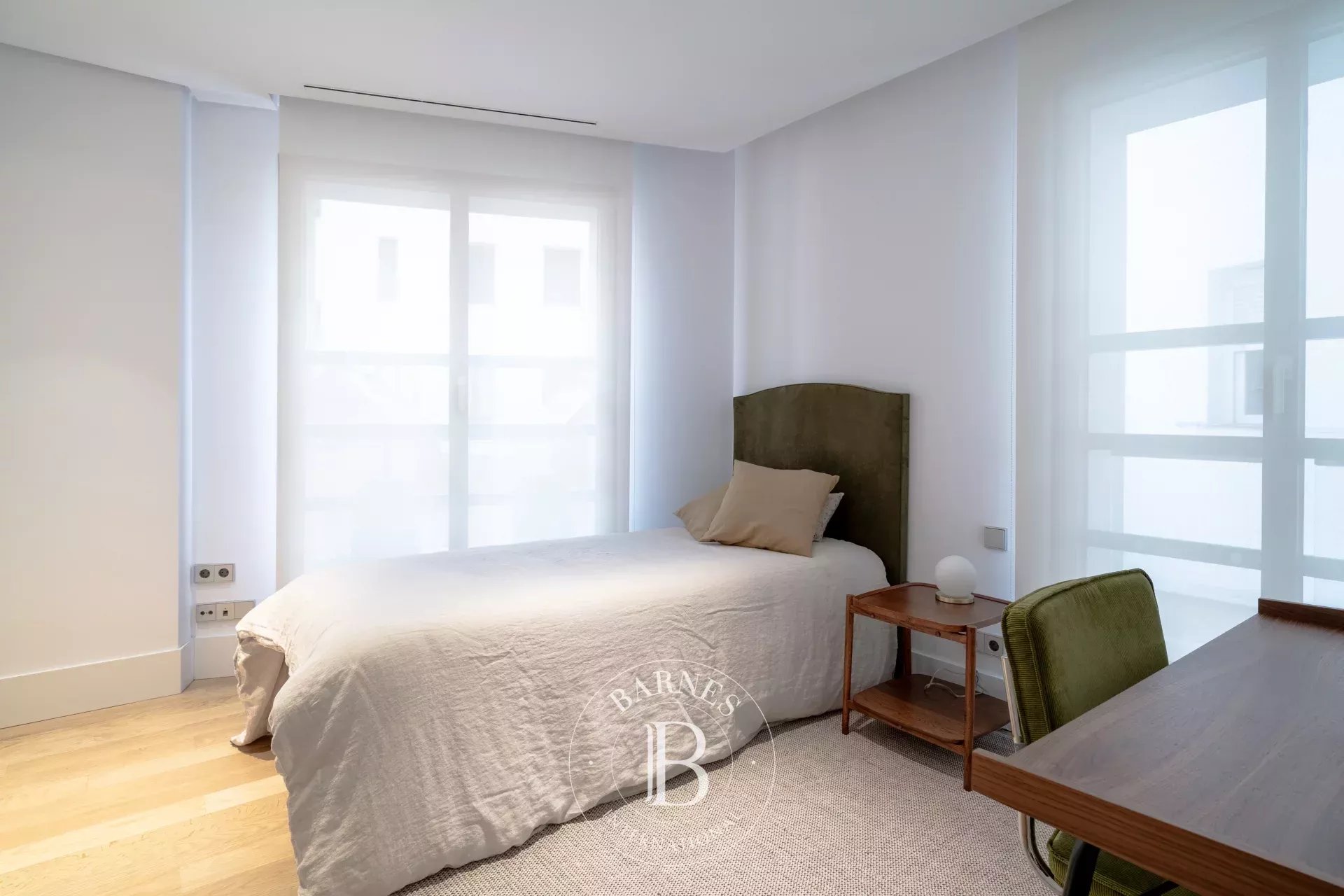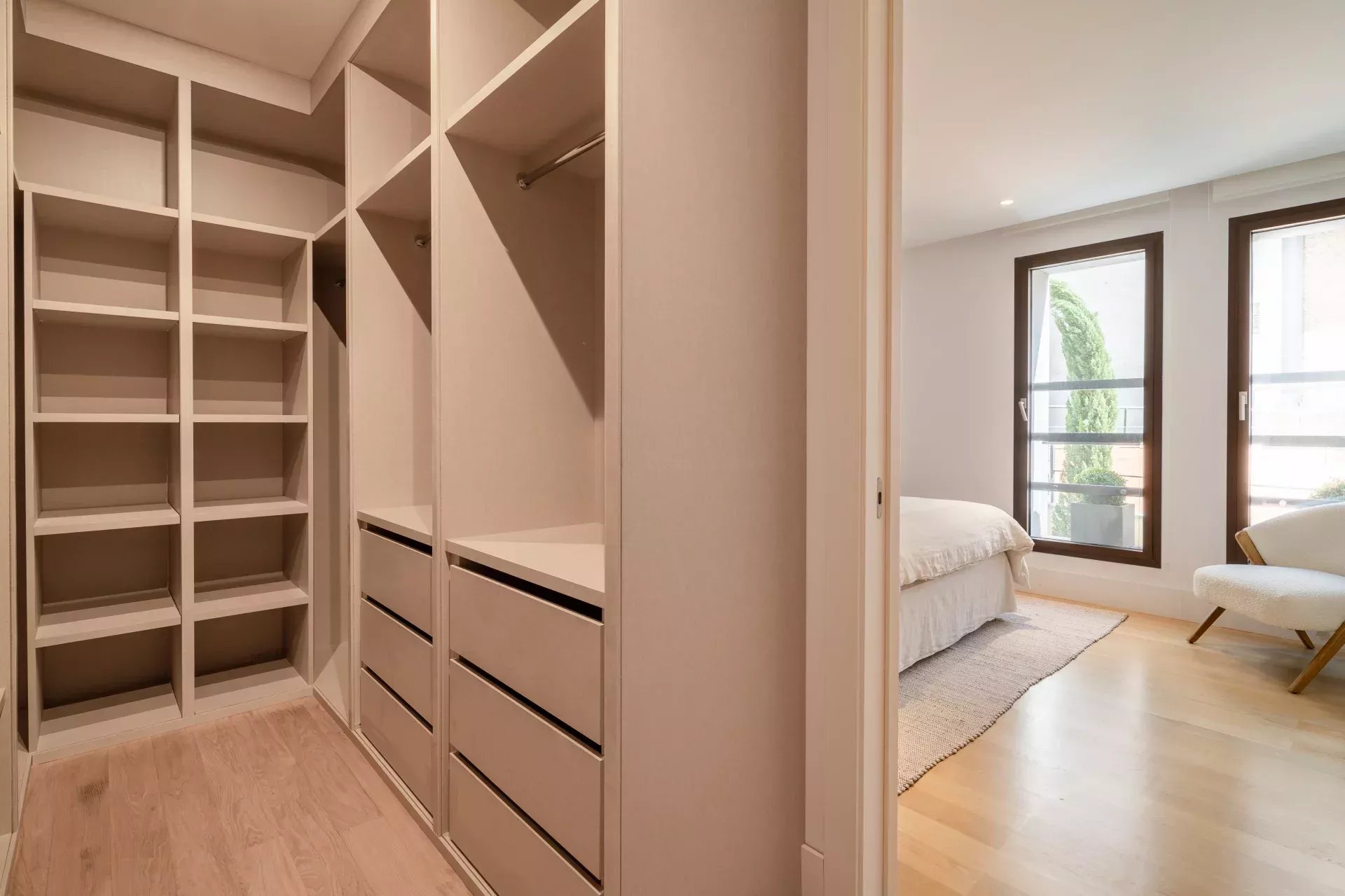 Subiendo por una escalera de diseño de roble macizo, nos encontramos con dos dormitorios, ambos con baño en suite y el principal con un gran vestidor. El jardín de uso privativo cuenta con más de 35 metros cuadrados, repartidos en una lavandería y zona social de barbacoa.