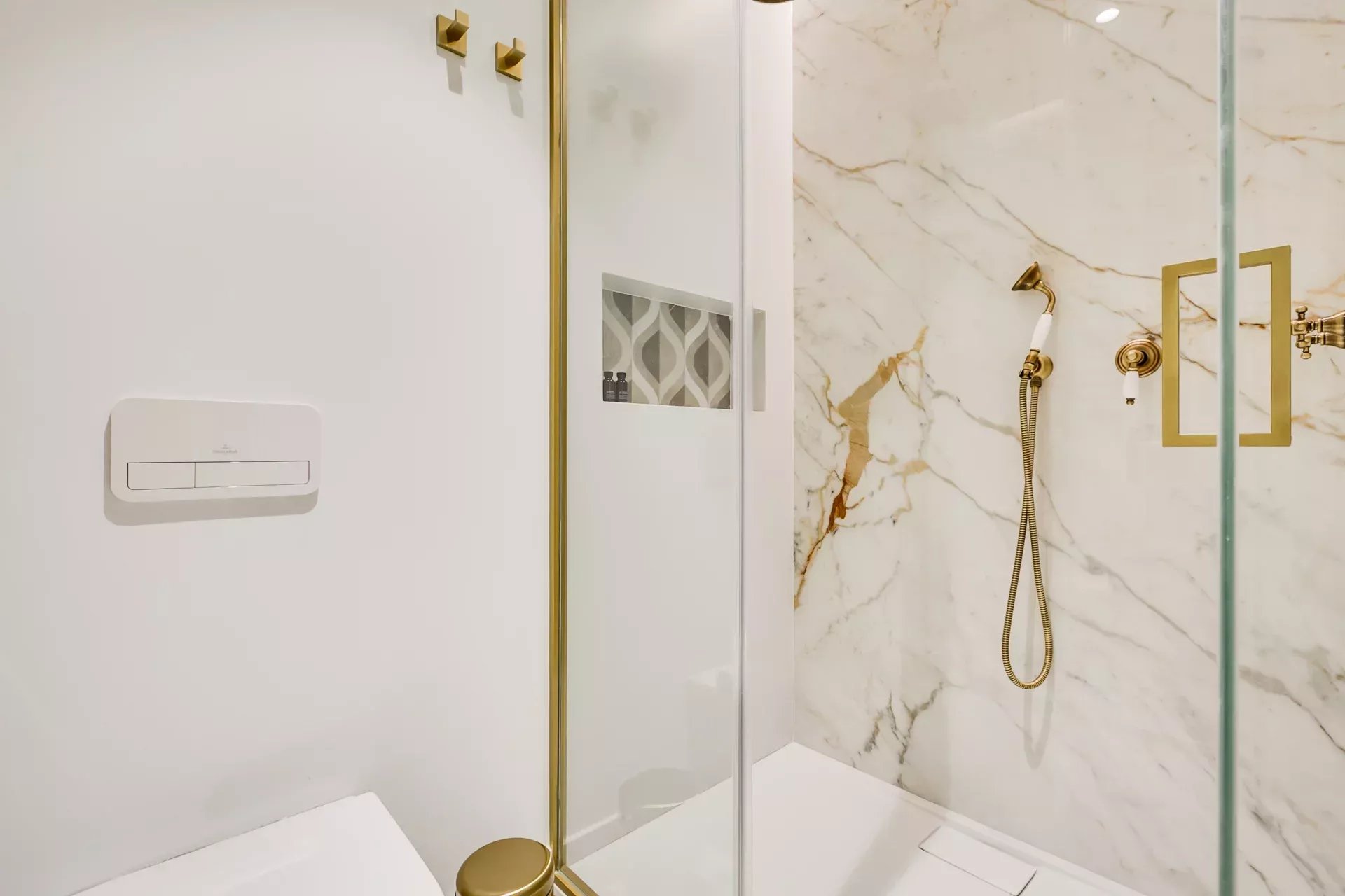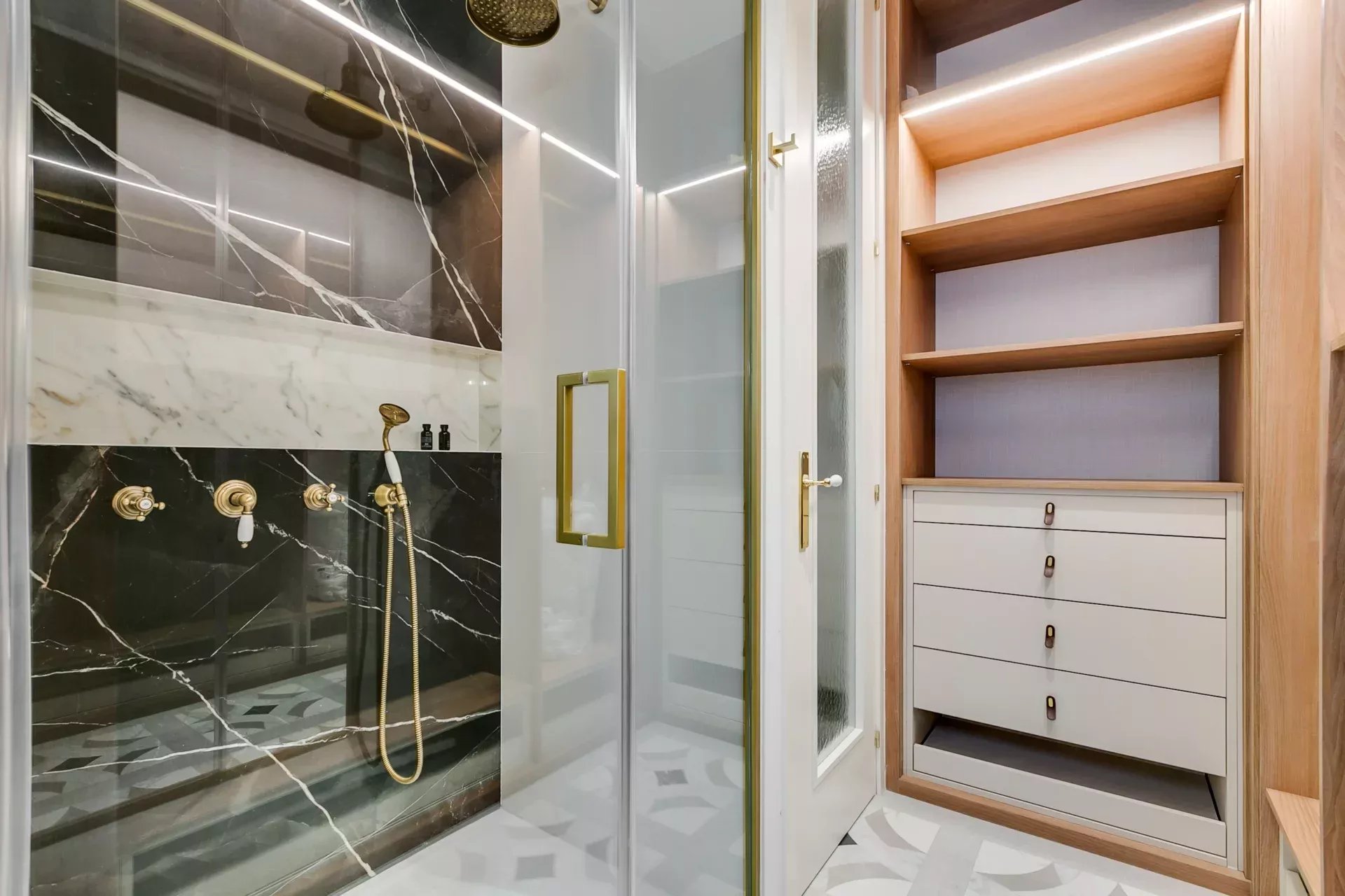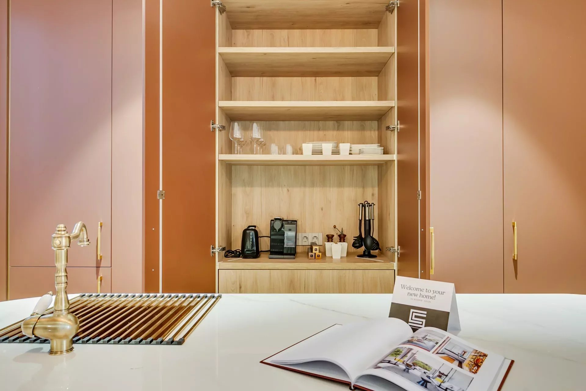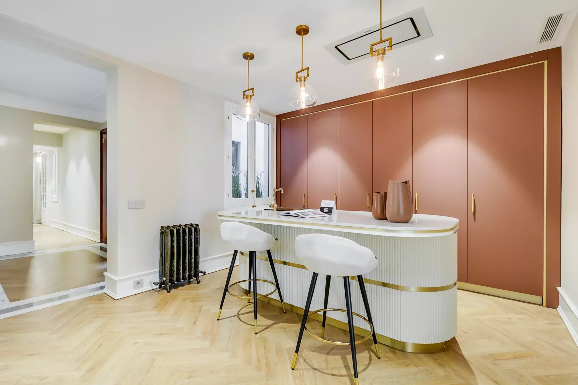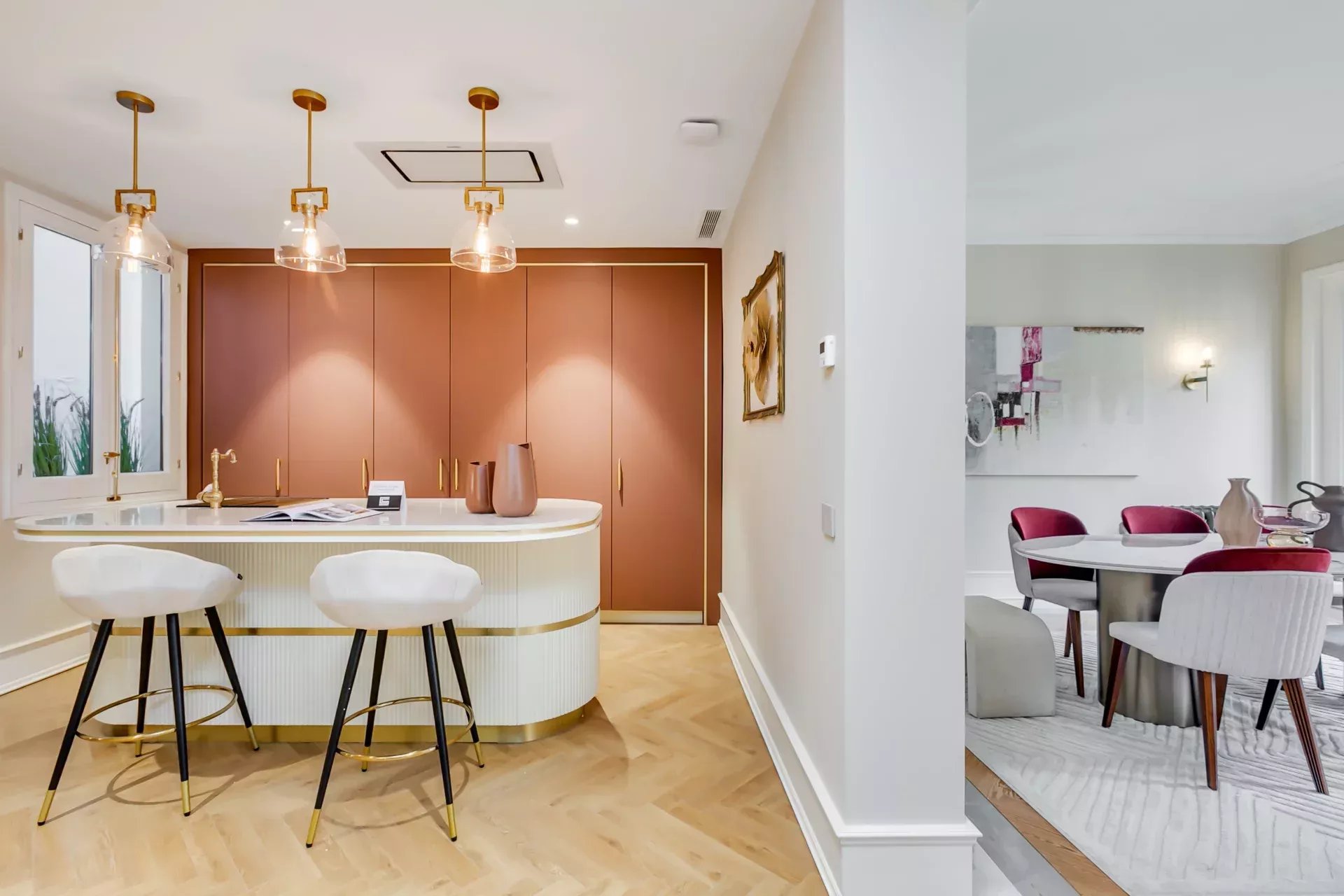 La cocina, integrada, perfectamente, en el paso hacia el salón, es un verdadero sueño hecho realidad. Completamente panelada y diseñada con un estilo belle époque, se camufla elegantemente cuando no está en uso. Un espacio único y sofisticado para disfrutar de la preparación de deliciosas comidas o de reuniones íntimas con amigos y familiares.