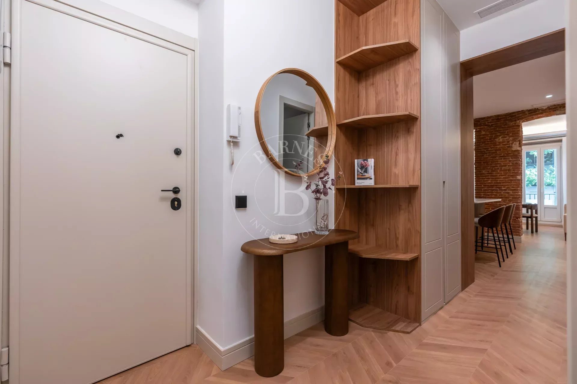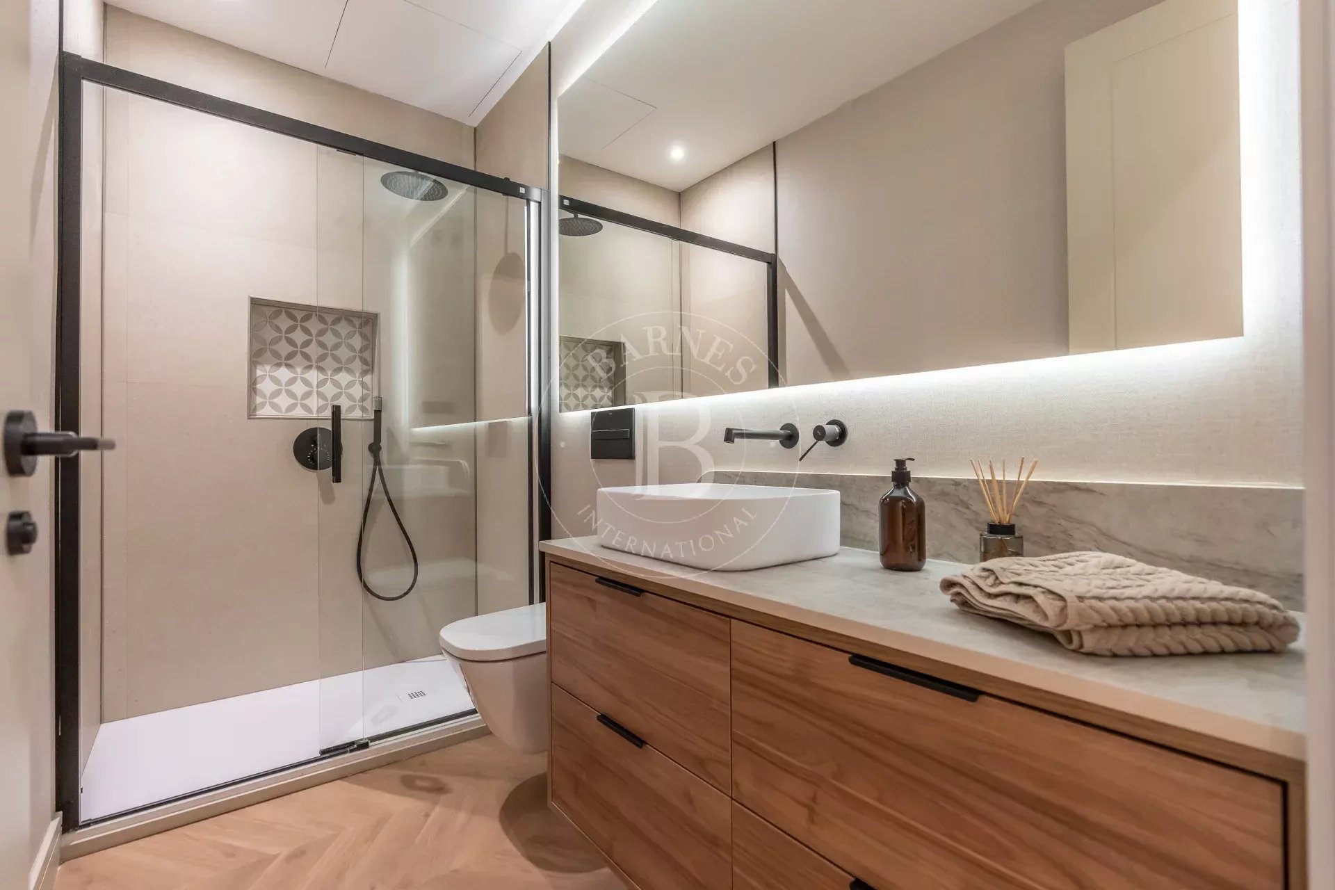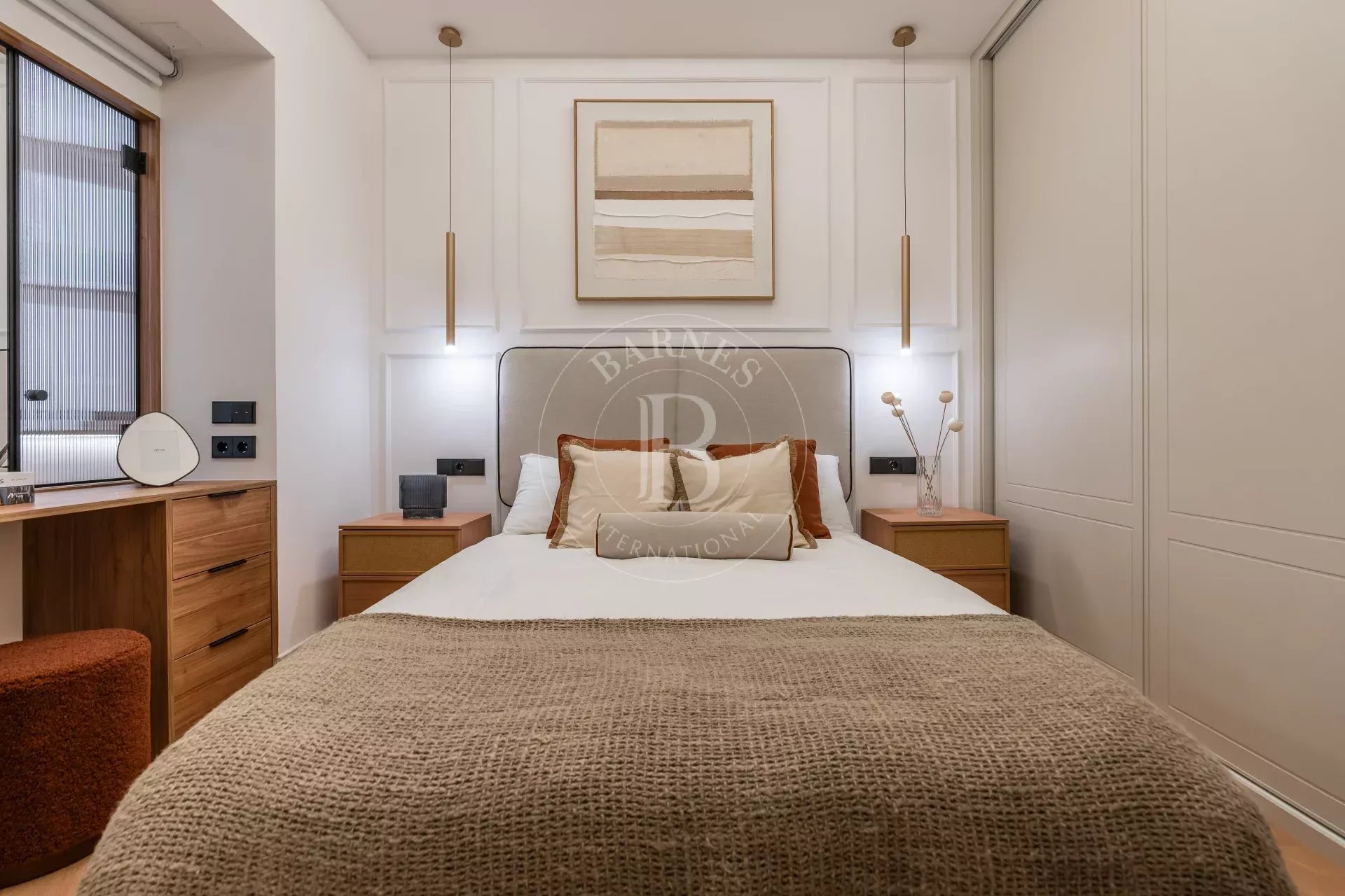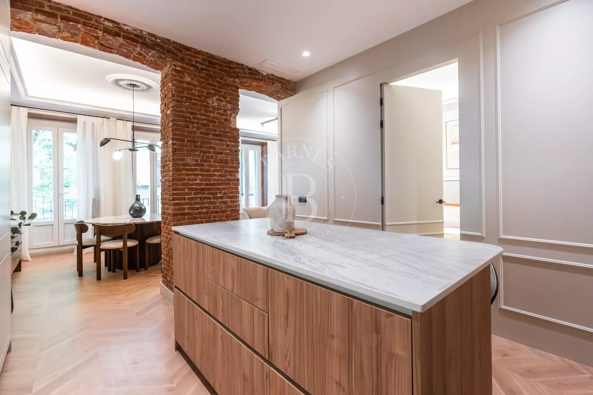 El piso ha sido diseñado con una distribución moderna y funcional, ofreciendo un amplio salón con cocina americana integrada y equipada con isla, creando un espacio abierto ideal tanto para el día a día como para recibir invitados. Dispone de dos dormitorios y dos baños completos, incluyendo una suite principal con baño privado. La reforma, de alta calidad, combina elementos clásicos con un estilo contemporáneo, dando lugar a un ambiente sofisticado y acogedor.