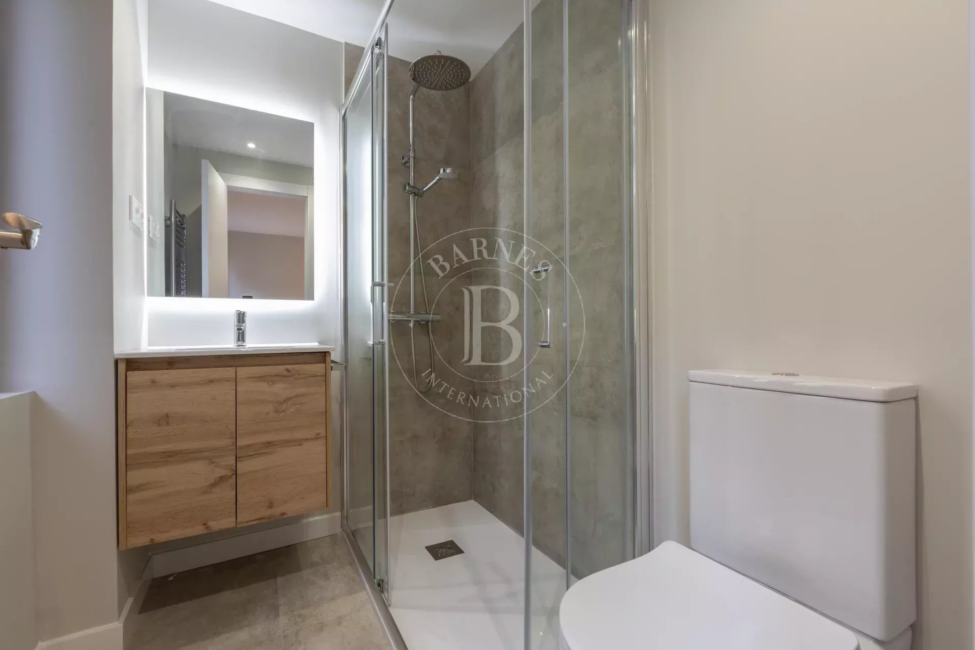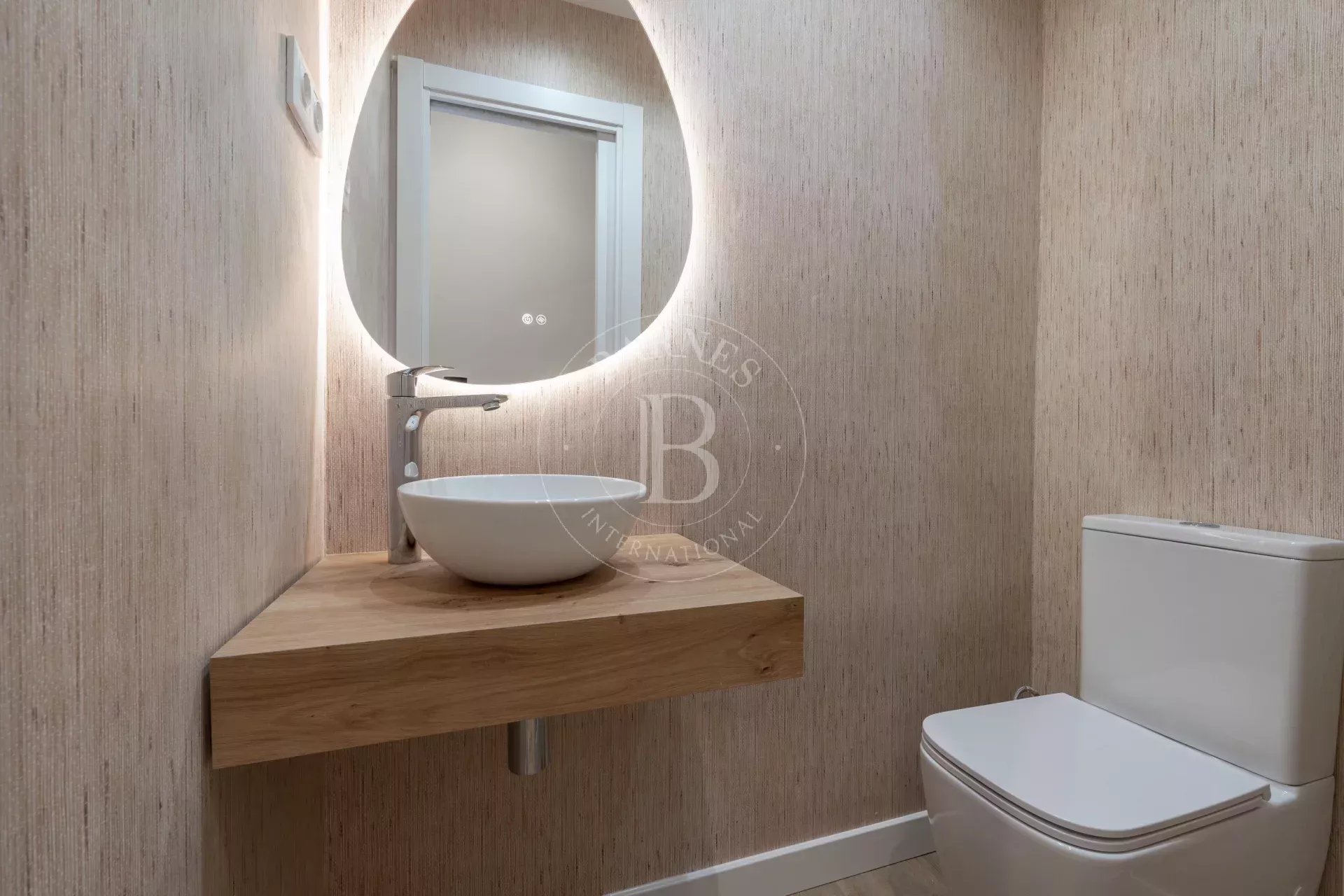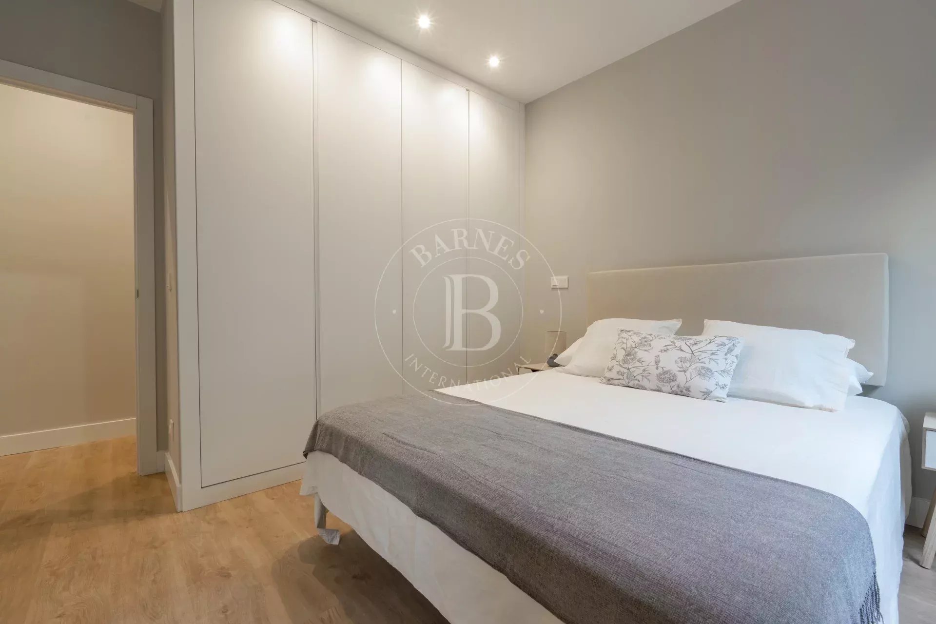 La zona de noche ofrece dos amplios dormitorios, cada uno con baño en suite. El dormitorio principal incorpora armarios empotrados de gran capacidad, mientras que el segundo dormitorio, igualmente generoso, disfruta también de baño privado. Un aseo de cortesía, con acabados en porcelana y espejo retroiluminado, completa la vivienda.