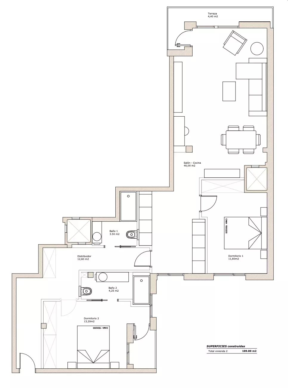 El piso se encuentra en excelente estado y ha sido reformado con acabados de alta calidad. Cuenta con dos amplios dormitorios, dos baños completos, un salón comedor integrado con cocina abierta, y una terraza ideal para disfrutar del entorno urbano con privacidad.