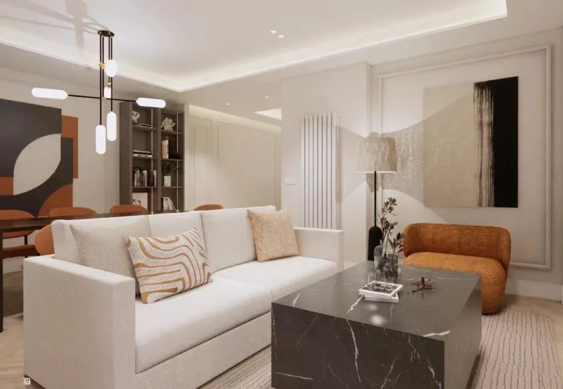 El área social se organiza en un amplio salón-comedor, perfecto para la vida diaria y para recibir. La cocina, semiabierta y totalmente equipada con electrodomésticos de primeras marcas, equilibra estética y practicidad. Se entrega amueblado y listo para entrar a vivir, una ventaja para compradores que buscan una casa de lujo en Madrid sin obras ni esperas.