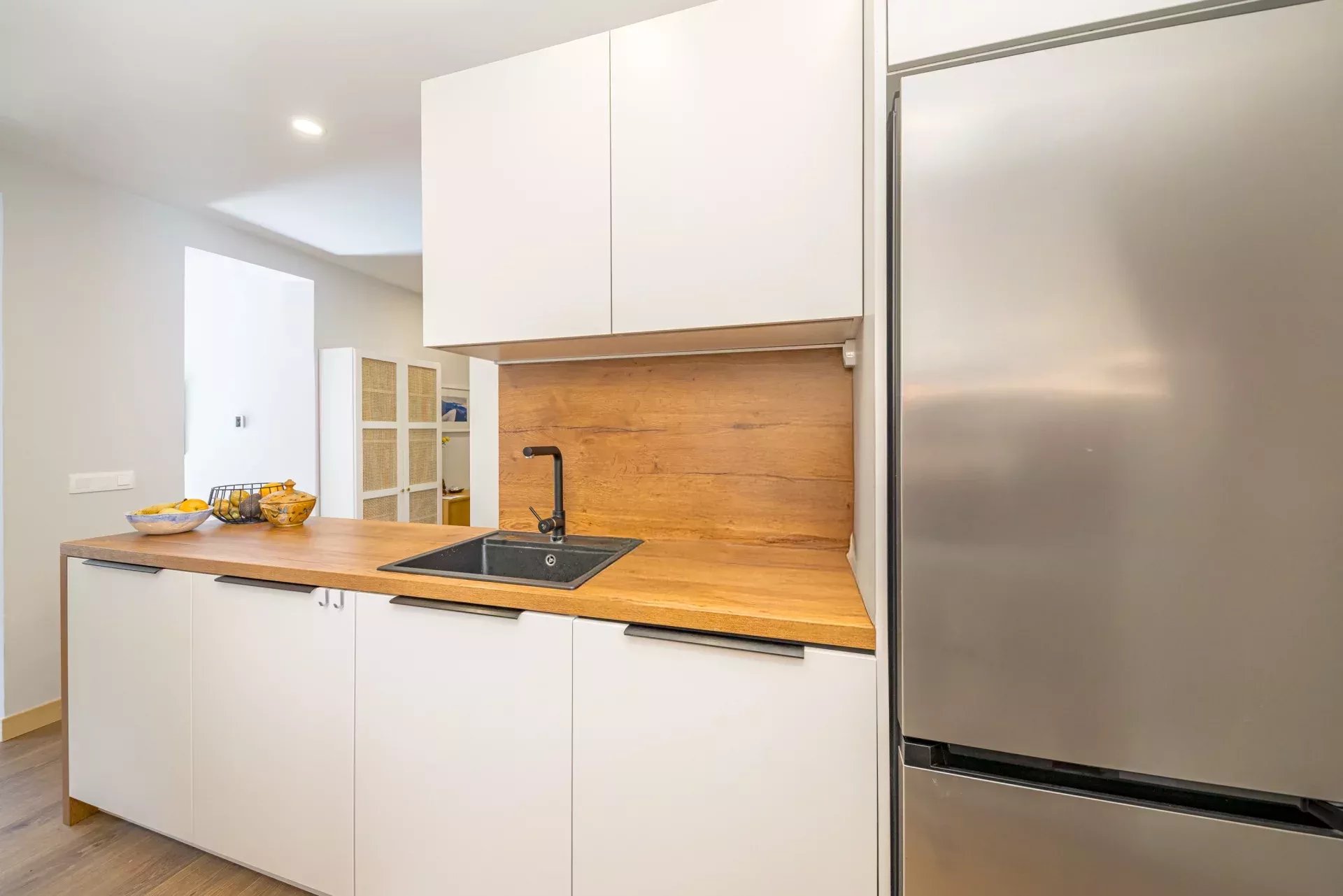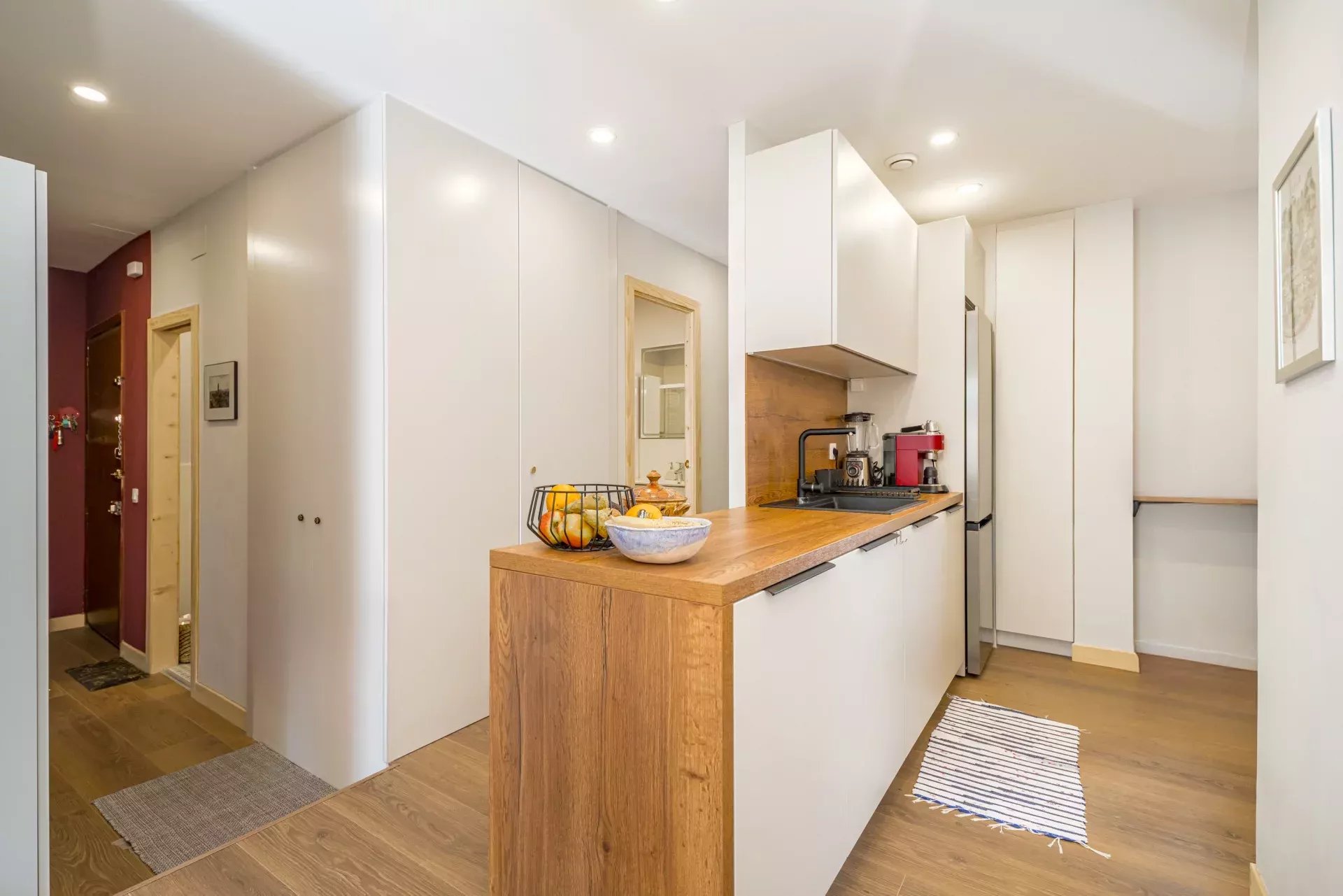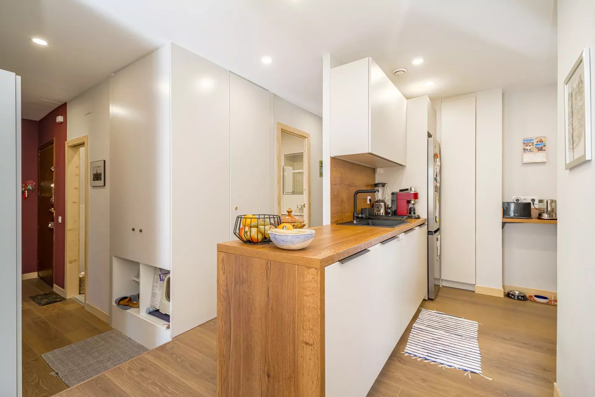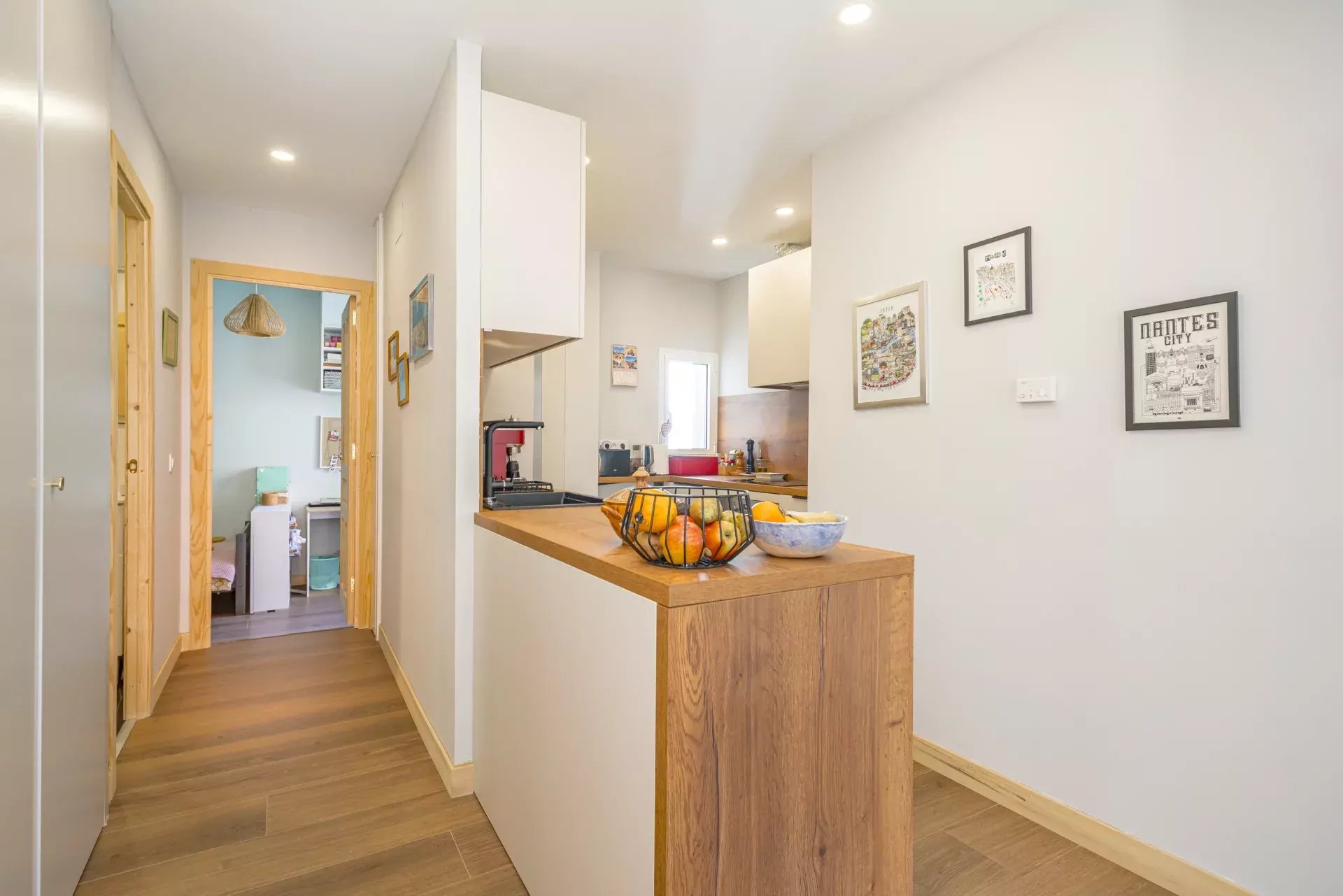 La cocina ha sido instalada a medida por Schmidt, diseñada con precisión y equipada con electrodomésticos de alta gama que aún están en garantía. En el pasillo, los armarios empotrados también son a medida, ofreciendo amplias soluciones de almacenamiento personalizadas.