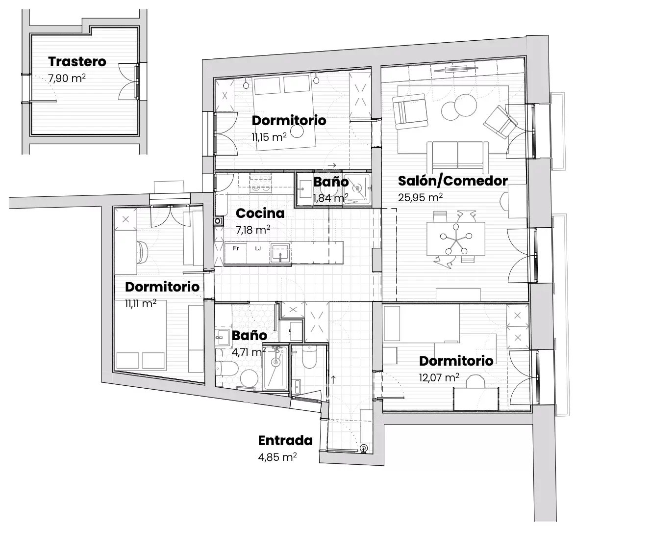 Situado en la tercera planta de un majestuoso edificio de 1900, el apartamento ofrece uno de los lujos urbanos más codiciados: espacio y tranquilidad en medio del distrito más vibrante y dinámico de Madrid.