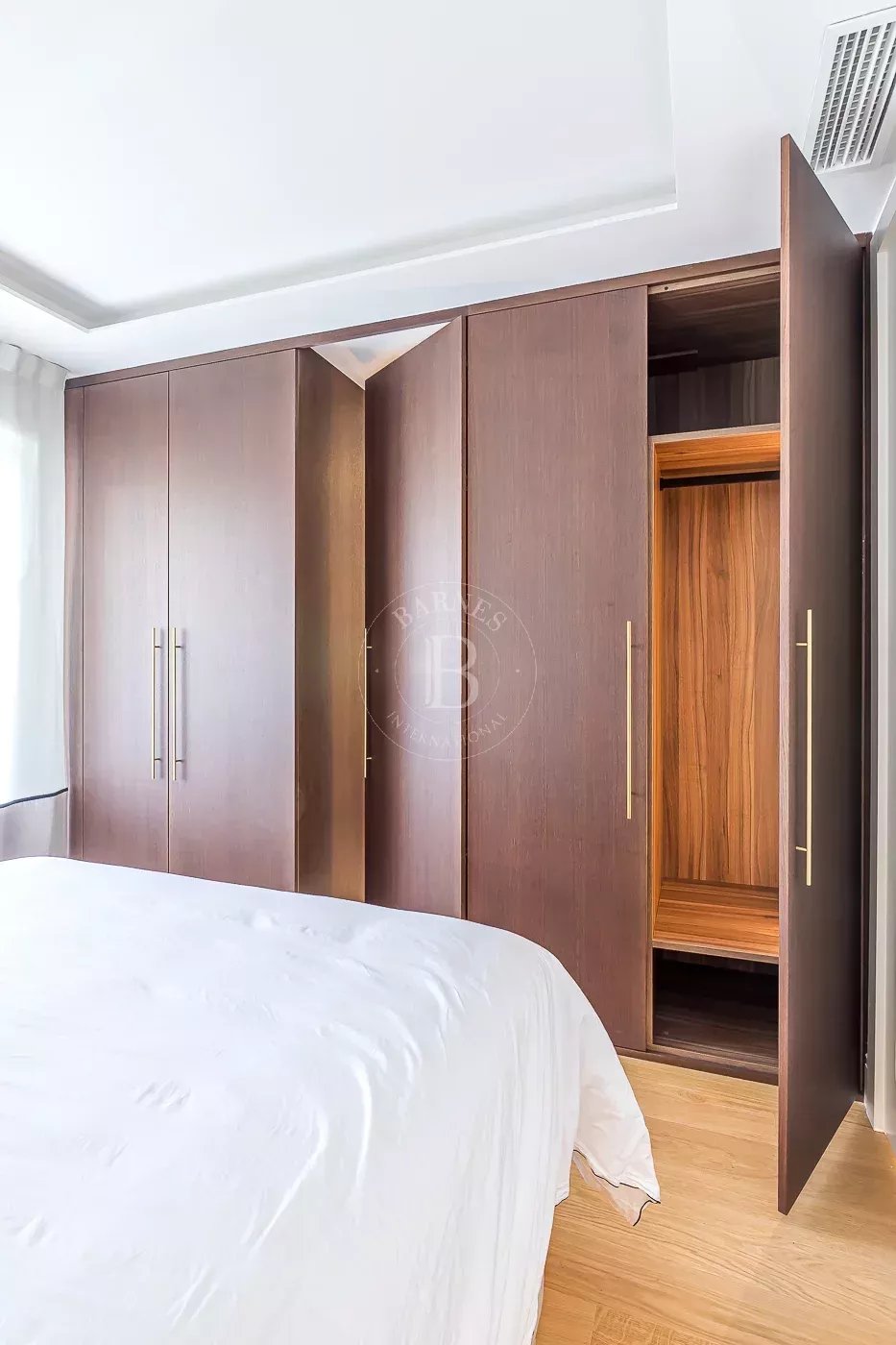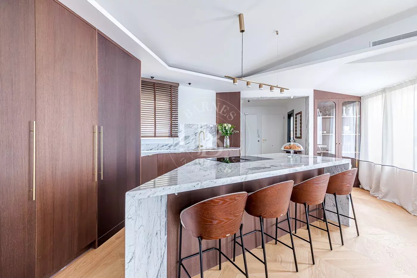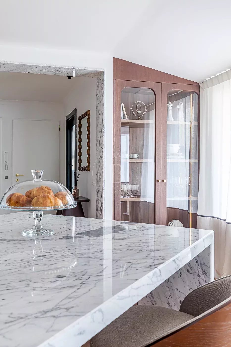 El salón, presidido por una chimenea eléctrica integrada, conecta con una cocina de diseño realizada en nogal y mármol de Carrara, equipada con electrodomésticos de alta gama. La vivienda incorpora un completo sistema de domótica, que permite controlar iluminación, persianas motorizadas, climatización e incluso la calefacción, garantizando el máximo confort en cada estancia.
