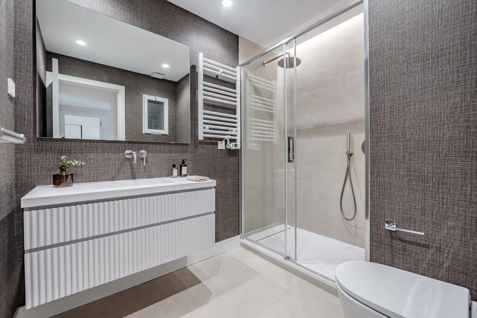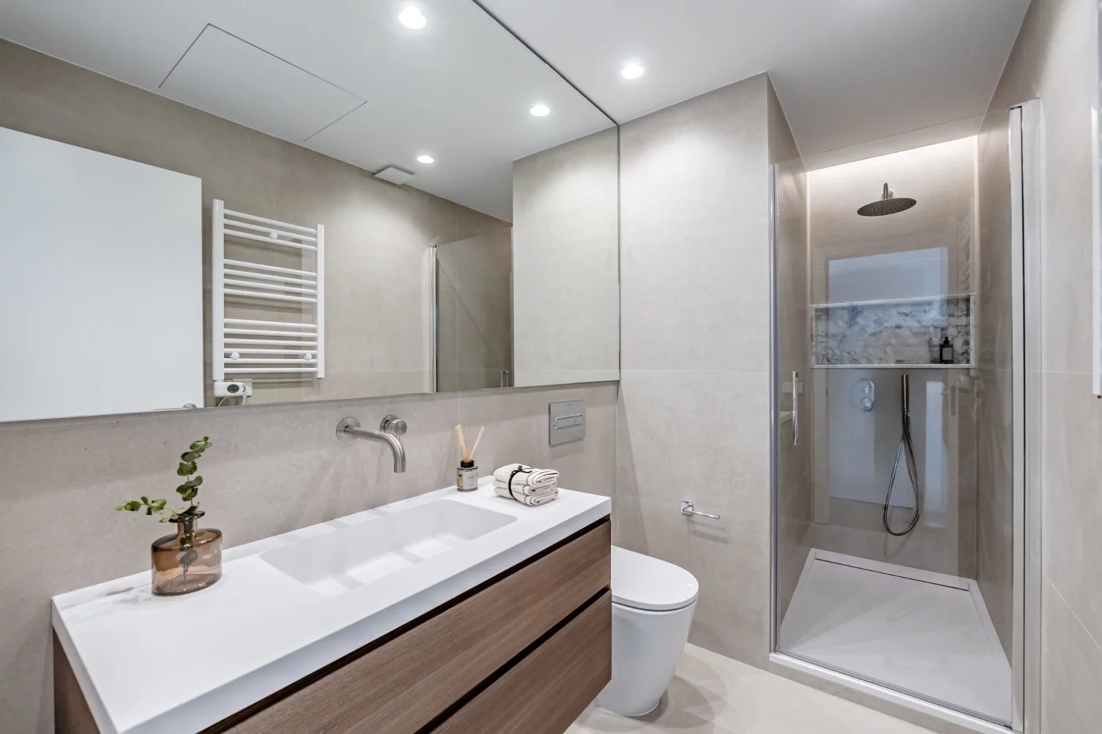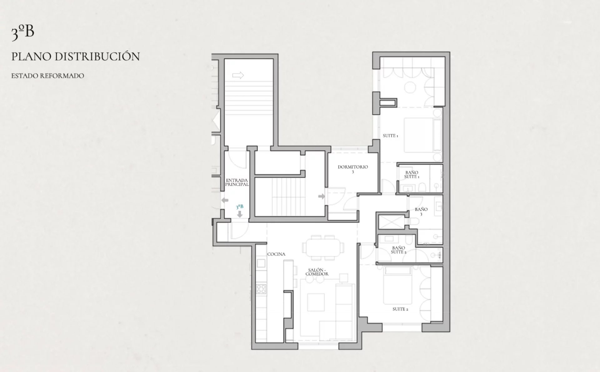 La distribución ofrece un amplio y luminoso salón-comedor con cocina abierta integrada, creando un espacio social cómodo y sofisticado. La zona de noche se compone de tres dormitorios, dos de ellos en suite con sus respectivos baños privados, además de un tercer dormitorio y un baño completo adicional que da servicio tanto a esta estancia como a invitados.
