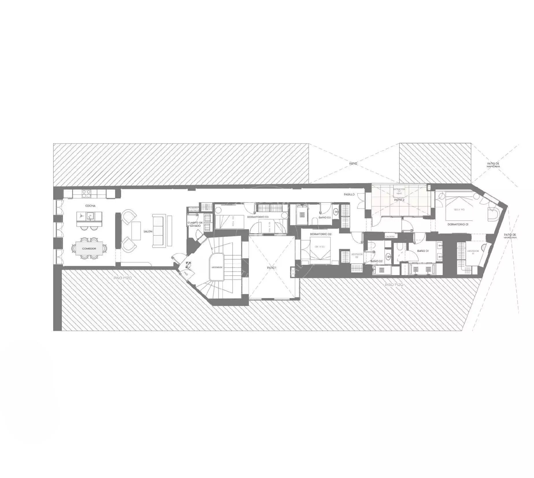 La zona de descanso se compone de tres dormitorios con armarios empotrados. El dormitorio principal cuenta con baño en suite, al igual que un segundo dormitorio doble; el tercer dormitorio dispone de un baño completo independiente. La vivienda incluye además un práctico cuarto de lavado y un espacioso patio interior que aporta ventilación y luminosidad a las estancias interiores.