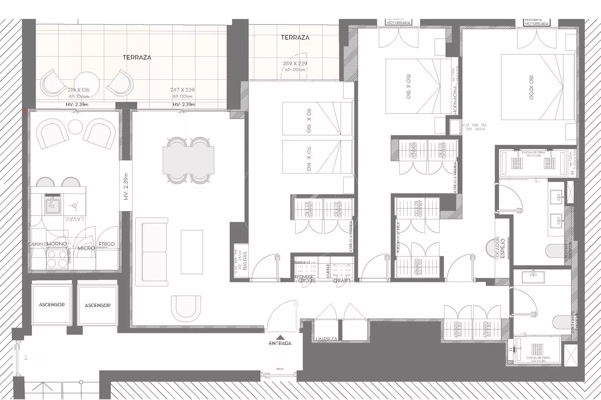 La zona de día se articula en torno a un amplio salón-comedor con salida directa a la elegante terraza, conectada a su vez con la cocina equipada, creando un espacio ideal para el día a día y para el disfrute social.