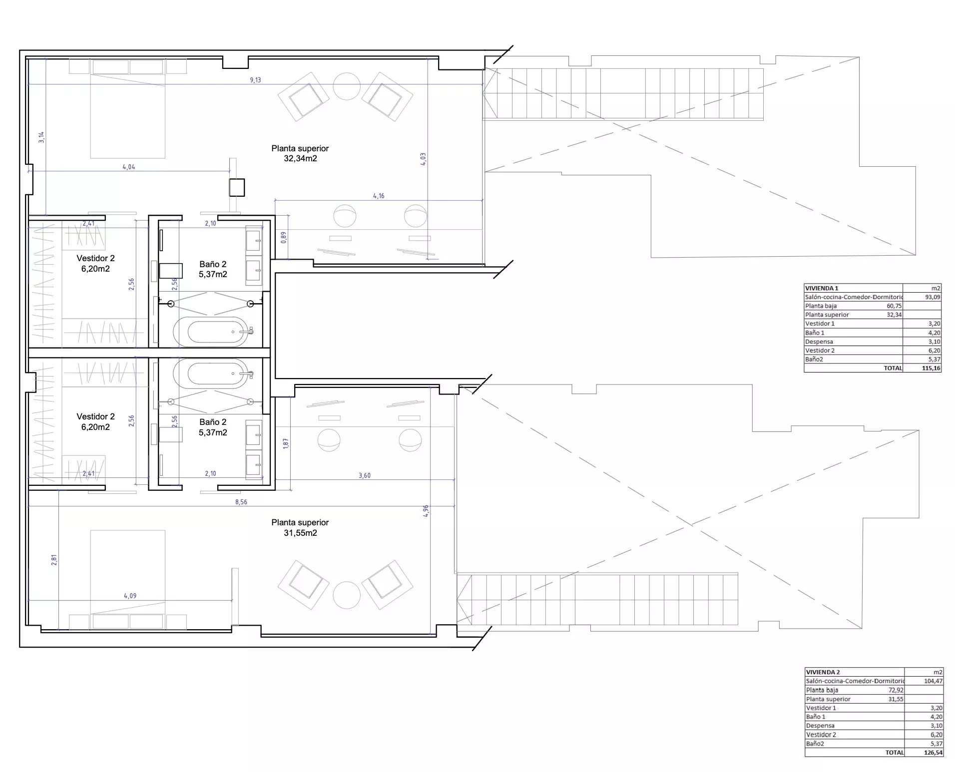 En la planta superior se sitúa un espacio versátil que incluye una práctica despensa, así como el segundo dormitorio, también con vestidor y baño propio. Esta distribución permite diferenciar claramente las áreas de descanso y aportar mayor funcionalidad a la vivienda.