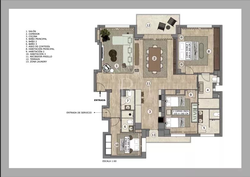 La propiedad dispone de tres dormitorios, todos con baño en suite, más un cuarto baño adicional. El salón-comedor, amplio y acogedor, conecta con la terraza, y la cocina, totalmente equipada, ha sido diseñada con materiales de alta calidad. La vivienda se entrega lista para entrar a vivir. El edificio cuenta con portero, lo que aporta comodidad y seguridad.