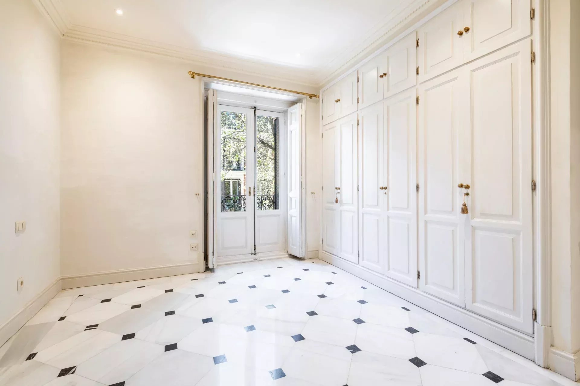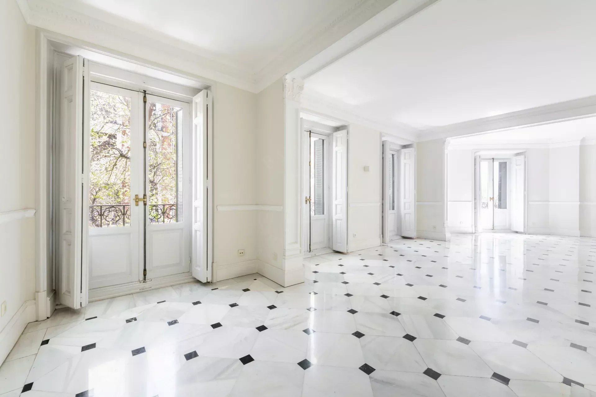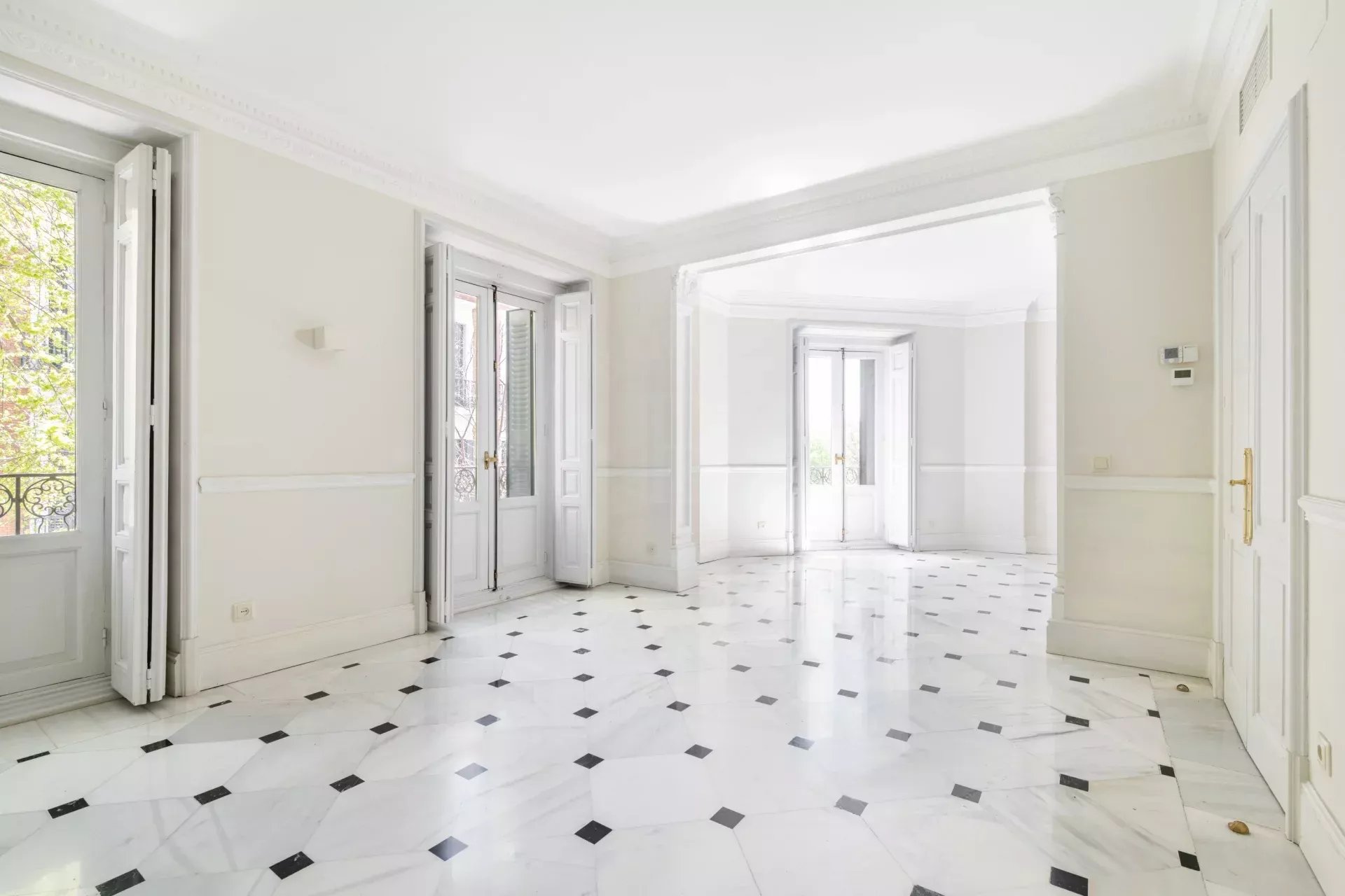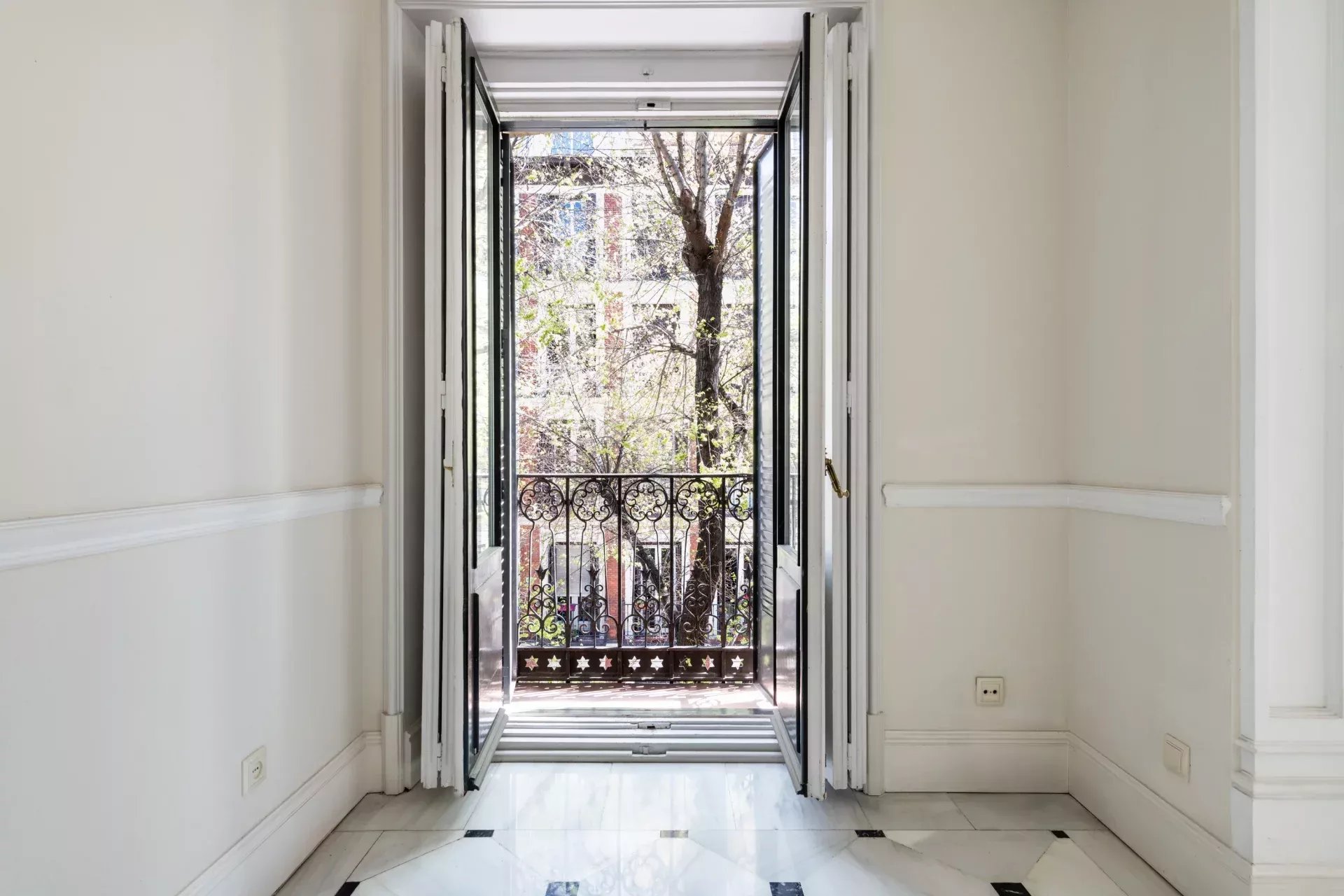 La propiedad destaca especialmente por su imponente fachada exterior, con cinco balcones a la calle en el salón principal que enmarcan unas vistas completamente despejadas hacia el Retiro, aportando una conexión directa con uno de los enclaves más emblemáticos de Madrid. Esta condición exterior se extiende a toda la vivienda, ya que cada uno de los dormitorios cuenta también con salida o ventana a fachada, garantizando luz natural, ventilación cruzada y una calidad espacial superior en todas las estancias.