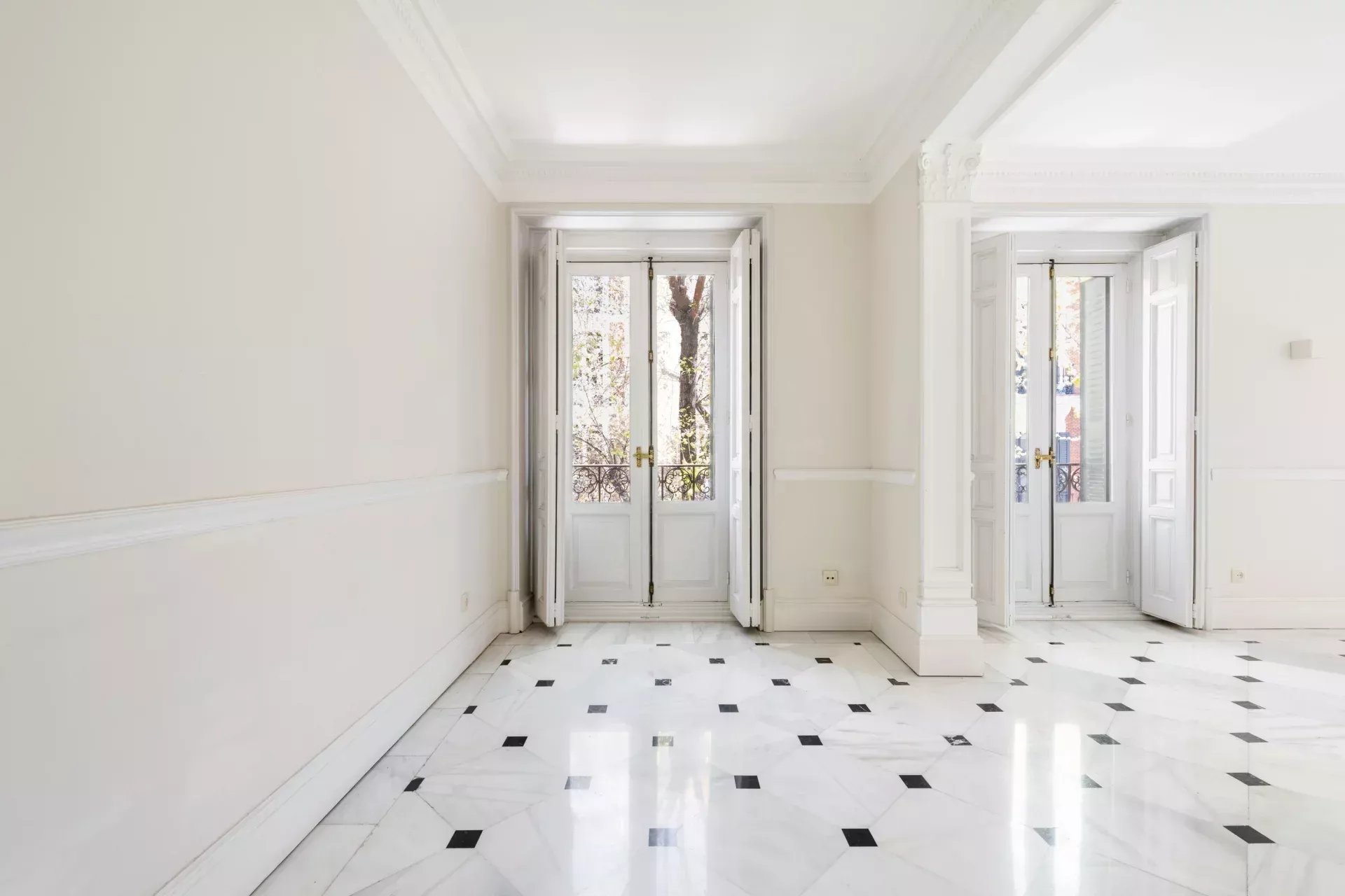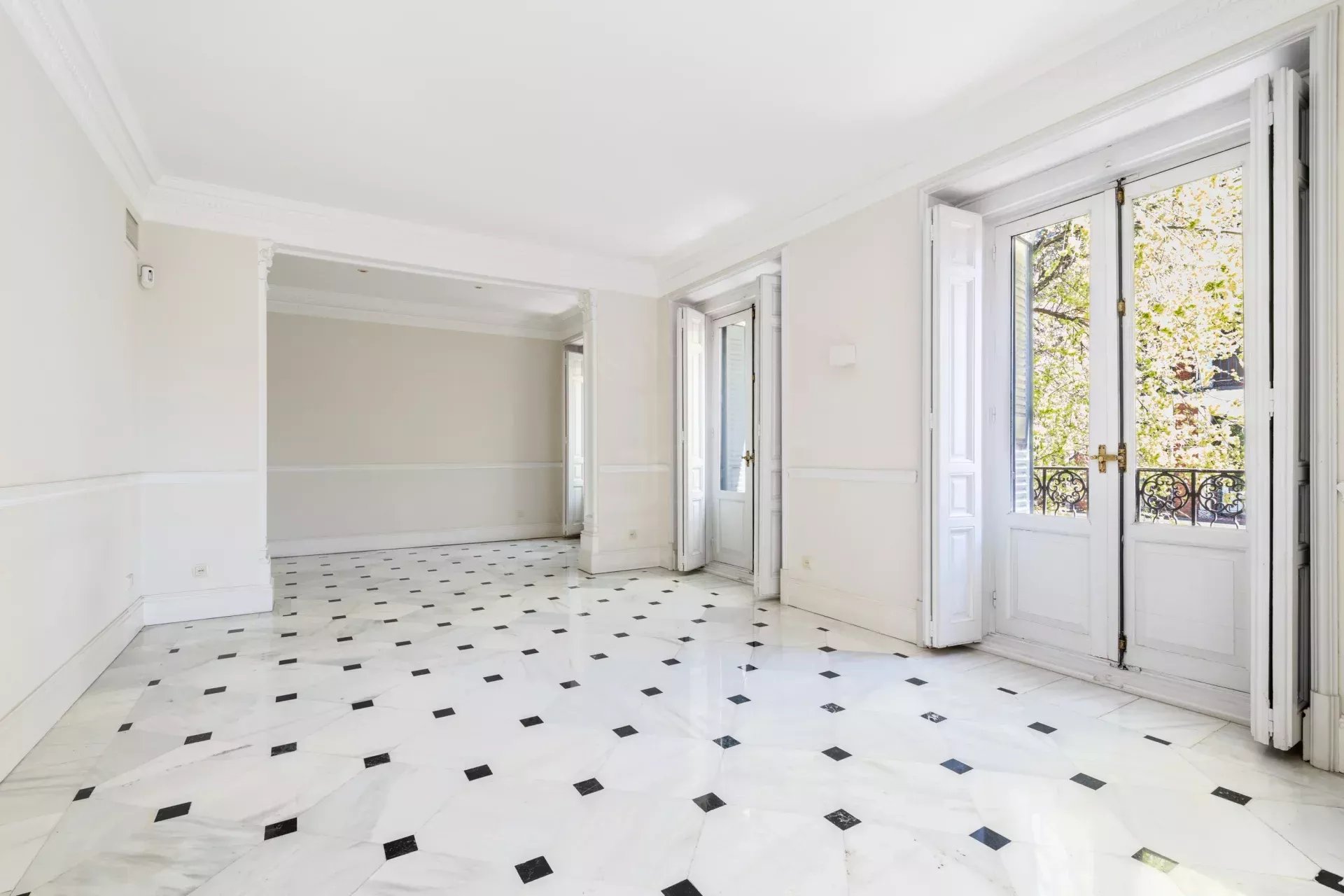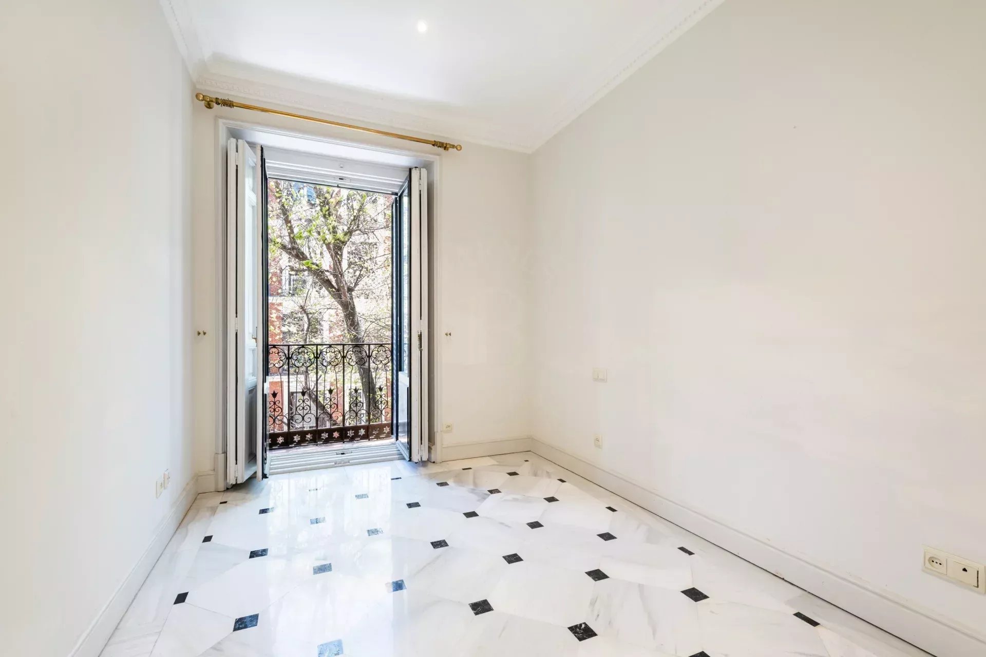 La propiedad destaca especialmente por su imponente fachada exterior, con cinco balcones a la calle en el salón principal que enmarcan unas vistas completamente despejadas hacia el Retiro, aportando una conexión directa con uno de los enclaves más emblemáticos de Madrid. Esta condición exterior se extiende a toda la vivienda, ya que cada uno de los dormitorios cuenta también con salida o ventana a fachada, garantizando luz natural, ventilación cruzada y una calidad espacial superior en todas las estancias.