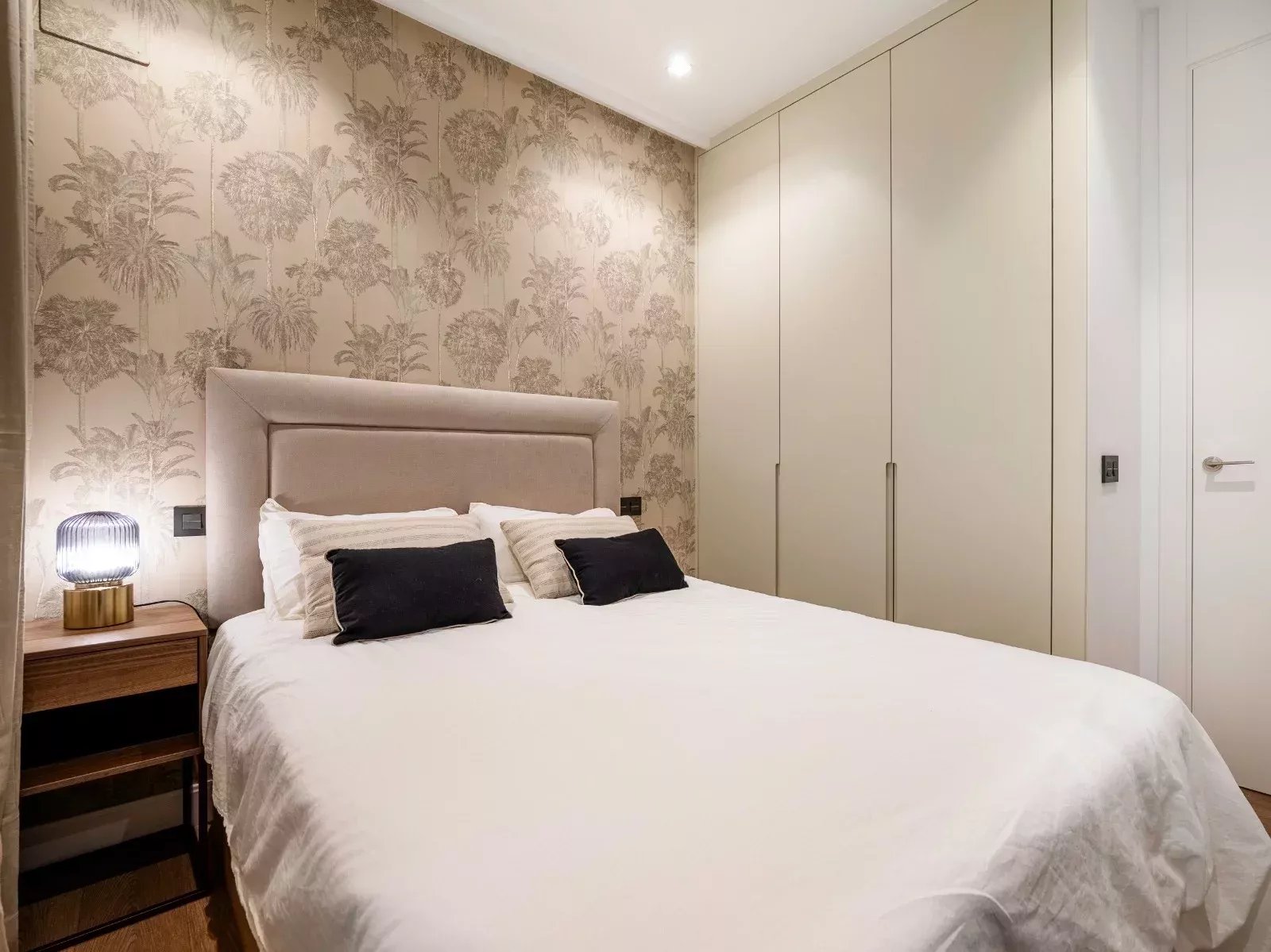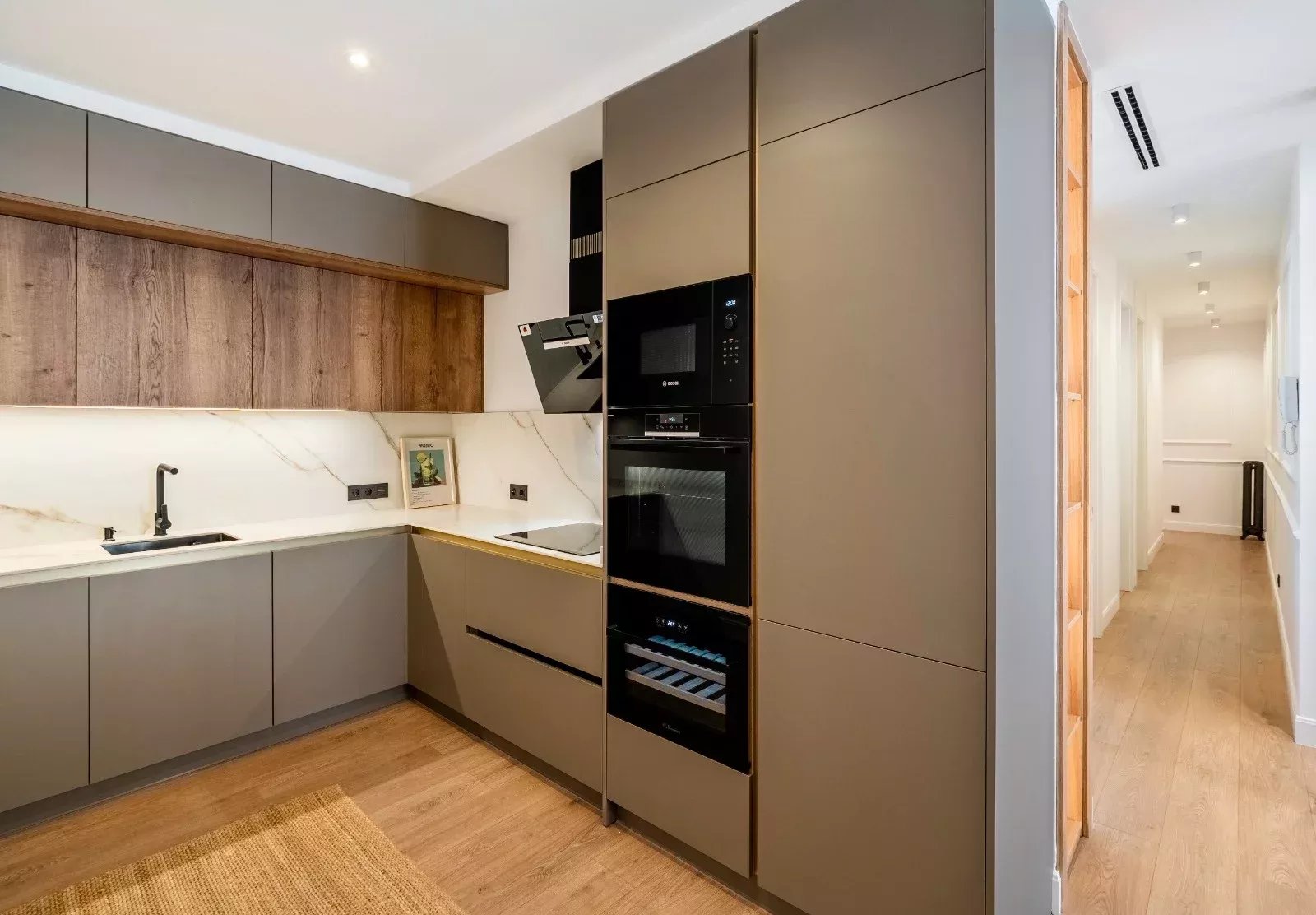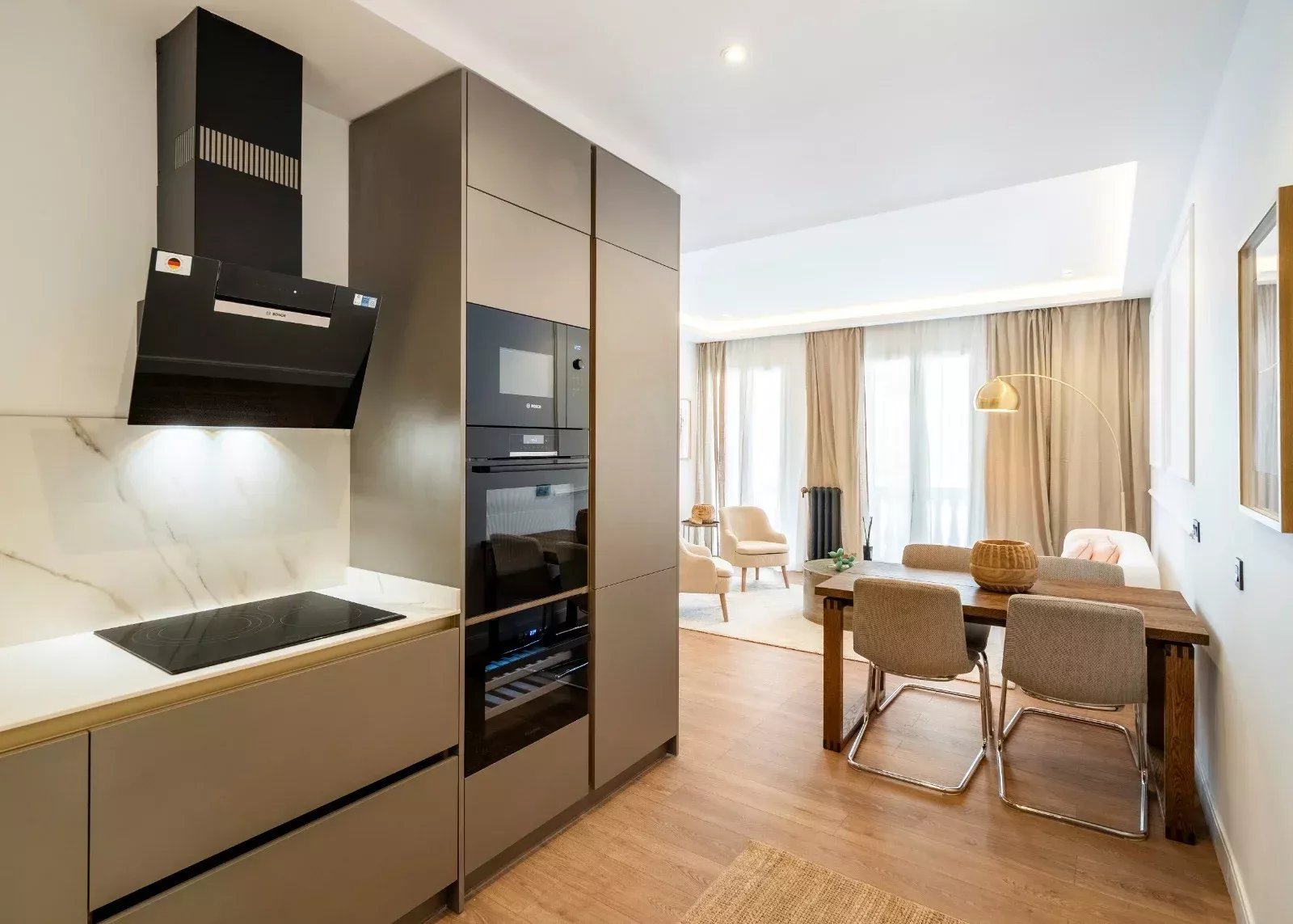 El lujoso piso con techos altos y carpintería elegante ofrece un amplio salón-comedor lleno de luz natural gracias a sus grandes ventanales que dan a la calle. La cocina, integrada en el espacio de día, ha sido equipada con electrodomésticos de alta gama y acabados de diseño, convirtiéndose en el corazón del hogar. Un aseo de cortesía complementa la zona social. La zona privada cuenta con dos dormitorios bien distribuidos: el principal con baño en suite y armarios empotrados, y un segundo dormitorio amplio y luminoso, junto a otro baño completo.