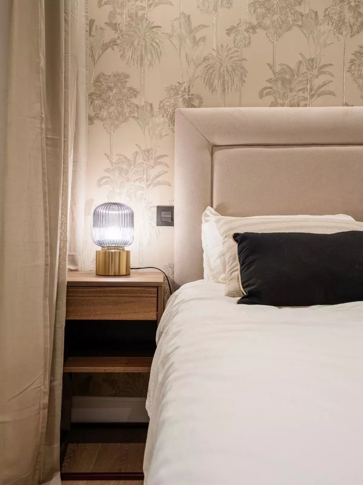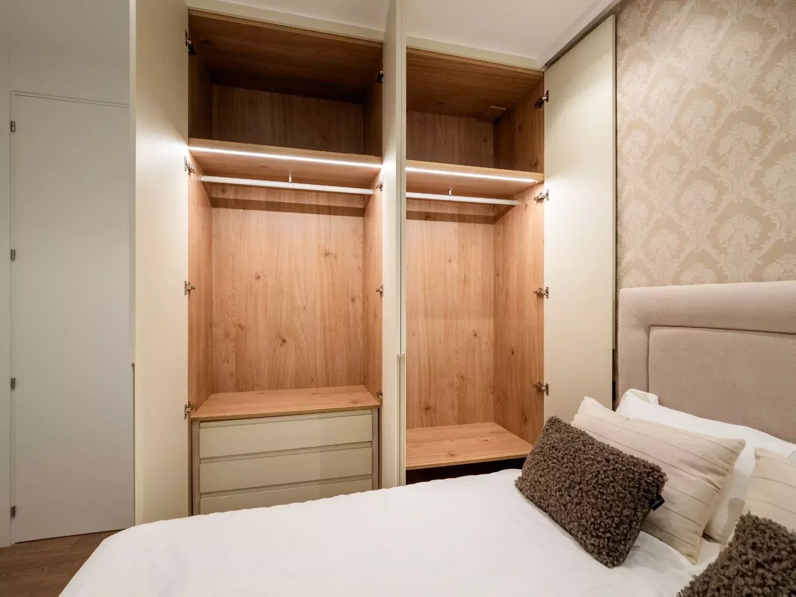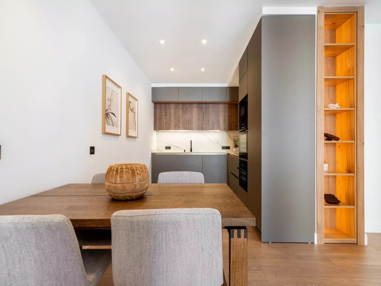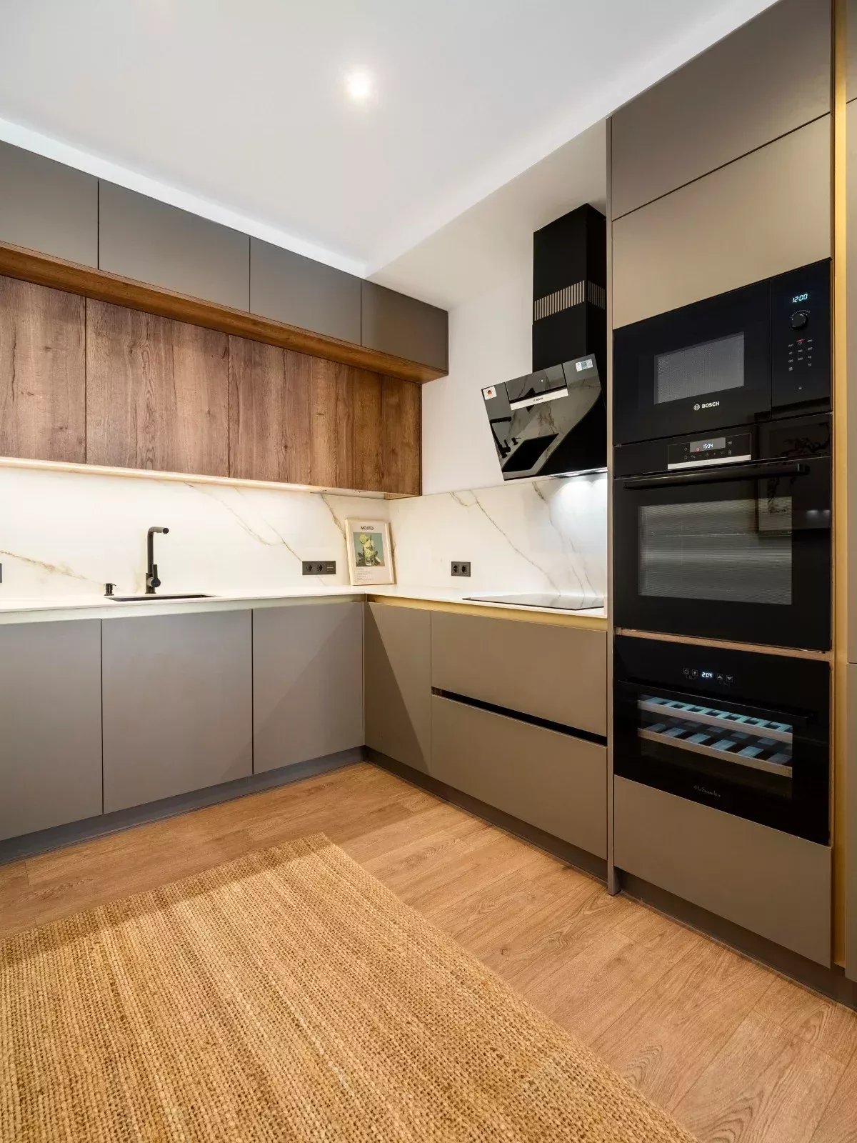 El lujoso piso con techos altos y carpintería elegante ofrece un amplio salón-comedor lleno de luz natural gracias a sus grandes ventanales que dan a la calle. La cocina, integrada en el espacio de día, ha sido equipada con electrodomésticos de alta gama y acabados de diseño, convirtiéndose en el corazón del hogar. Un aseo de cortesía complementa la zona social. La zona privada cuenta con dos dormitorios bien distribuidos: el principal con baño en suite y armarios empotrados, y un segundo dormitorio amplio y luminoso, junto a otro baño completo.