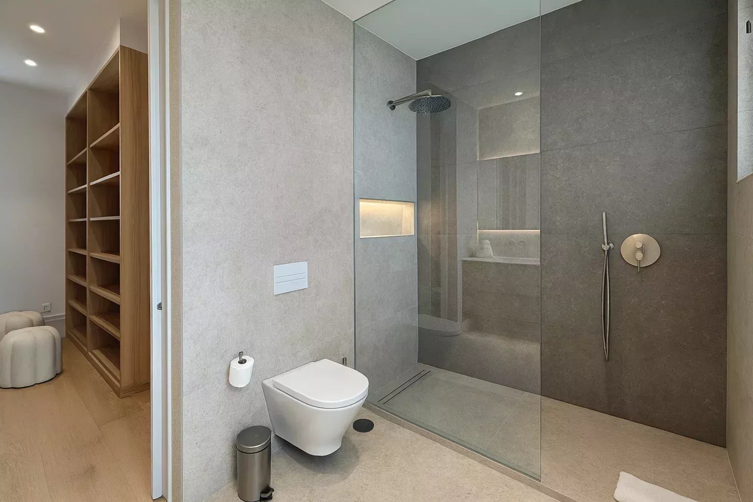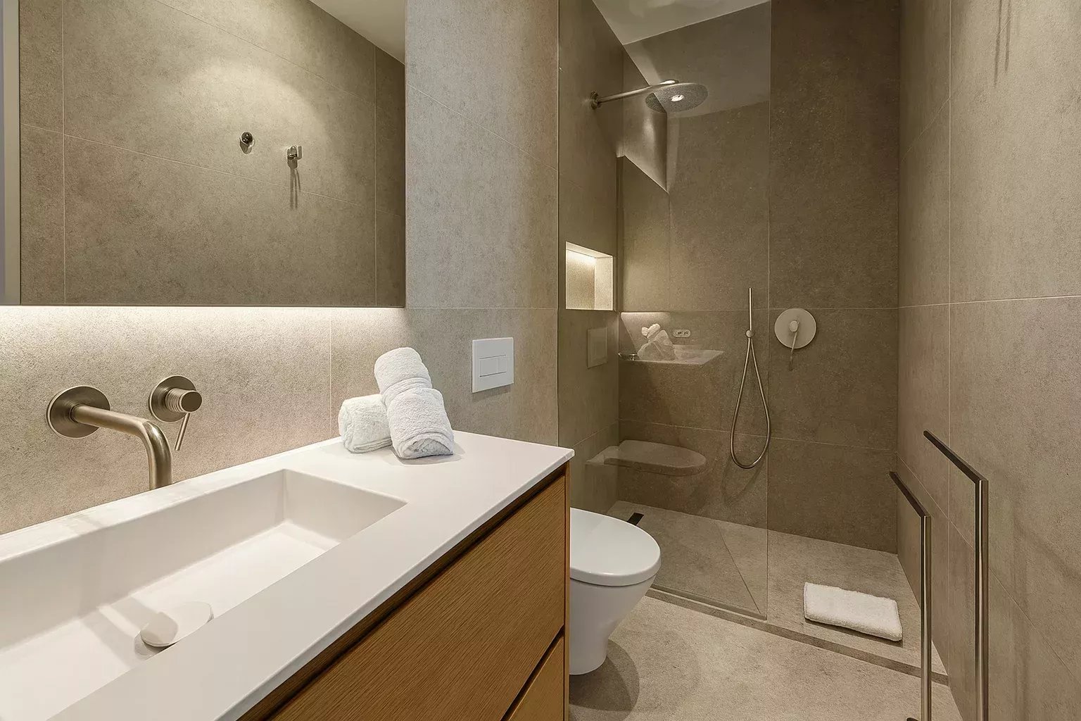 Los baños destacan por su revestimiento en porcelánico italiano, mobiliario de primeras marcas, grifería en acero mate, duchas de obra y mamparas con perfilería oculta.