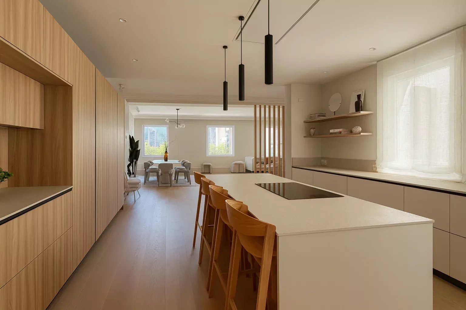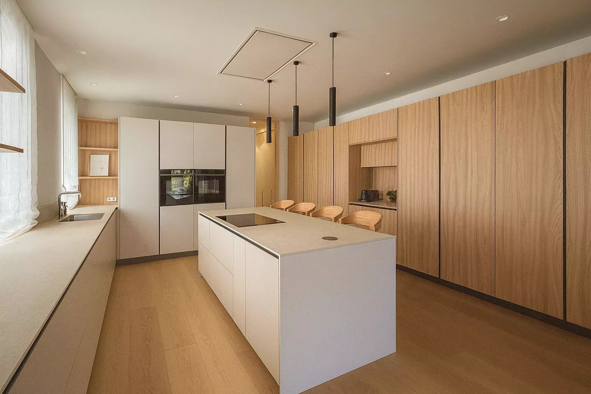 La cocina de diseño incorpora electrodomésticos de alta gama y una isla central que se convierte en el corazón del hogar.